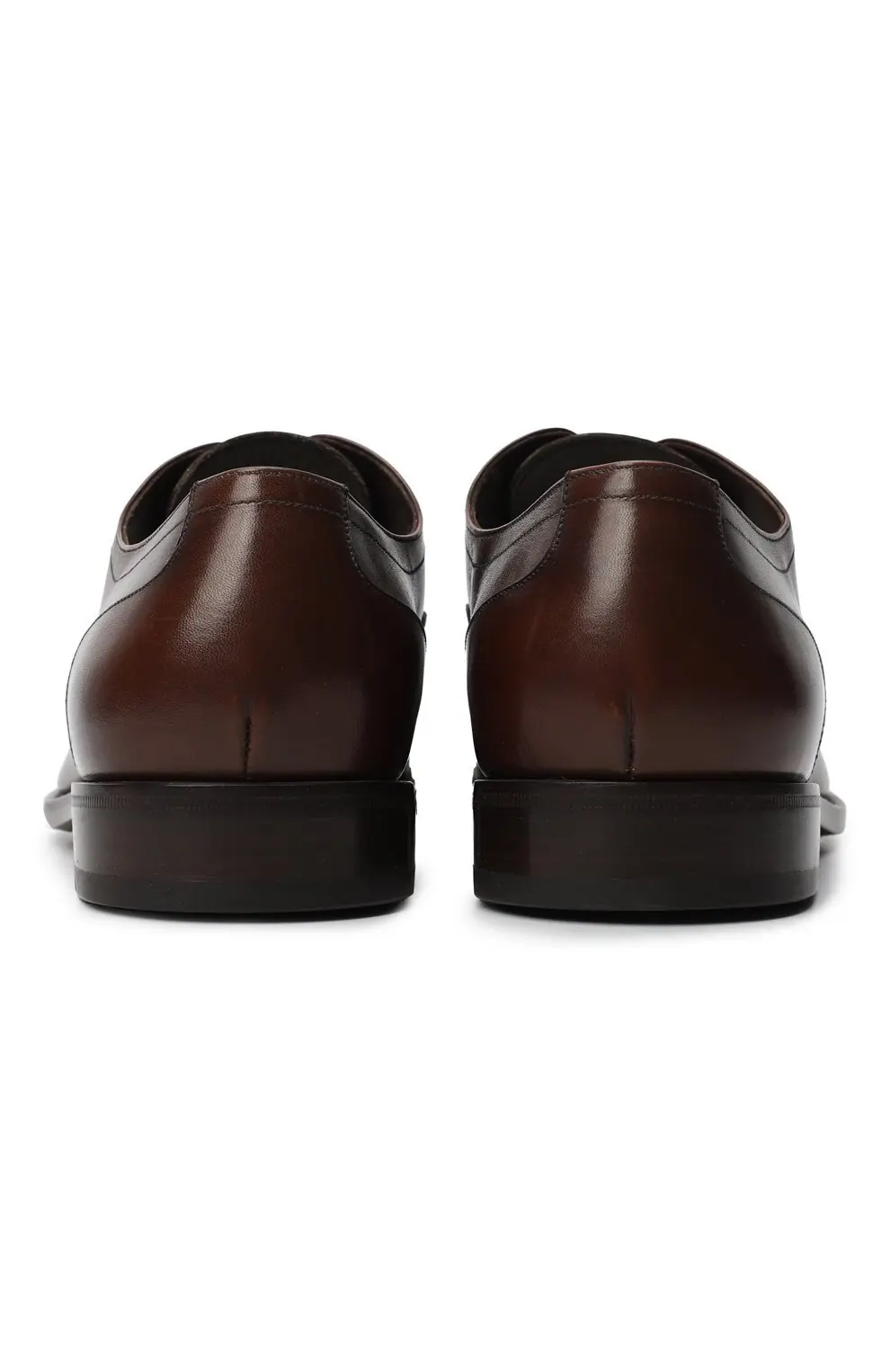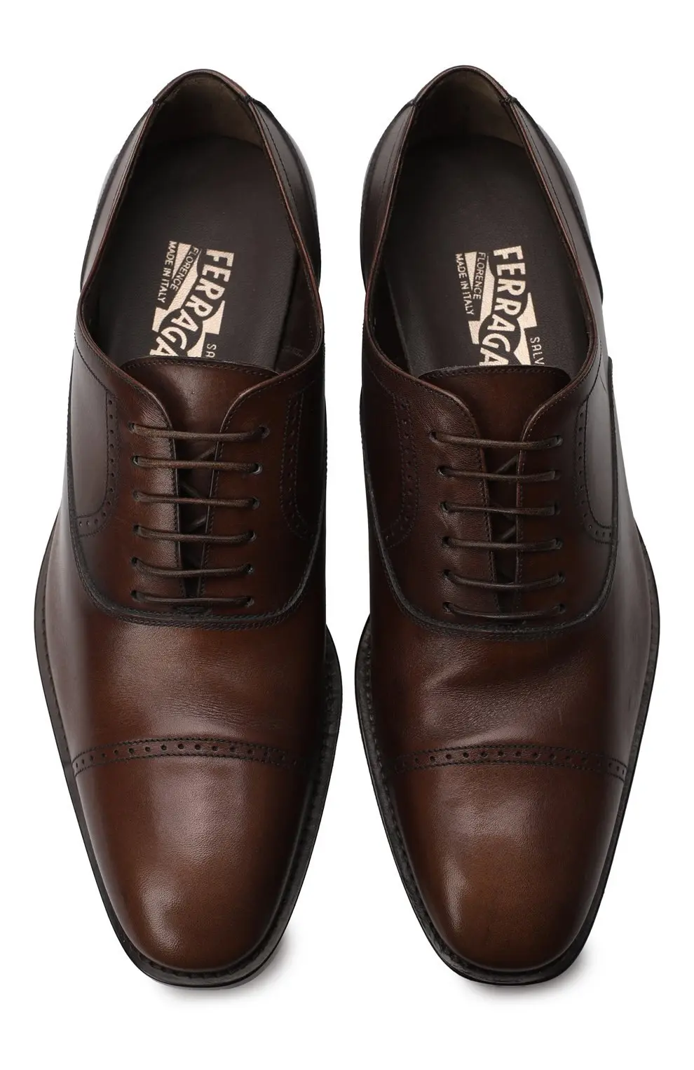 Эти классические оксфорды от Salvatore Ferragamo воплощают элегантность и сдержанный стиль итальянской обувной традиции. Выполненные из гладкой коричневой кожи высокого качества, они украшены перфорацией на мыске и швах, что придаёт модели изысканный акцент. Закрытая шнуровка подчеркивает строгость силуэта, а тонкая подошва с невысоким каблуком обеспечивает комфорт при носке и долговечность. Универсальные и утончённые, эти оксфорды идеально подойдут для деловых образов и торжественных мероприятий, добавляя безупречный штрих в мужской гардероб.
