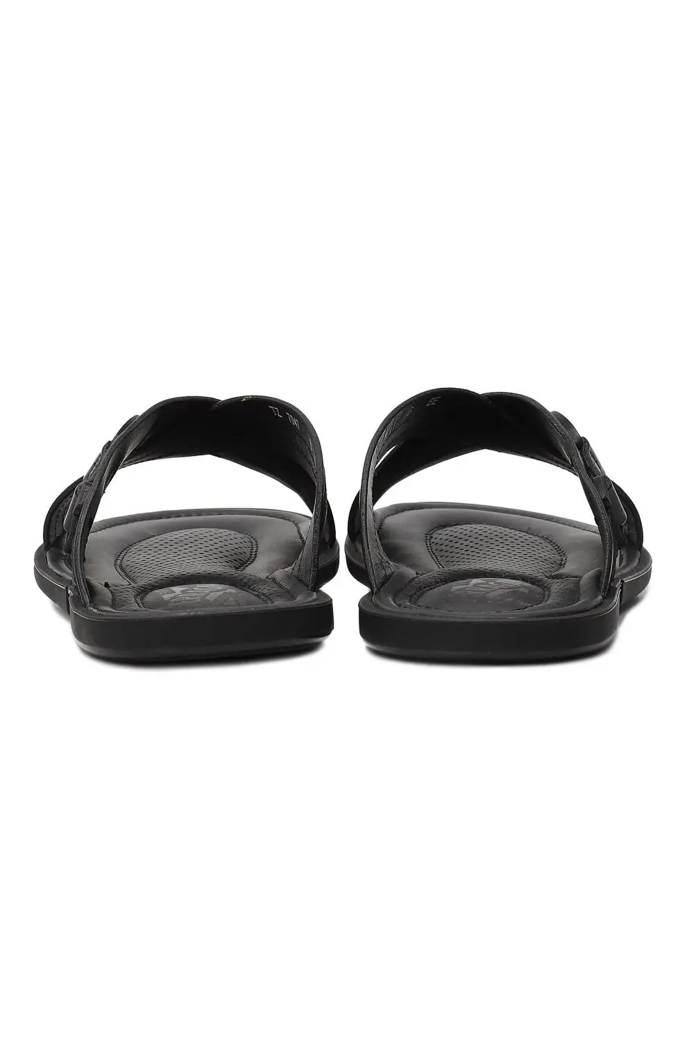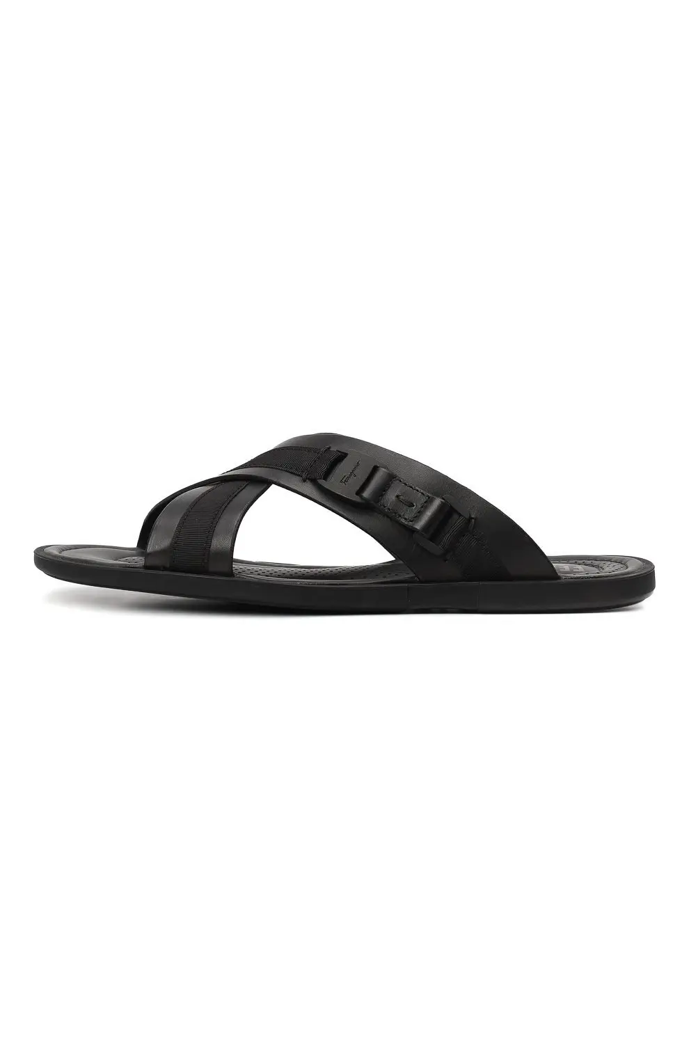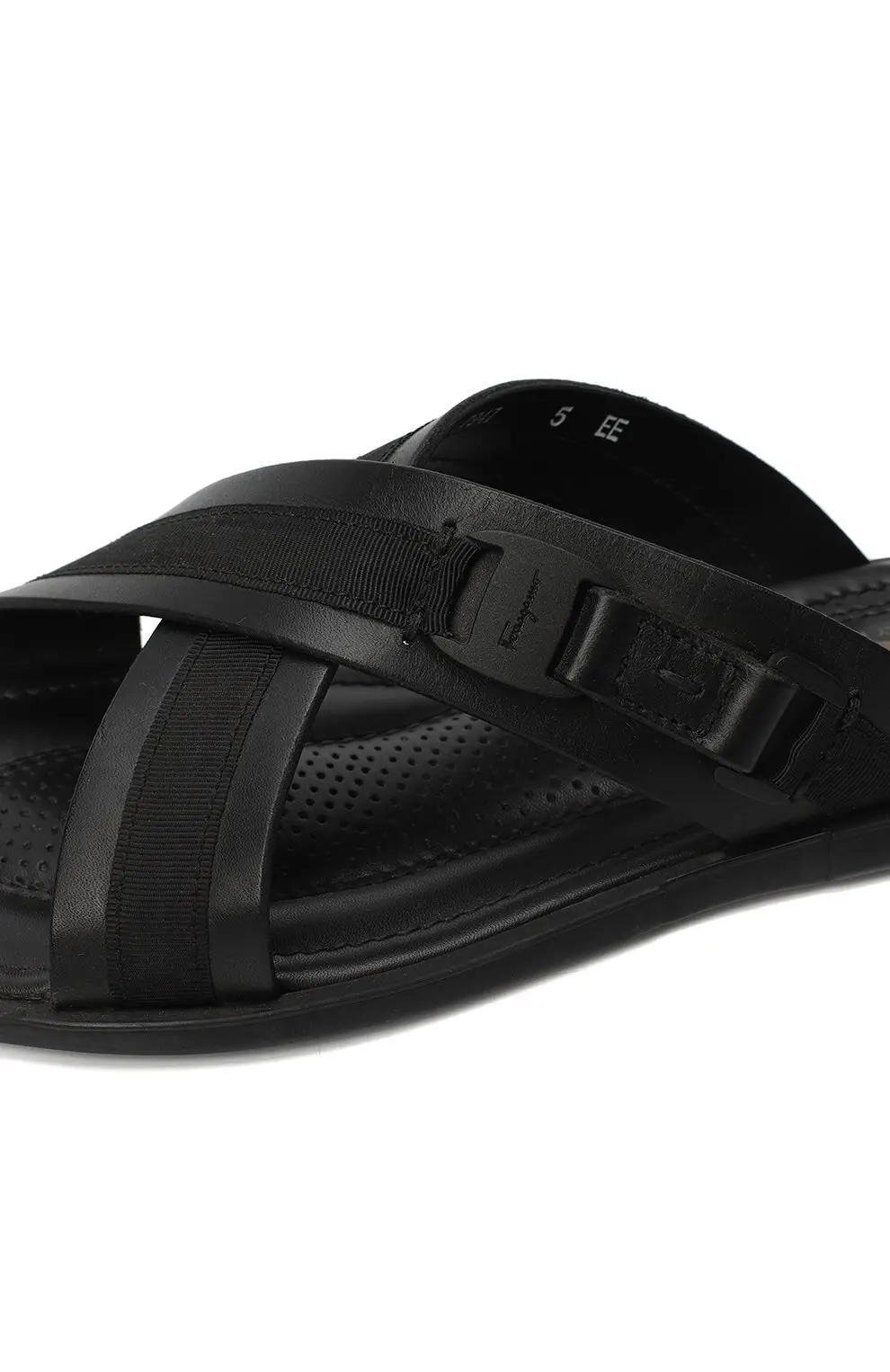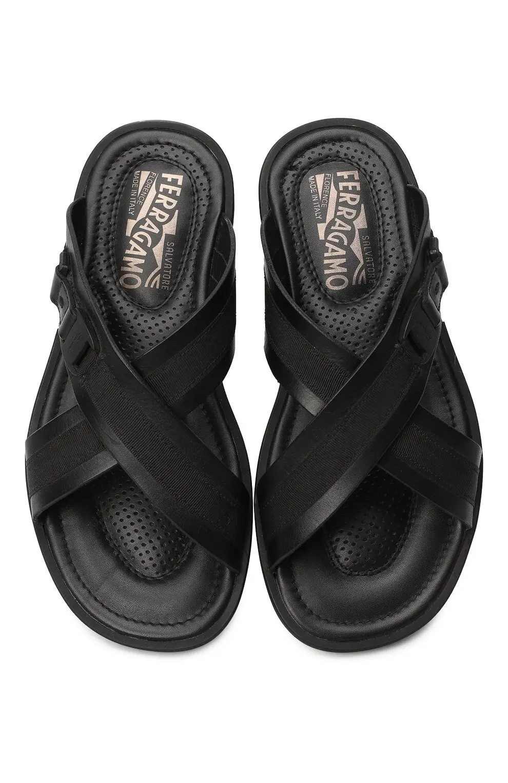 Шлепанцы Tolis Salvatore Ferragamo выполнены из гладкой чёрной кожи с перекрещивающимися ремешками. Элегантная минималистичная фурнитура с гравировкой логотипа подчёркивает характер бренда. Анатомическая стелька и лёгкая подошва обеспечивают максимальный комфорт при ходьбе. Универсальная пара, идеально подходящая как для городских образов, так и для отдыха.