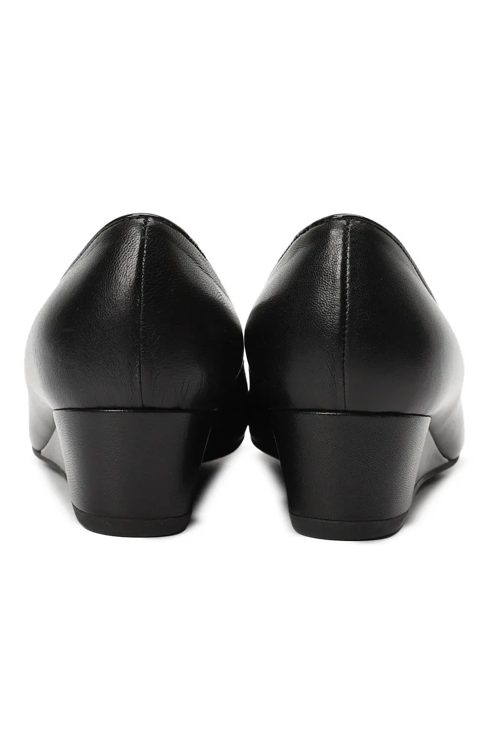 Туфли выполнены из гладкой чёрной кожи с лёгким блеском. Элегантный силуэт с округлым мыском и устойчивым каблуком подчёркивает классическую женственность модели. Безупречная отделка и лаконичные линии создают изысканный акцент в повседневном или вечернем образе.