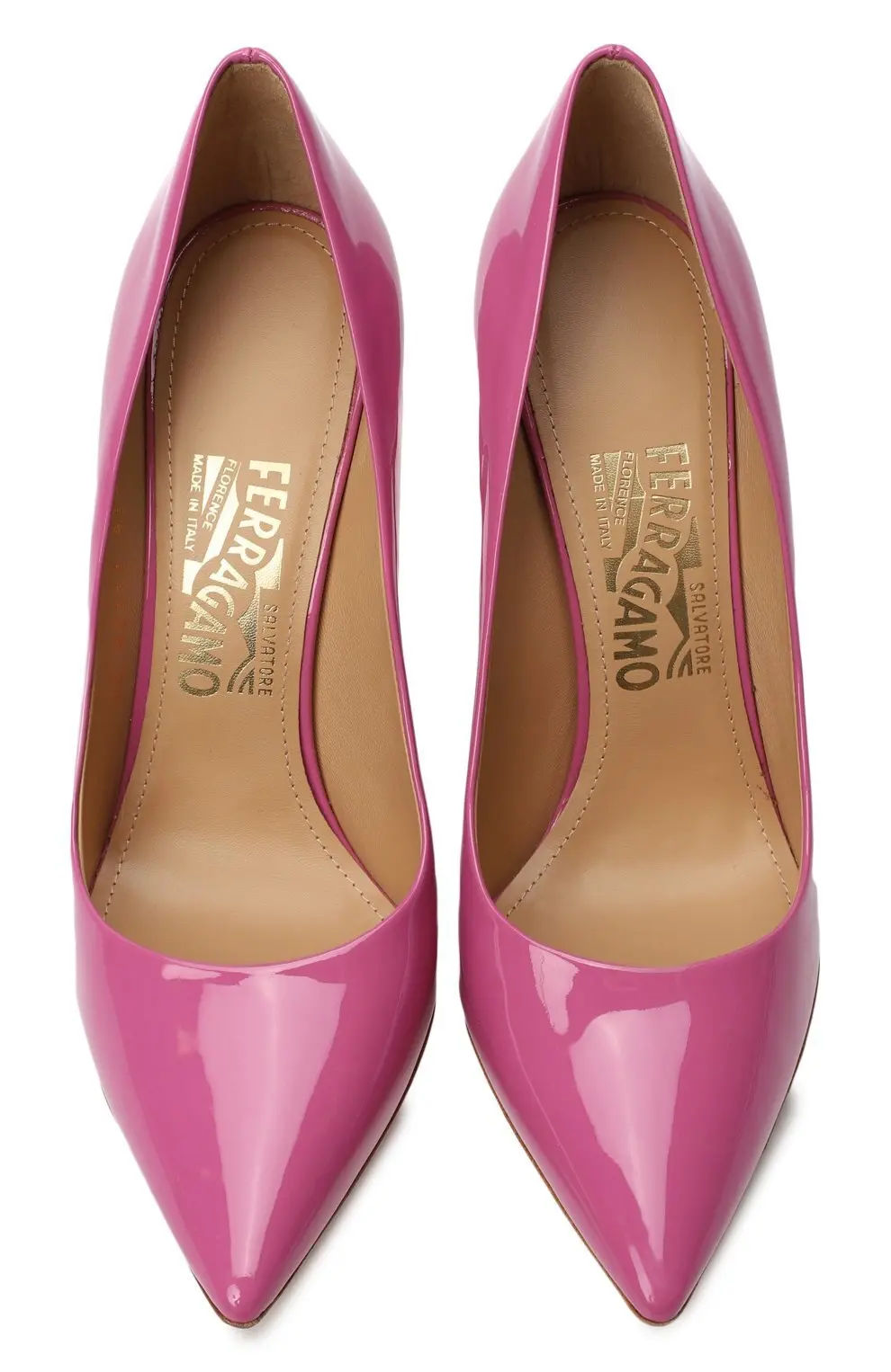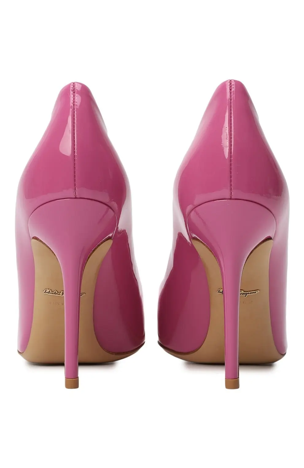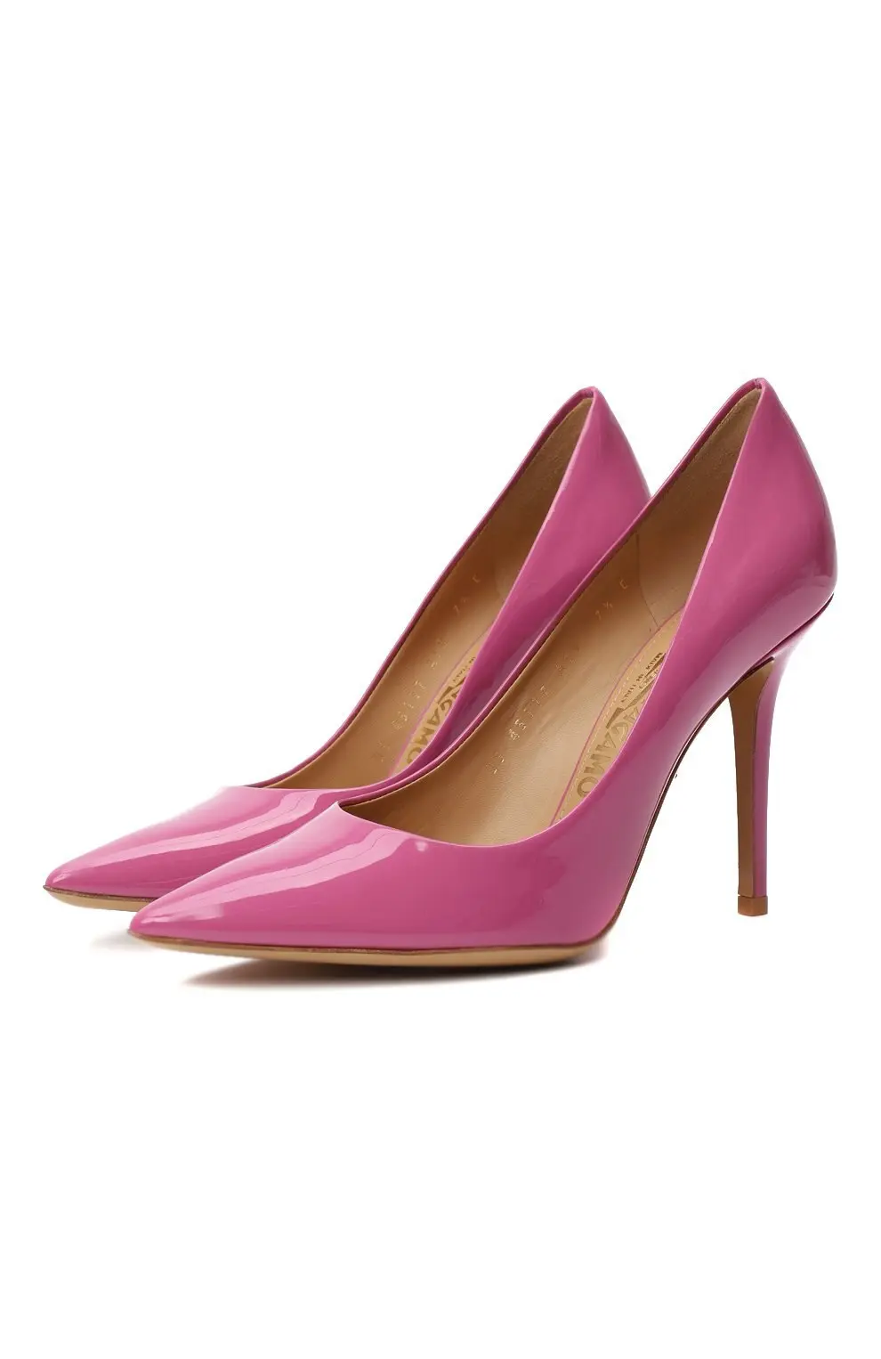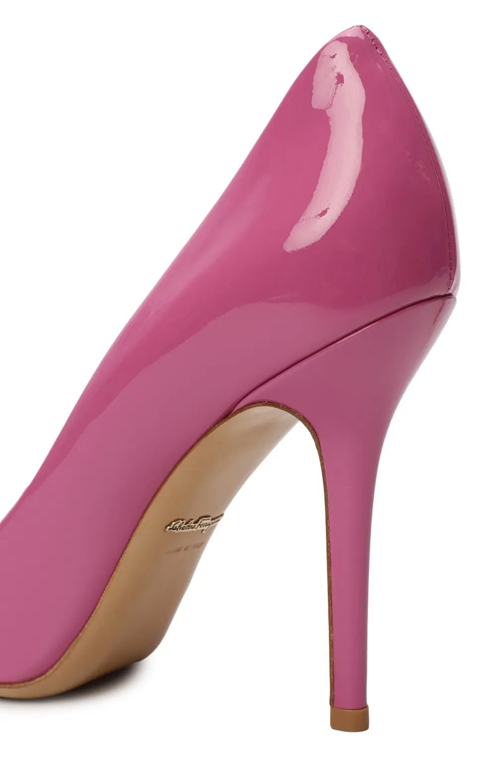 Лаковые туфли Salvatore Ferragamo насыщенного розового оттенка выполнены из гладкой кожи. Элегантный силуэт с заострённым носком и высоким каблуком создаёт женственный акцент в образе.