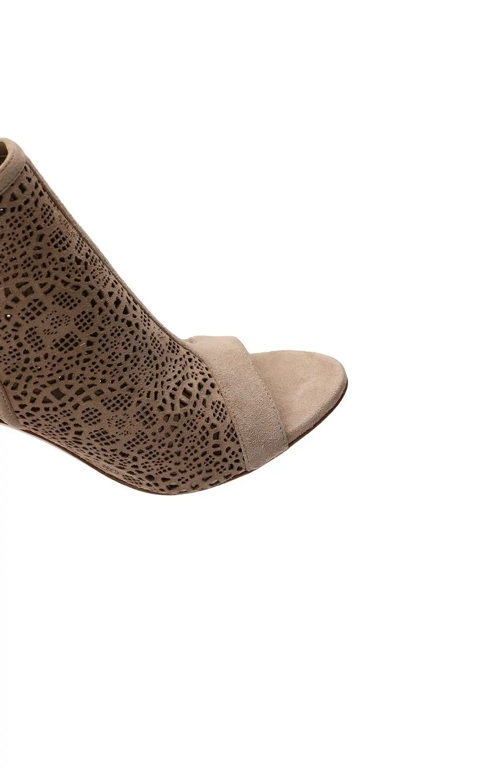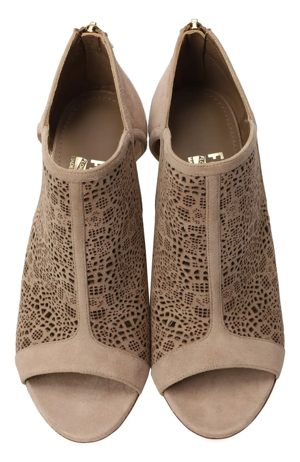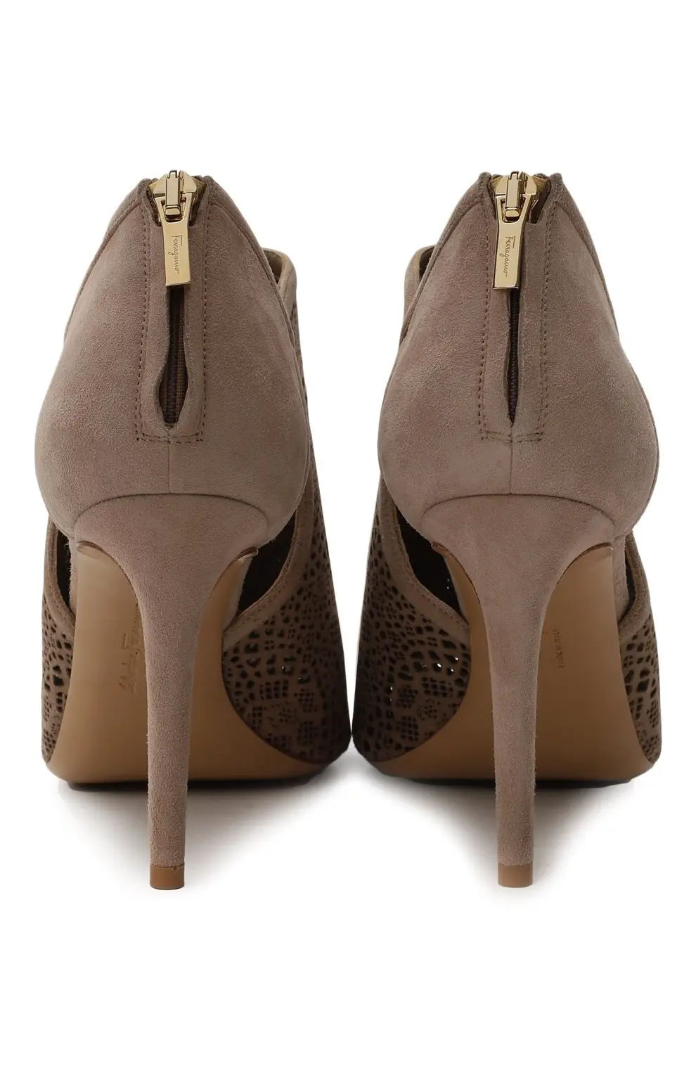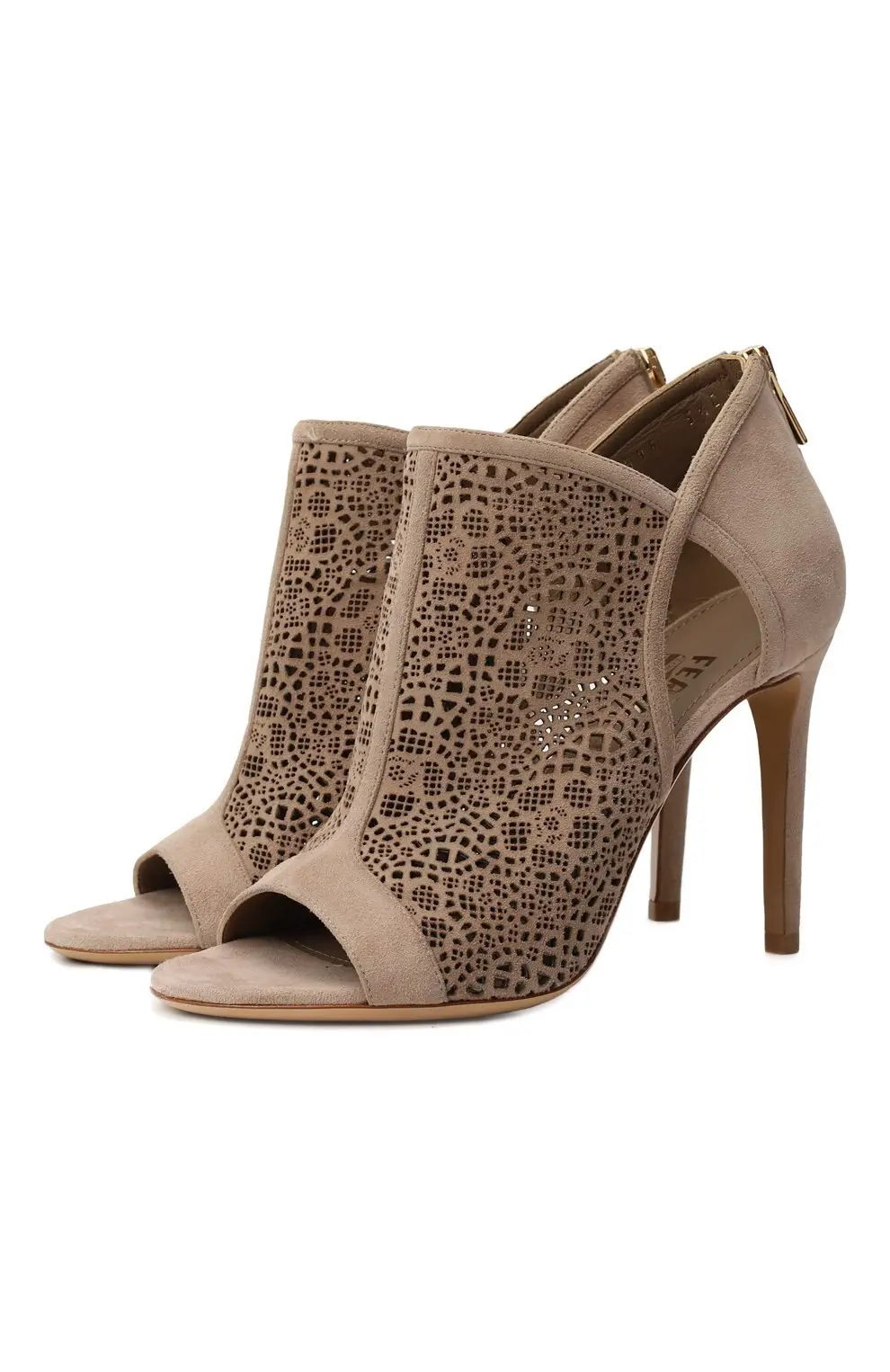 Ботильоны Salvatore Ferragamo выполнены из мягкой замши благородного бежевого оттенка. Ажурная лазерная перфорация придаёт модели утончённость и визуальную лёгкость. Открытый мыс и тонкий высокий каблук подчёркивают женственность силуэта, а застёжка-молния на пятке обеспечивает удобство посадки. Элегантная пара для вечерних и городских образов.