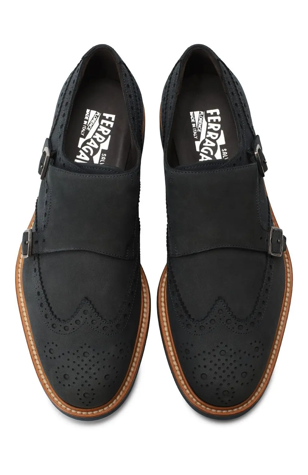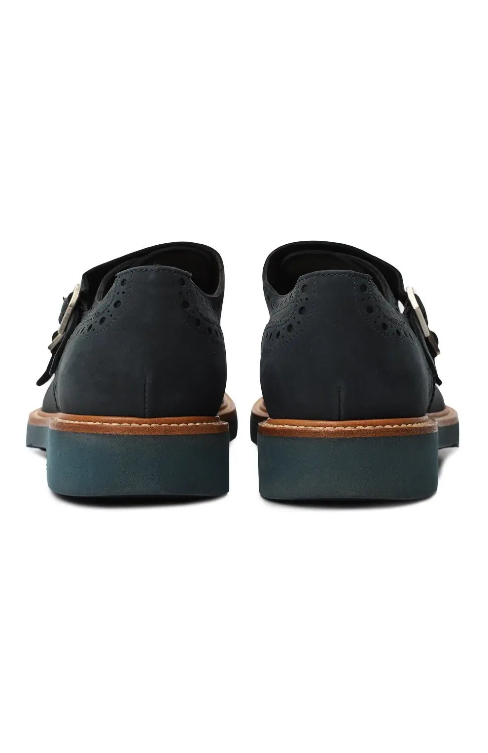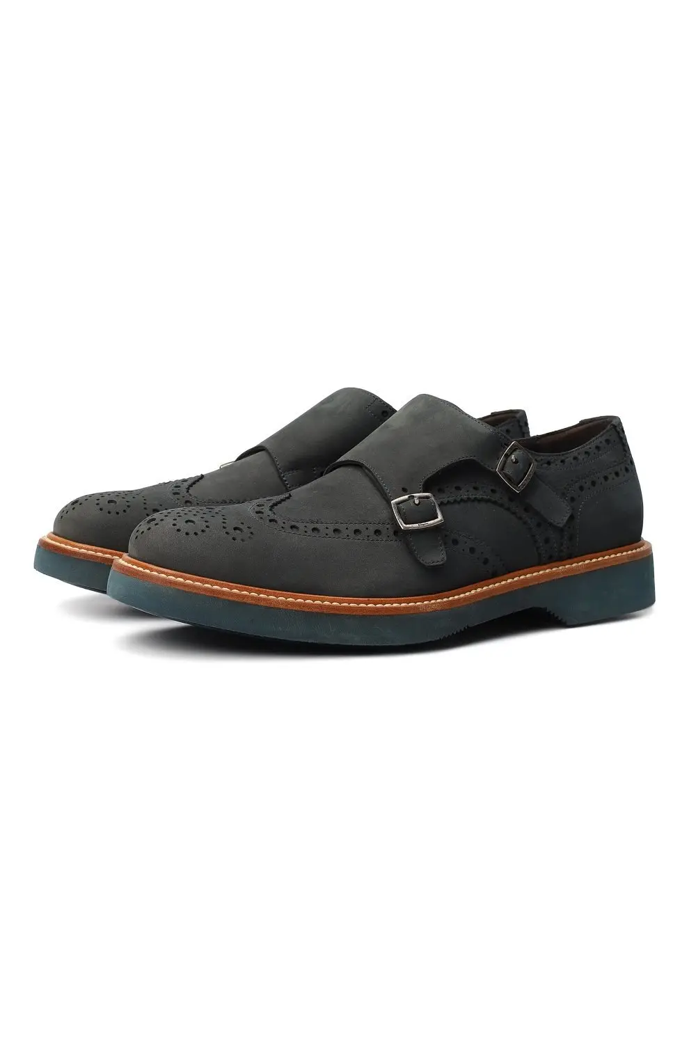 Эти монки от Salvatore Ferragamo выполнены из матовой замши глубокого серого оттенка и отличаются оригинальным дизайном с декоративной перфорацией в стиле брогов. Двойные металлические пряжки подчеркивают изысканность модели, а контрастная прошивка и коричневый кант по подошве придают обуви выразительность. Толстая резиновая подошва с синим акцентом обеспечивает современный характер и комфорт в носке.
