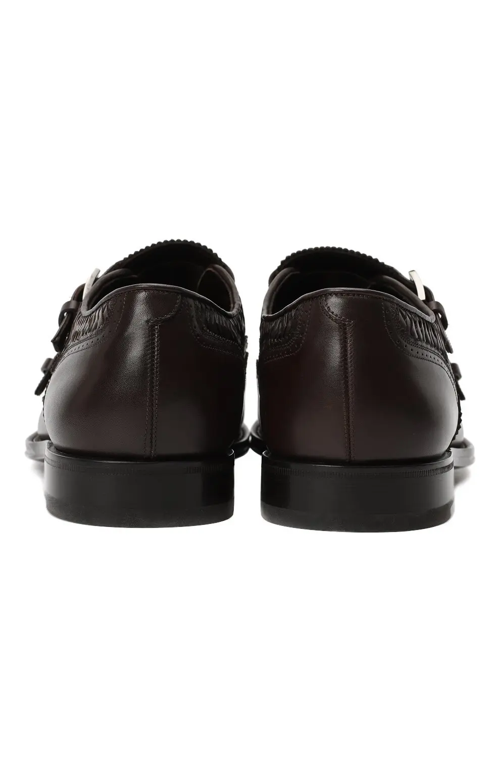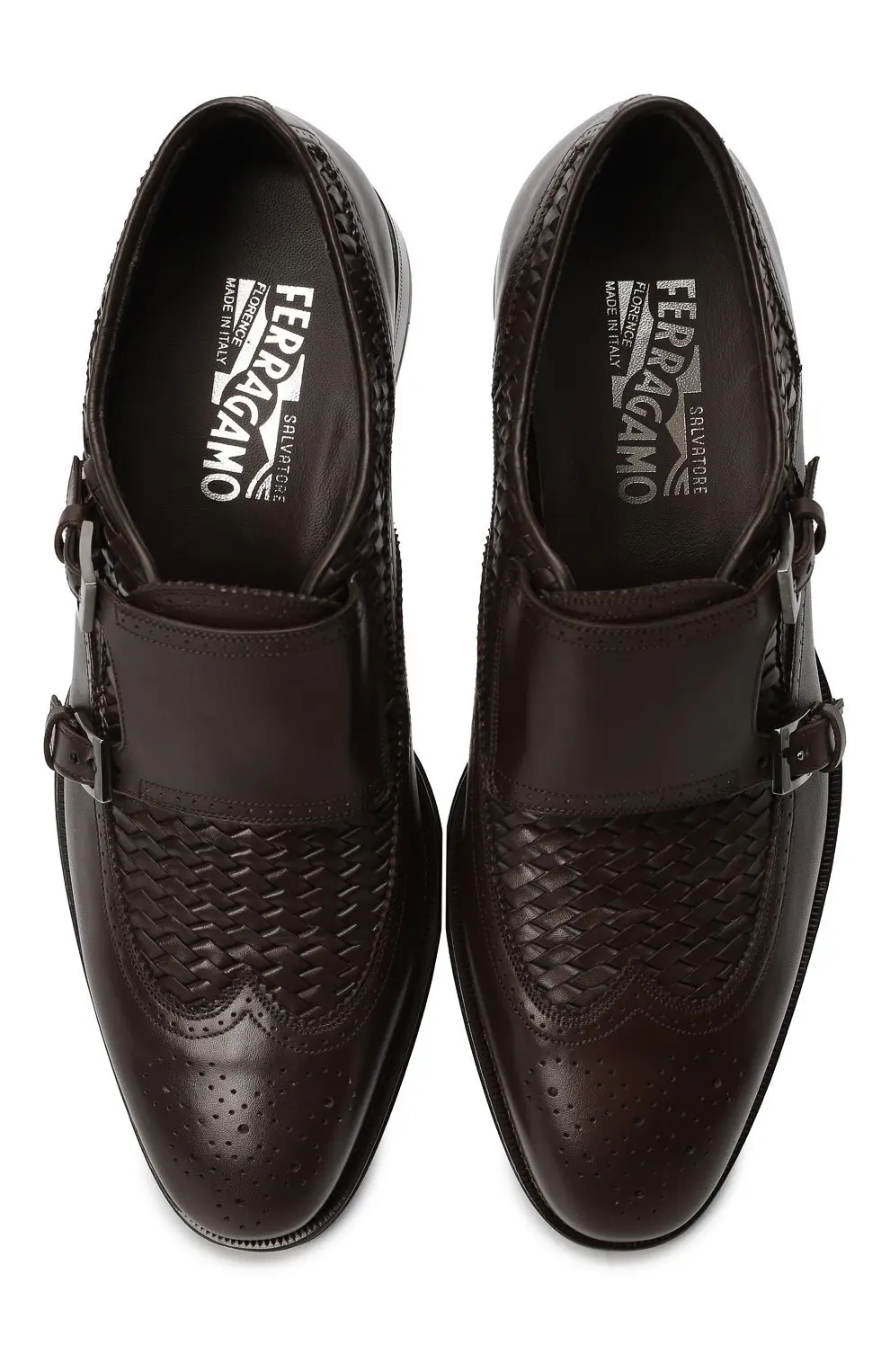 Изысканные монки от Salvatore Ferragamo выполнены из высококачественной кожи глубокого коричневого оттенка и поражают вниманием к деталям. Двойные пряжки в классическом стиле подчеркивают элегантность модели, а плетёные кожаные вставки на союзке придают обуви оригинальный характер и благородный акцент. Ажурная перфорация на мысе добавляет лёгкости дизайну и подчеркивает мастерство итальянских ремесленников. Удобная колодка и прочная кожаная подошва обеспечивают комфорт при носке.