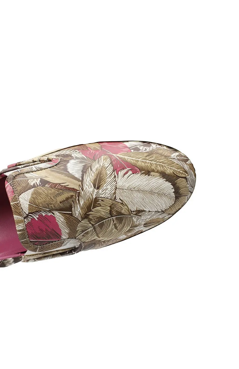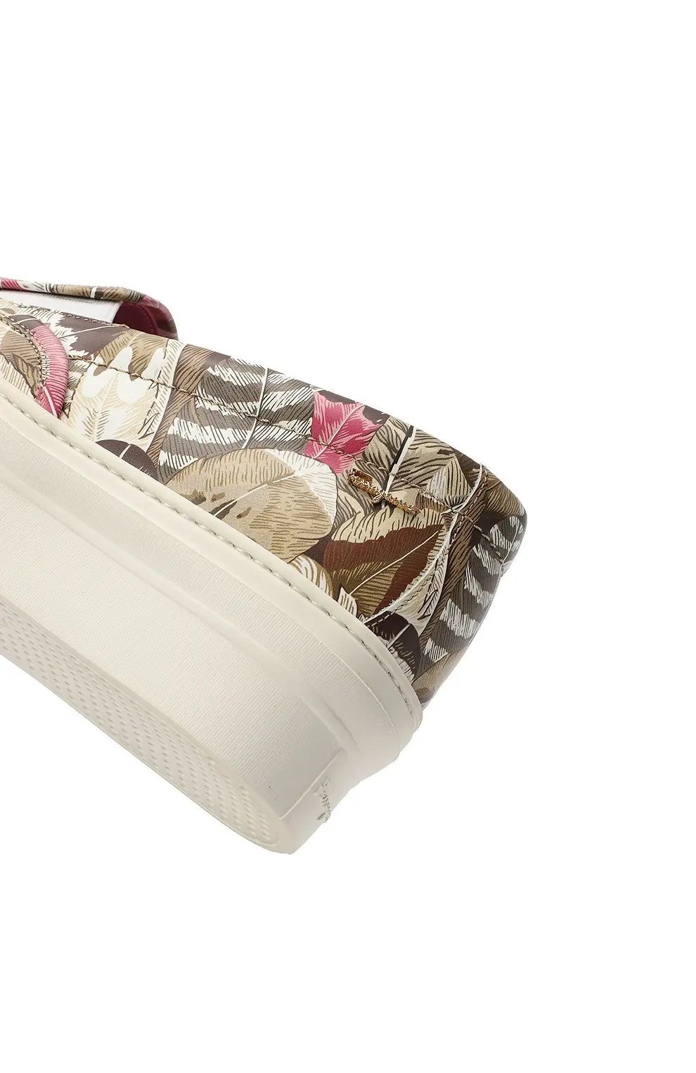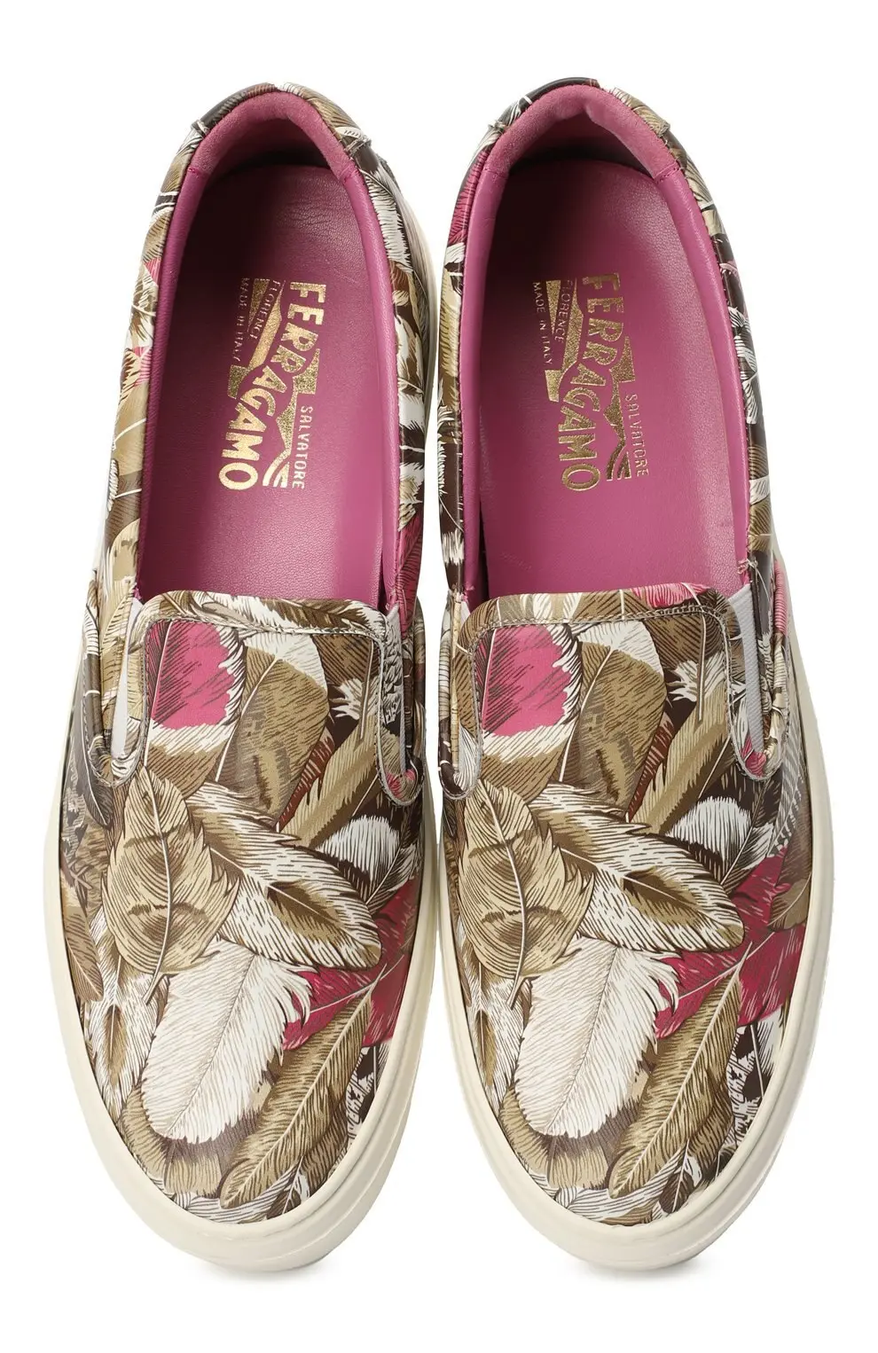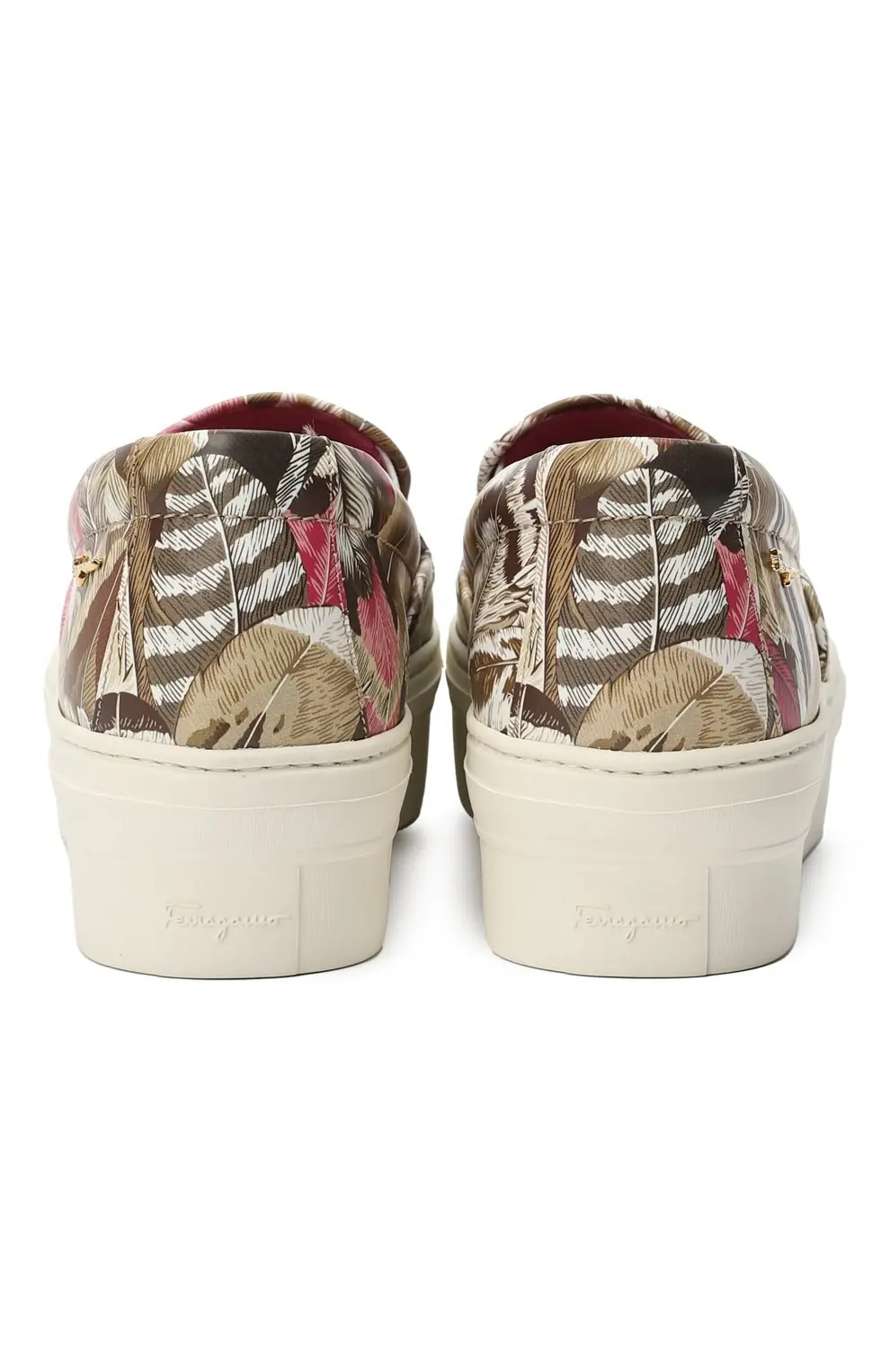 Слипоны Salvatore Ferragamo выполнены из мягкой кожи с ярким принтом в виде тропических листьев и перьев. Контрастная внутренняя отделка и массивная белая подошва придают модели современный и динамичный вид. Эластичные вставки по бокам обеспечивают удобство при надевании и комфорт при носке. Элегантное сочетание дизайна и итальянского качества делает пару стильным акцентом повседневного образа.