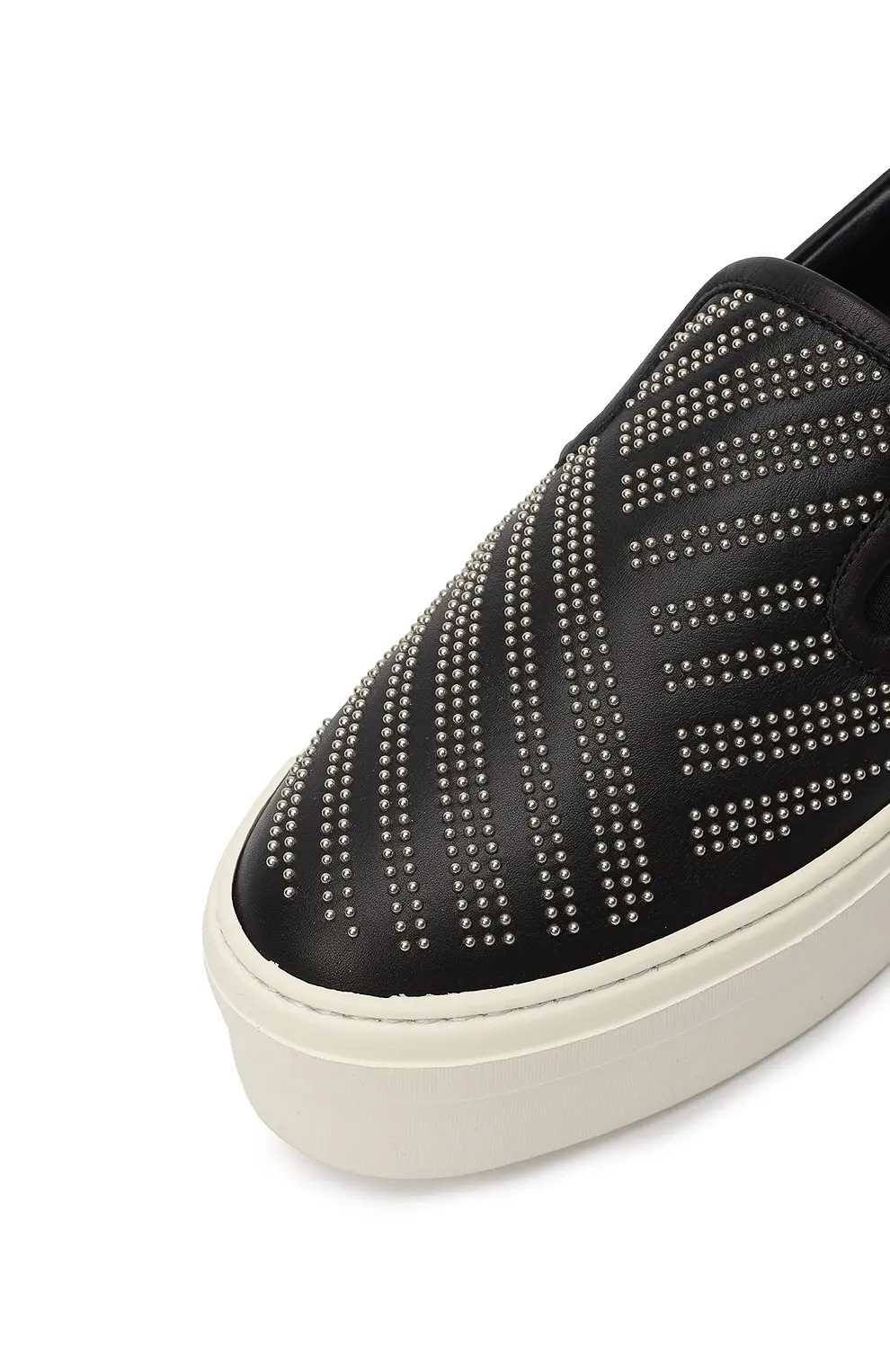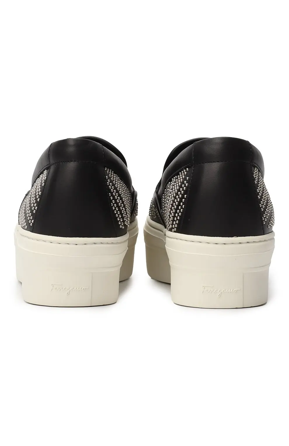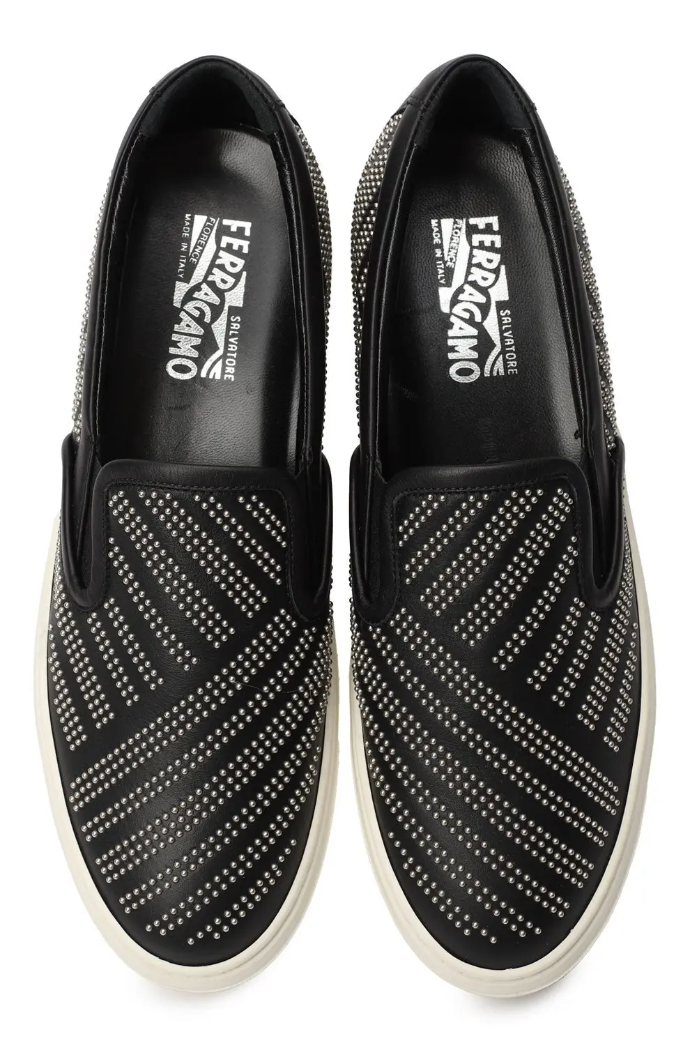 Женские слипоны Pacaustuds от Salvatore Ferragamo — это современный взгляд на повседневную обувь, в котором комфорт соединяется с яркой индивидуальностью бренда. Модель выполнена из мягкой кожи и украшена россыпью миниатюрных металлических заклепок, образующих графичный узор. Такой декор придает лаконичному силуэту динамичность и делает пару выразительным акцентом в образе. Контрастная массивная подошва не только визуально облегчает дизайн, но и обеспечивает удобство при носке.