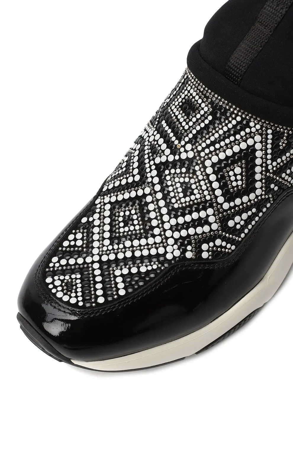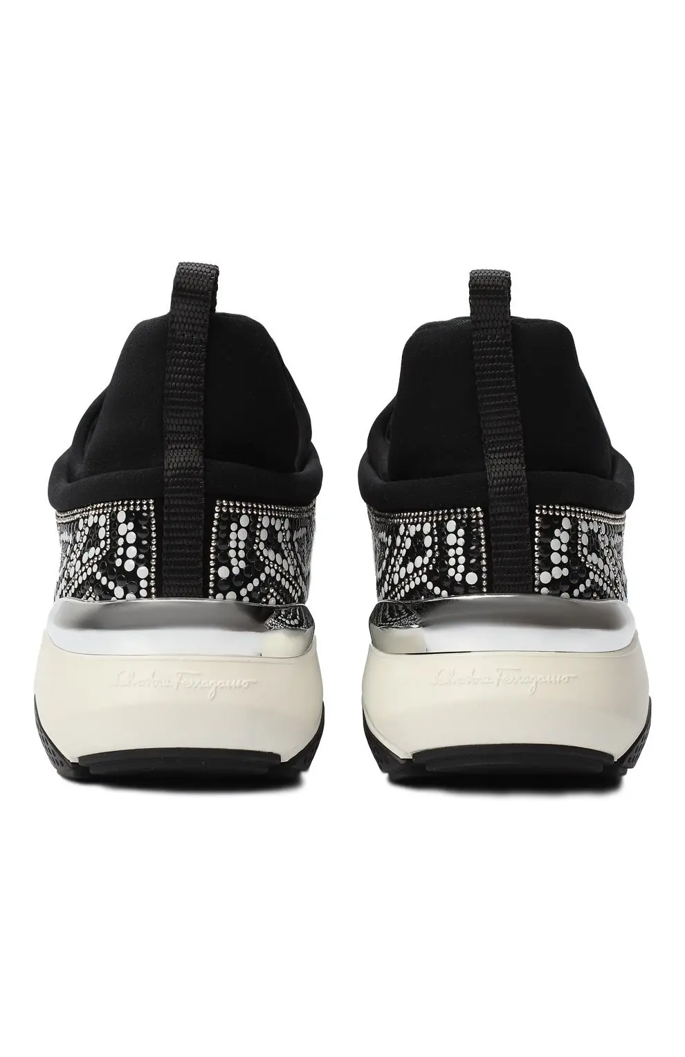 Эти кроссовки от Salvatore Ferragamo выделяются эффектным дизайном: верх украшен сверкающим орнаментом из страз, дополнен вставками из лаковой кожи и массивной контрастной подошвой. Они создают дерзкий и современный акцент, идеально подходящий для смелых и выразительных образов.