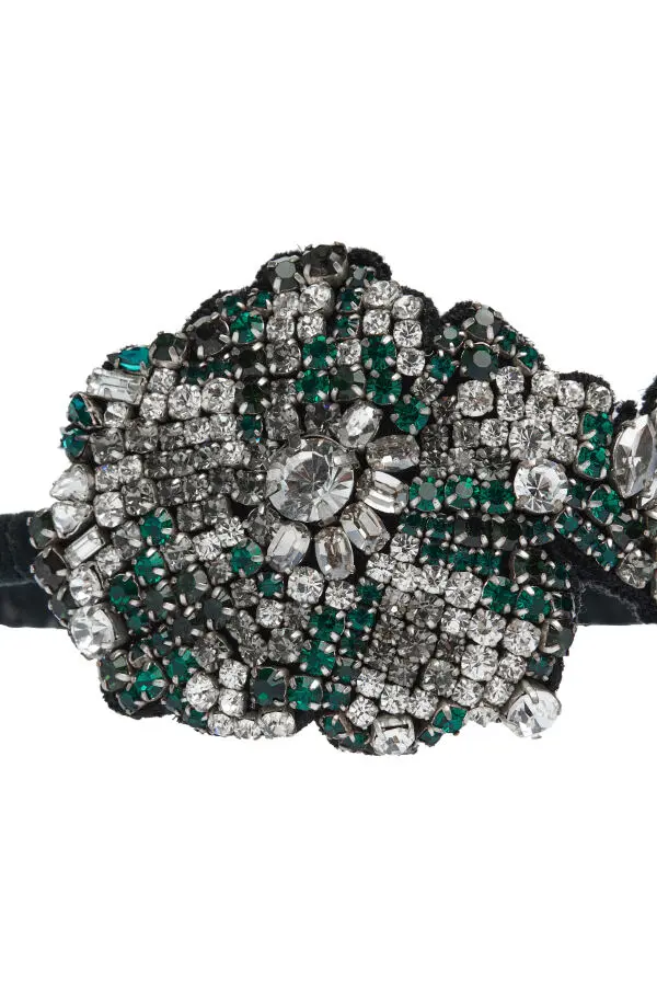 Эффектный ободок с бархатной основой оформлен крупной аппликацией из прозрачных и изумрудных кристаллов. Асимметричный блеск добавляет вечерний акцент, мягкая основа комфортно фиксируется на голове.