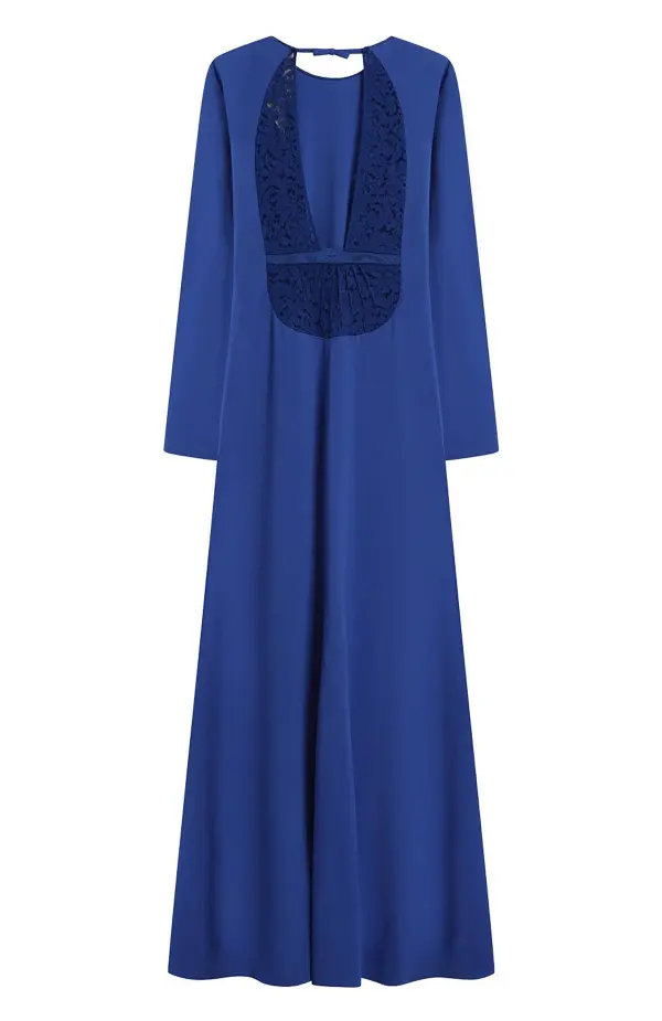 Лаконичное платье макси из мягкой вискозы выполнено в насыщенном королевском синем оттенке. Прямой силуэт с длинными рукавами и округлым вырезом подчёркивает графичность линии плеч, создавая элегантный минималистичный образ. Модель дополнена аккуратной застёжкой сзади, что сохраняет чистоту кроя и позволяет легко сочетать платье как с лаконичными лодочками, так и с контрастными аксессуарами.