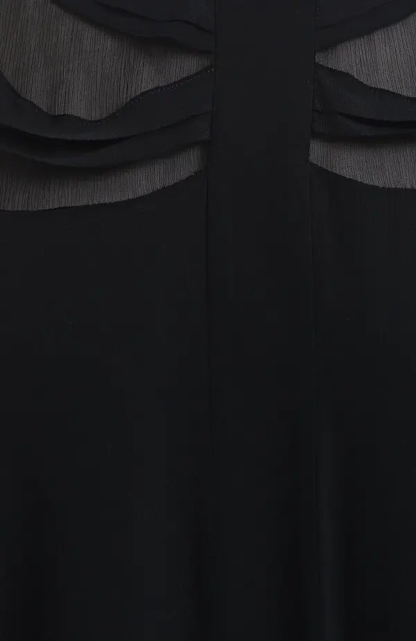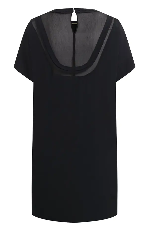 Минималистичное шелковое платье N°21 в насыщенном чёрном цвете впечатляет утончёнными деталями. Полупрозрачные многослойные вставки по линии воротника создают изящный акцент и визуально облегчают образ, а скрытая планка поддерживает чистоту силуэта. Свободный прямой крой и мягко ниспадающая ткань обеспечивают комфорт и безупречную посадку, делая модель универсальным выбором для офиса, вечернего ужина или светского мероприятия.