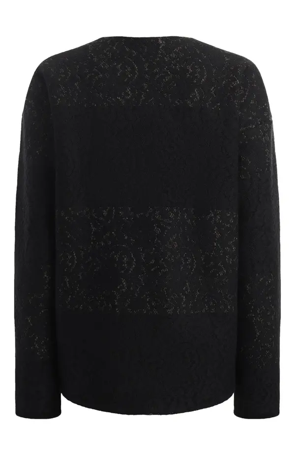 Лаконичный кардиган прямого кроя выполнен из мягкого шерстяного трикотажа с добавлением хлопка. Тонкий ажурный узор придает модели деликатную фактуру и делает черный цвет более выразительным. Круглый вырез и скрытая застежка подчеркивают минималистичный характер изделия.