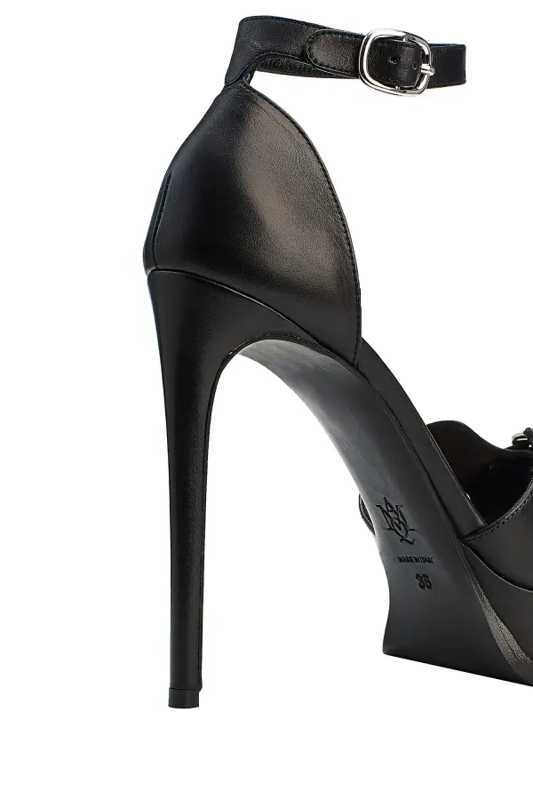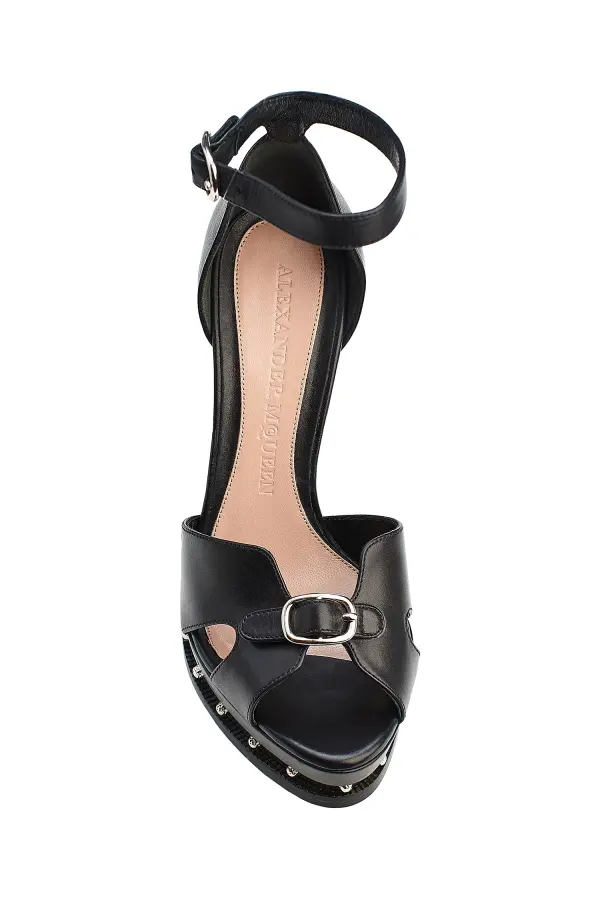 Босоножки выполнены из гладкой чёрной кожи с платформой, украшенной металлической пластиной и миниатюрными заклёпками. Открытый мыс с графичными вырезами и изящная пряжка придают модели скульптурный характер, высокая шпилька визуально вытягивает силуэт. Узкий ремешок на щиколотке фиксирует посадку и обеспечивает комфортное прилегание.