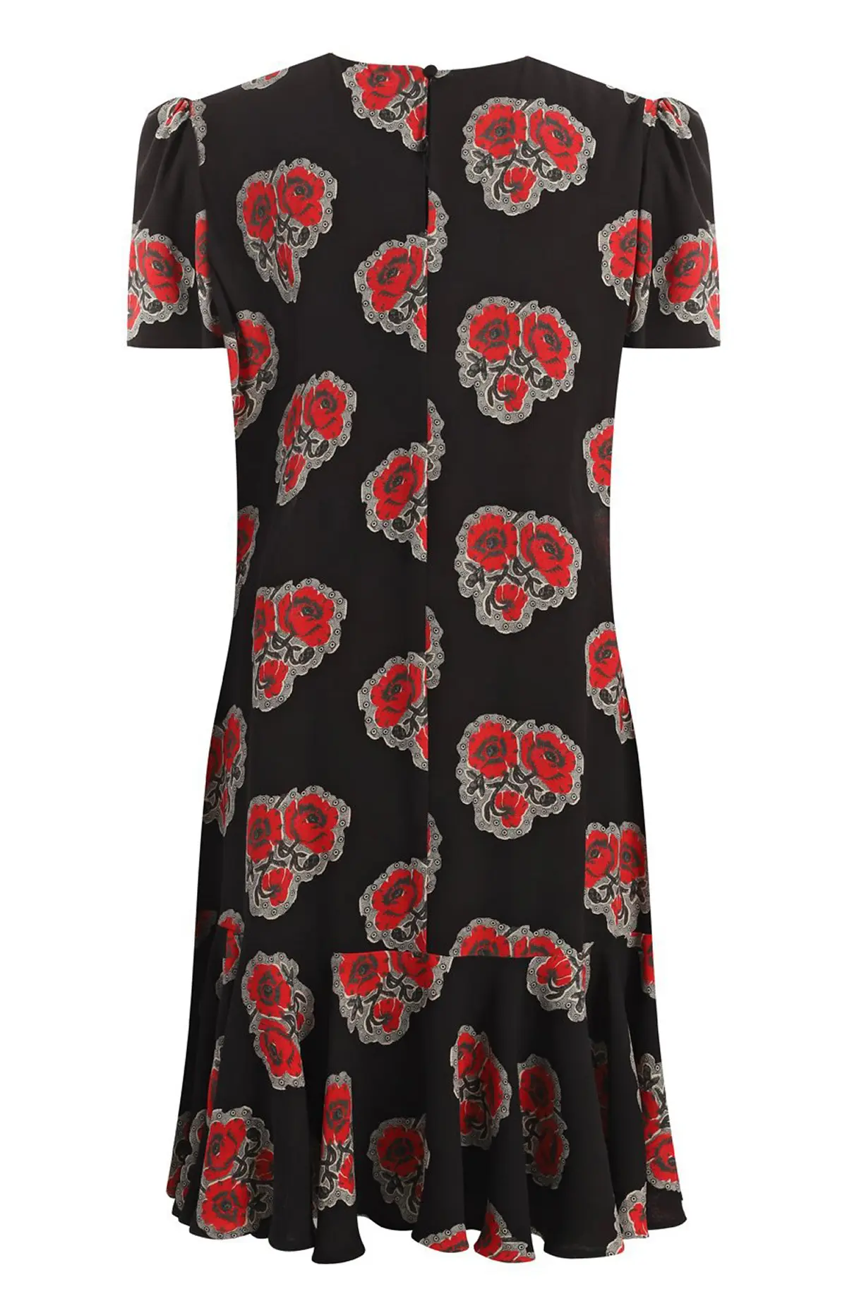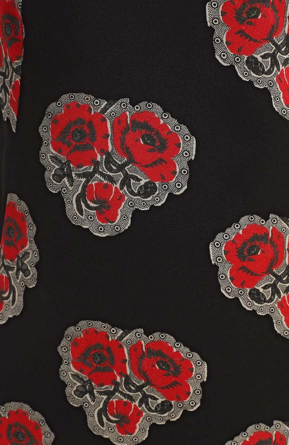 Шелковое платье Alexander McQueen чёрного цвета с ярким принтом красных роз. Модель с короткими рукавами и мягко расклешённым подолом придаёт образу женственность и динамику. Контрастный рисунок добавляет дерзкий акцент в классический силуэт.