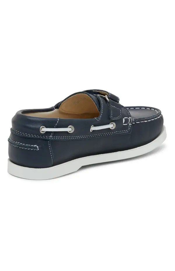 Топсайдеры выполнены из гладкой кожи тёмно-синего оттенка, контрастная прошивка и декоративная шнуровка по борту подчёркивают морской характер. Ремешок на велкро упрощает посадку и обеспечивает надёжную фиксацию. Лёгкая амортизирующая подошва с цепким протектором обеспечивает комфортное прилегание в повседневной носке.