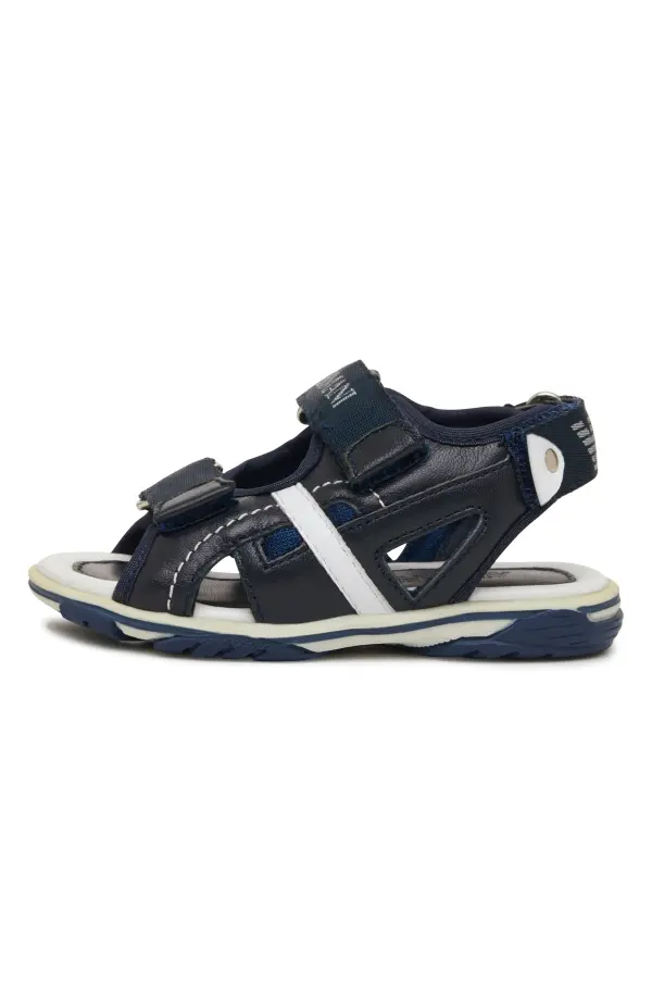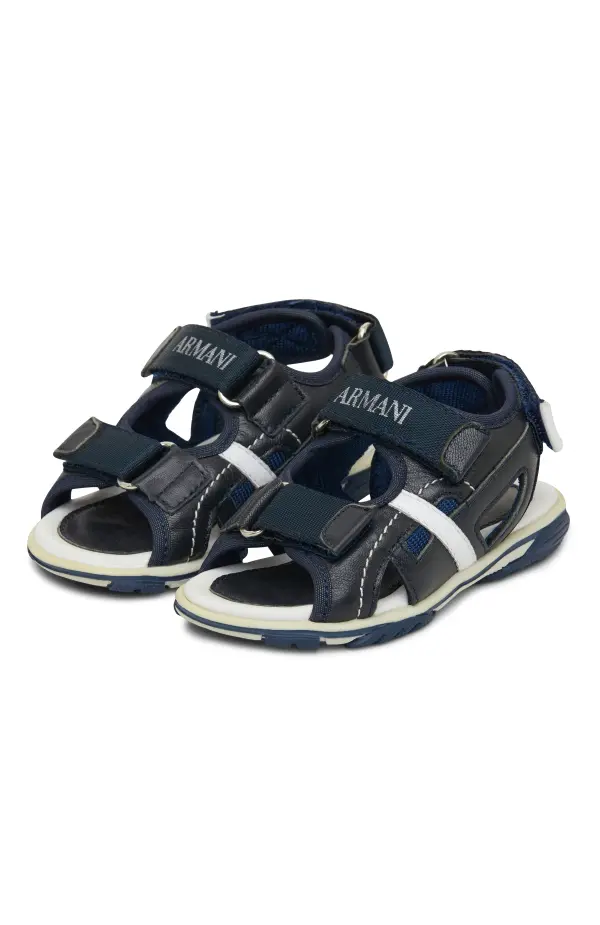 Сандалии для мальчика Armani Junior из мягкой экокожи и дышащего текстиля в тёмно-синей гамме с белыми акцентами. Три регулируемые ремешка на липучках обеспечивают удобную посадку, мягкая сетчатая подкладка и анатомичная стелька отвечают за комфорт в течение дня. Лёгкая рельефная подошва не скользит, ремни украшены фирменным логотипом.