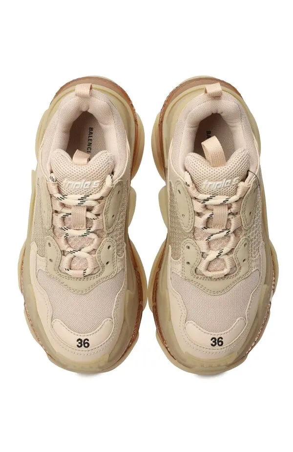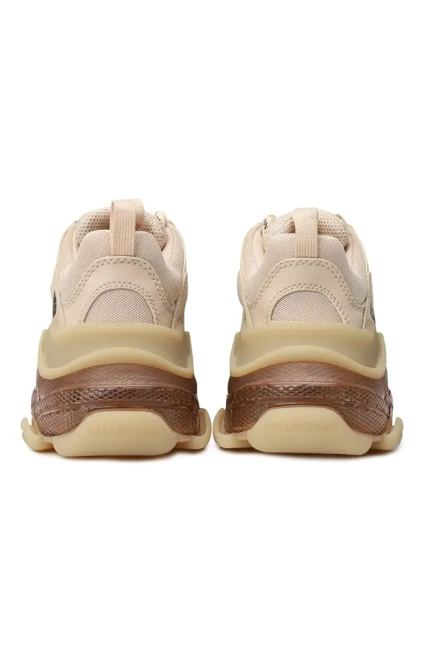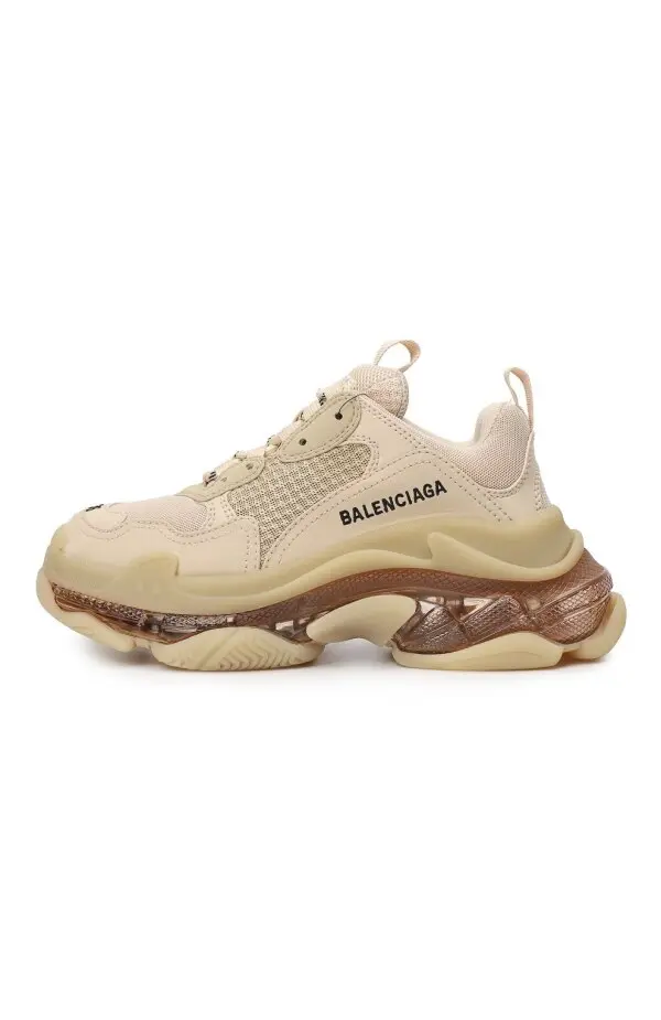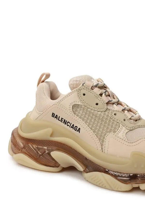 Кроссовки Triple-S от Balenciaga выполнены в фирменном массивном силуэте, сочетающем спортивный стиль и уличную моду. Модель изготовлена из комбинации кожи, текстиля и сетчатых вставок в бежевых оттенках, что придаёт образу универсальность. Фирменная тройная подошва с прозрачными элементами обеспечивает комфорт и делает дизайн узнаваемым. Логотип бренда сбоку завершает образ, подчеркивая престиж и современный характер пары.