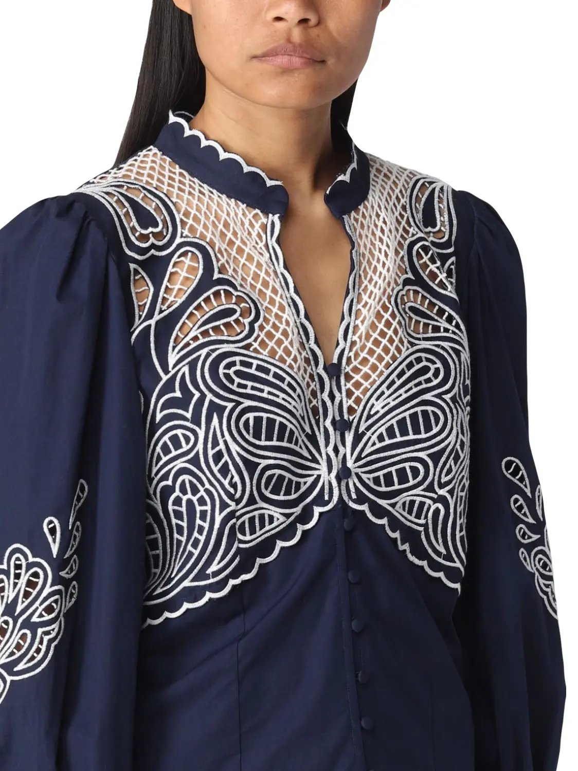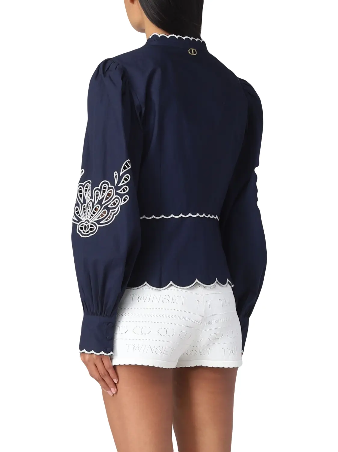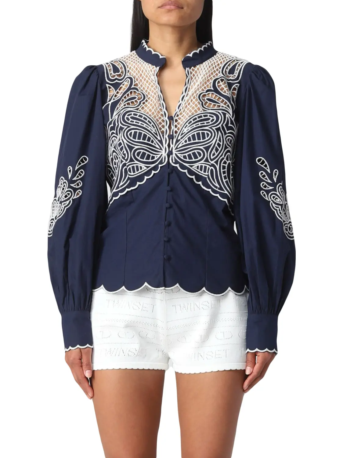 Рубашка TWINSET с шитьем сангалло из хлопкового поплина. Изделие с сетчатой вышивкой, и длинными присборенными рукавами. Вышивка делает эту рубашку изысканной. Модель с воротником-стойкой и V-образным вырезом, фестонными краями и застежкой на обтяжные пуговицы. Сочетайте с любым белым низом для создания оригинального образа.