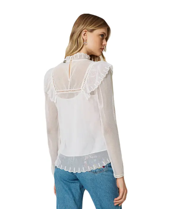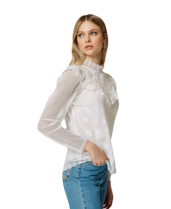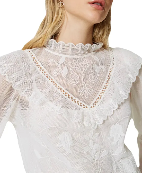 Блуза TWINSET из просвечивающей хлопковой сетки. Изделие имеет ручную вышивку тамбурным швом в виде цветов из органзы. Она имеет прямой силуэт, высокий воротник и прозрачную треугольную кокетку с рюшами. Также есть нижний слой — топ из хлопкового муслина в тон. Утонченную и романтичную, ее можно вписать во множество нарядов.
