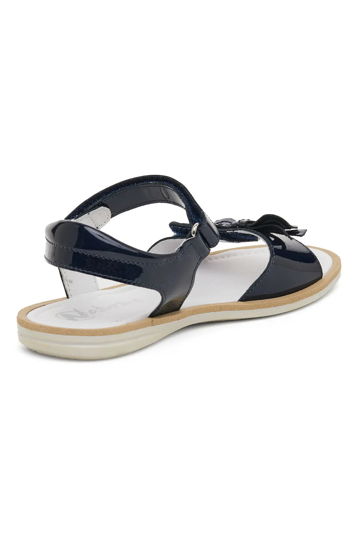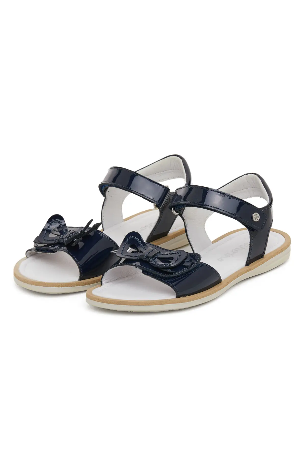 Выполнены из тёмно-синего лакированного материала с глянцевым блеском. Передняя перемычка дополнена миниатюрным бантом, верх фиксируется застёжками на липучках для удобного и комфортного прилегания. Лёгкая подошва и мягкая стелька поддерживают стопу и подчёркивают аккуратный силуэт.