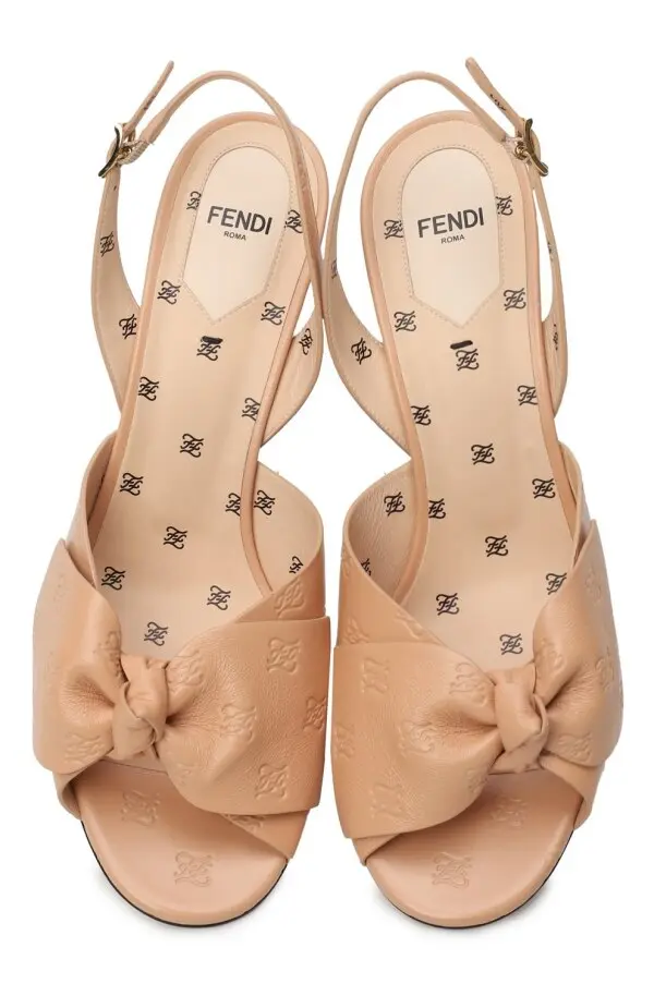 Босоножки Fendi на устойчивом каблуке сочетают элегантность и женственность с фирменным стилем дома. Модель выполнена из мягкой кожи, украшенной тиснением с логотипами бренда, что придаёт изысканную текстуру. Широкие перекрещенные ремни с объёмным узлом создают эффектный акцент, а регулируемый ремешок на щиколотке обеспечивает удобную посадку. Эти босоножки станут универсальным решением для летних образов — от лёгких платьев до классических брюк.
