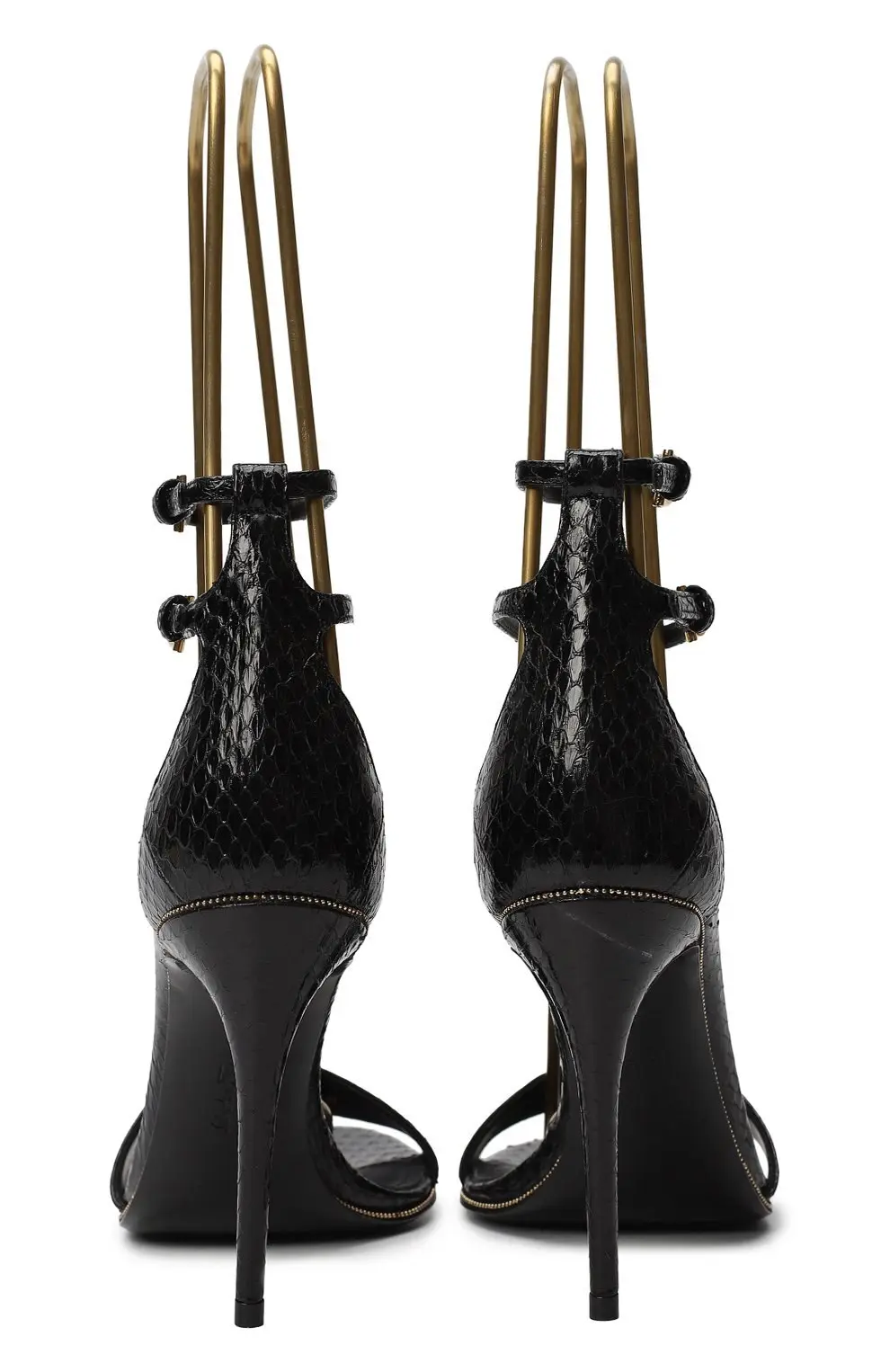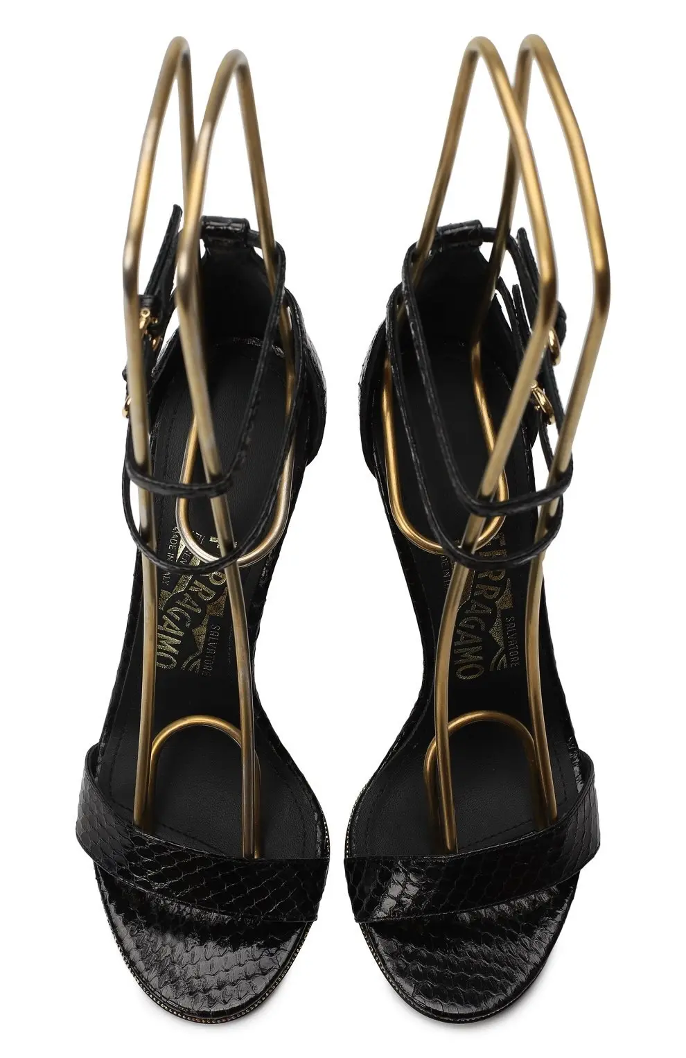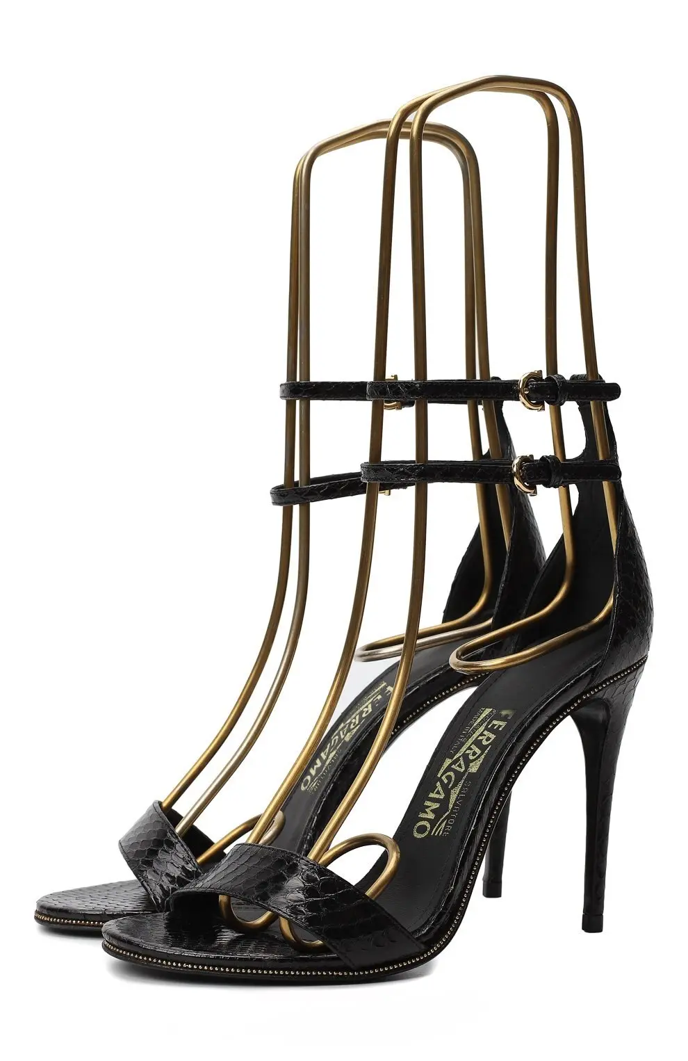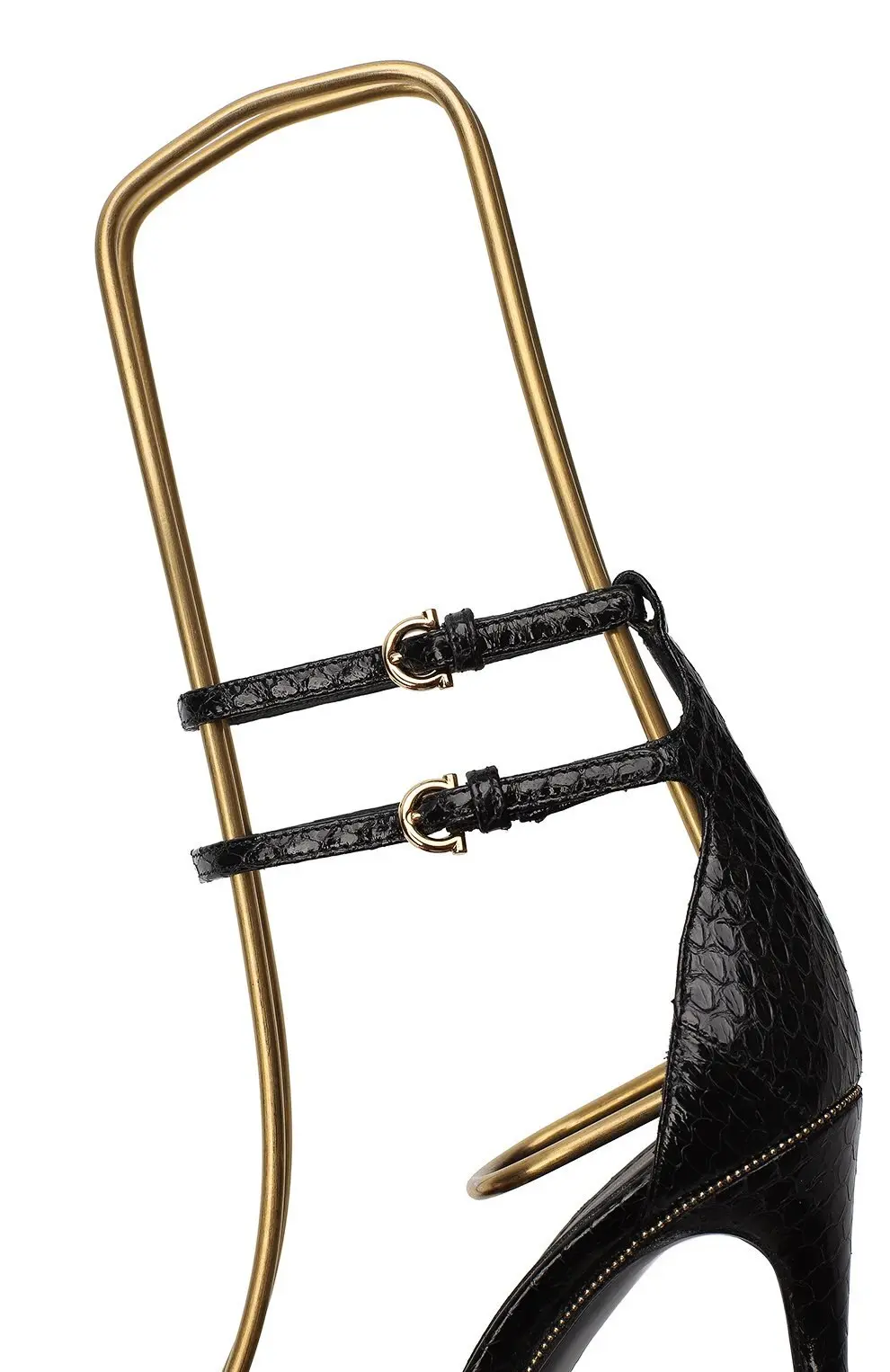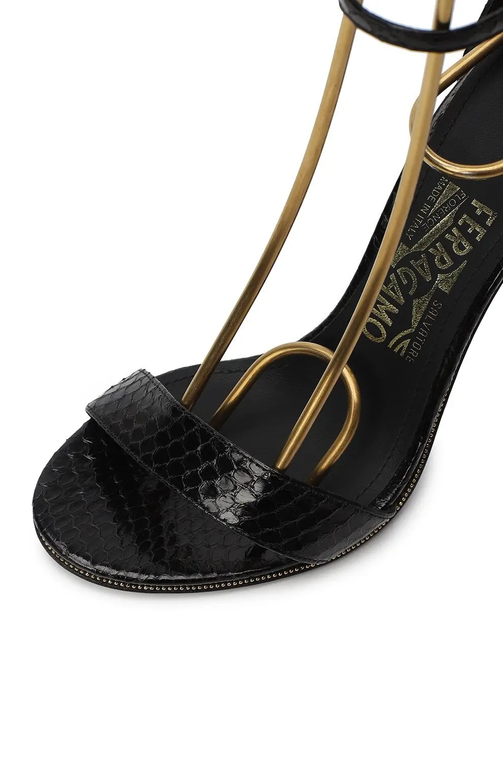 Босоножки Salvatore Ferragamo из кожи питона — воплощение утончённой роскоши. Чёрная экзотическая кожа с характерной фактурой придаёт модели премиальный вид, а тонкий высокий каблук подчёркивает изящность силуэта. Двойные ремешки на щиколотке фиксируют ногу, обеспечивая комфорт и устойчивость. Элегантные детали в золотистом тоне дополняют образ, делая босоножки идеальным выбором для вечерних выходов и особых случаев.