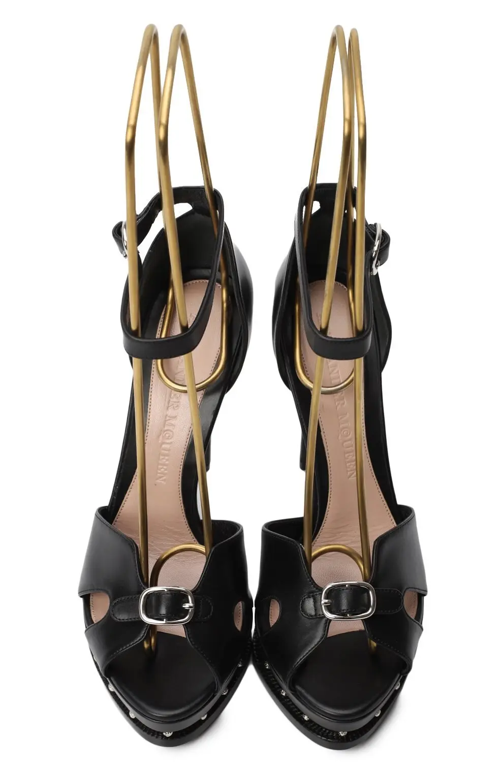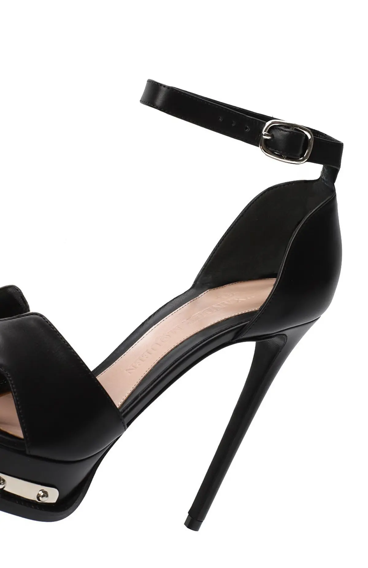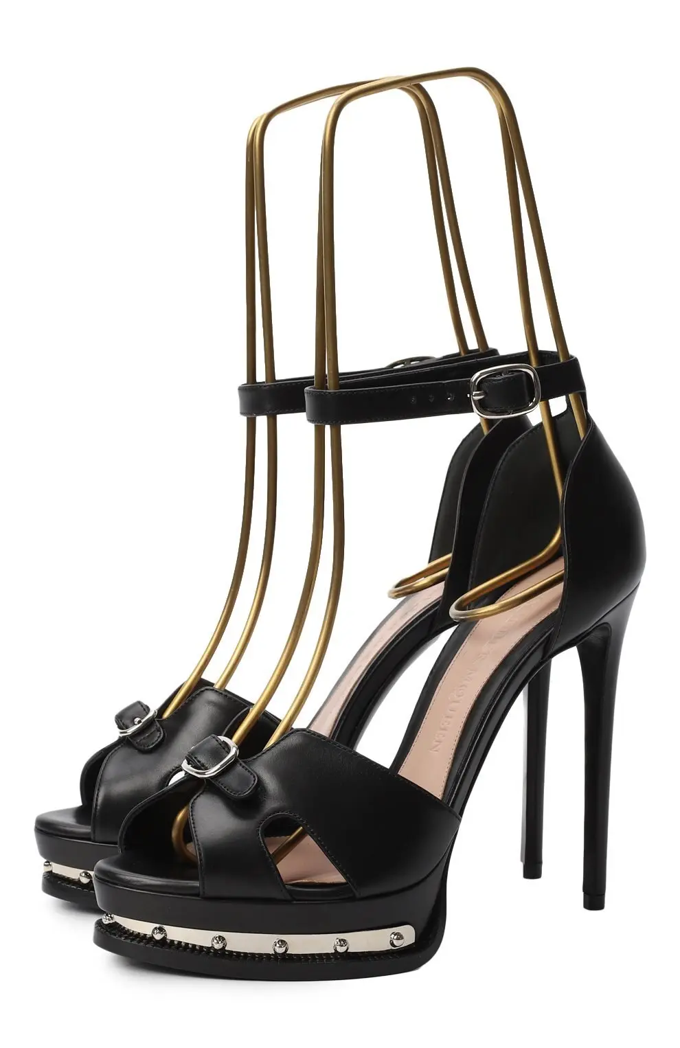 Босоножки выполнены из гладкой чёрной кожи с платформой, украшенной металлической пластиной и миниатюрными заклёпками. Открытый мыс с графичными вырезами и изящная пряжка придают модели скульптурный характер, высокая шпилька визуально вытягивает силуэт. Узкий ремешок на щиколотке фиксирует посадку и обеспечивает комфортное прилегание.