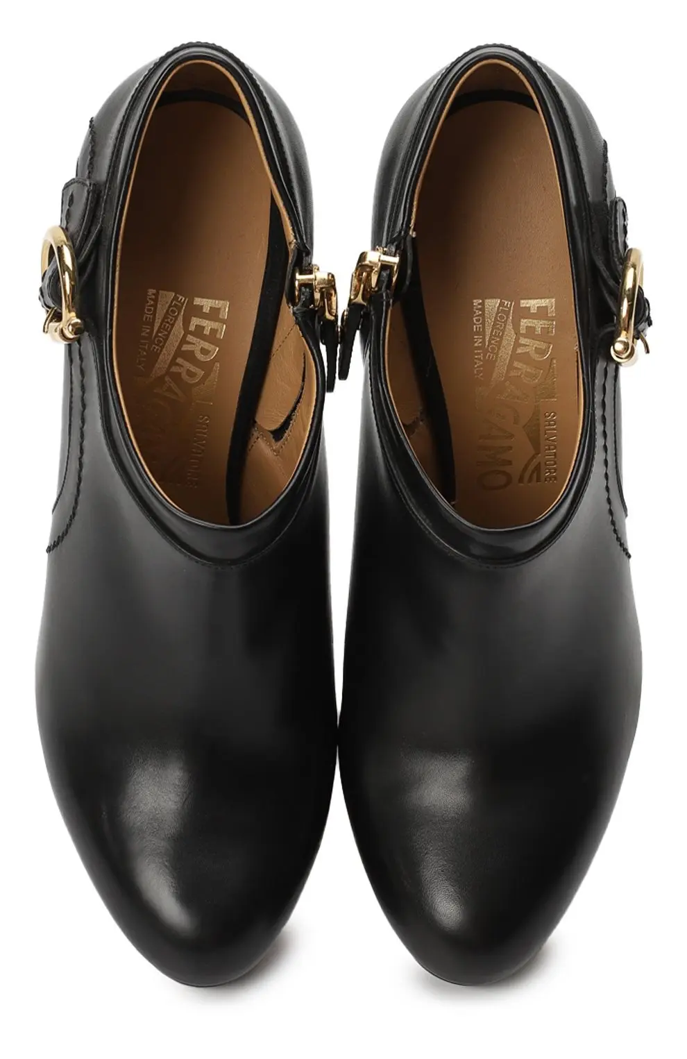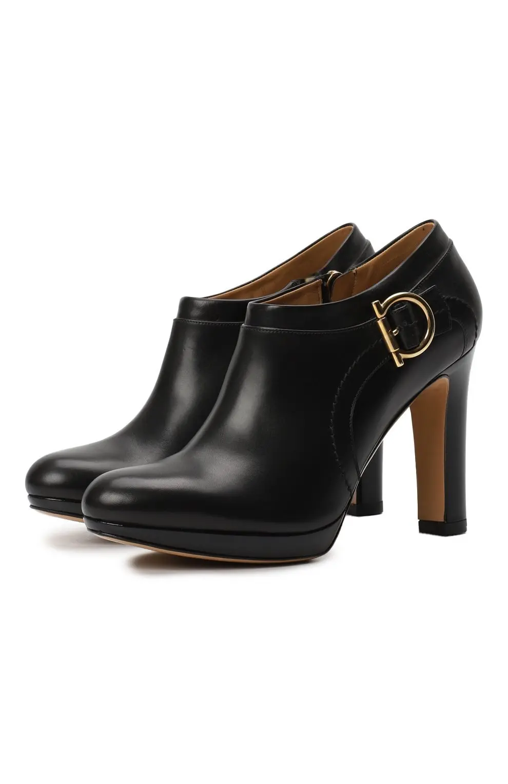 Ботильоны Teodata Salvatore Ferragamo — стильная и изысканная модель, выполненная из гладкой чёрной кожи. Отличаются округлым носком, высоким устойчивым каблуком и небольшой платформой, что делает их удобными при носке. Декорированы золотистой пряжкой с культовым символом бренда, расположенной на боковой части. Внутренняя отделка выполнена из мягкой кожи, а застёжка-молния сбоку обеспечивает комфортное надевание. Эти ботильоны прекрасно подойдут для деловых и вечерних образов, добавив элегантности любому наряду.