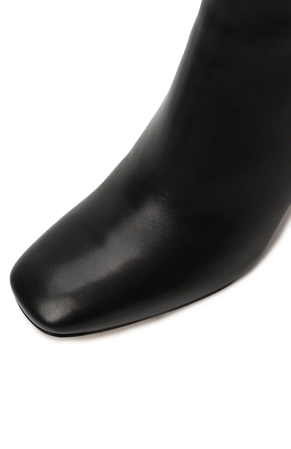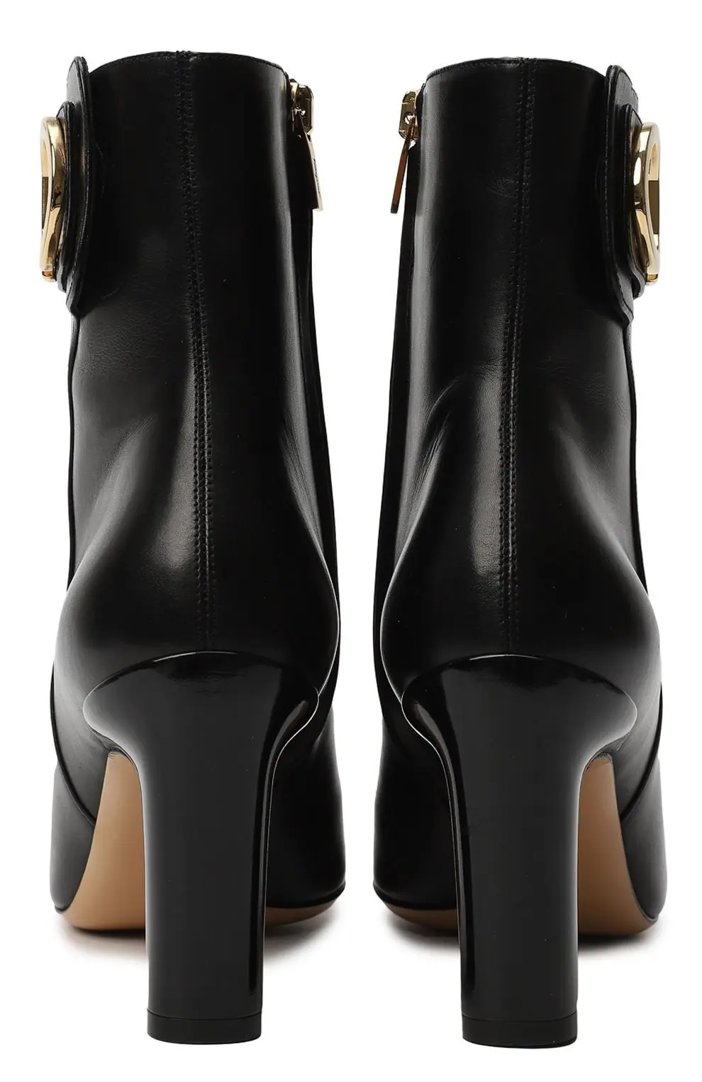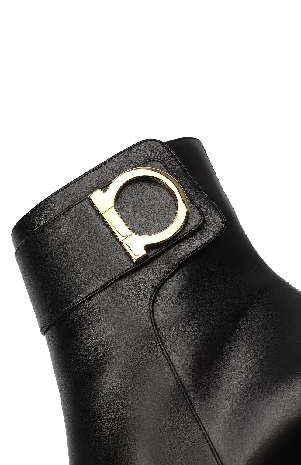 Ботильоны Rupert C Salvatore Ferragamo — элегантная модель, выполненная из гладкой чёрной кожи. Отличительной деталью служит широкий кожаный ремешок на щиколотке, украшенный крупной золотистой пряжкой с фирменным мотивом бренда. Умеренный каблук обеспечивает удобство при носке, сохраняя изысканный силуэт. Эти ботильоны станут универсальным акцентом гардероба, гармонично дополняя как деловые образы, так и вечерние наряды.