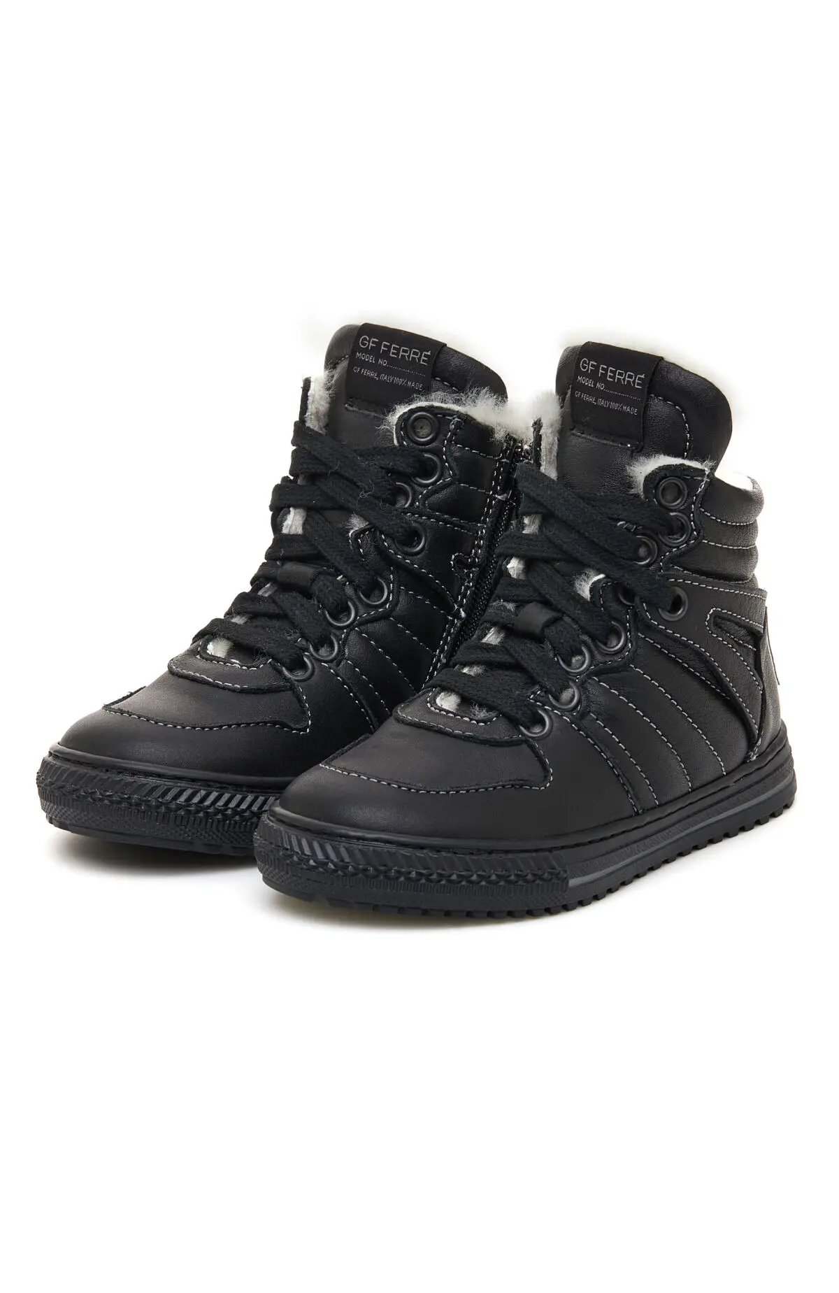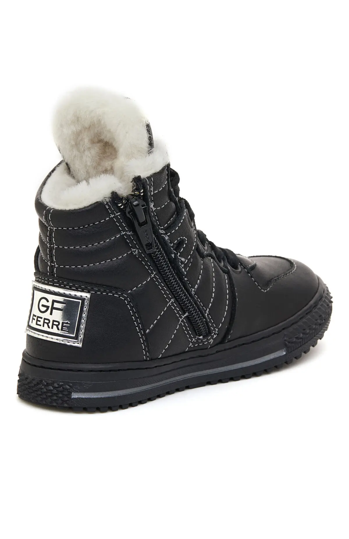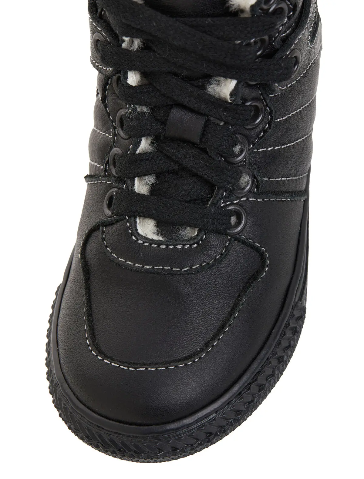 Модель выполнена из матовой чёрной кожи и дополнена контрастной отстрочкой. Тёплая меховая подкладка, шнуровка и боковая молния обеспечивают комфортное прилегание и удобство надевания. Уплотнённый ворот и рельефная резиновая подошва гарантируют устойчивую посадку на каждый день.