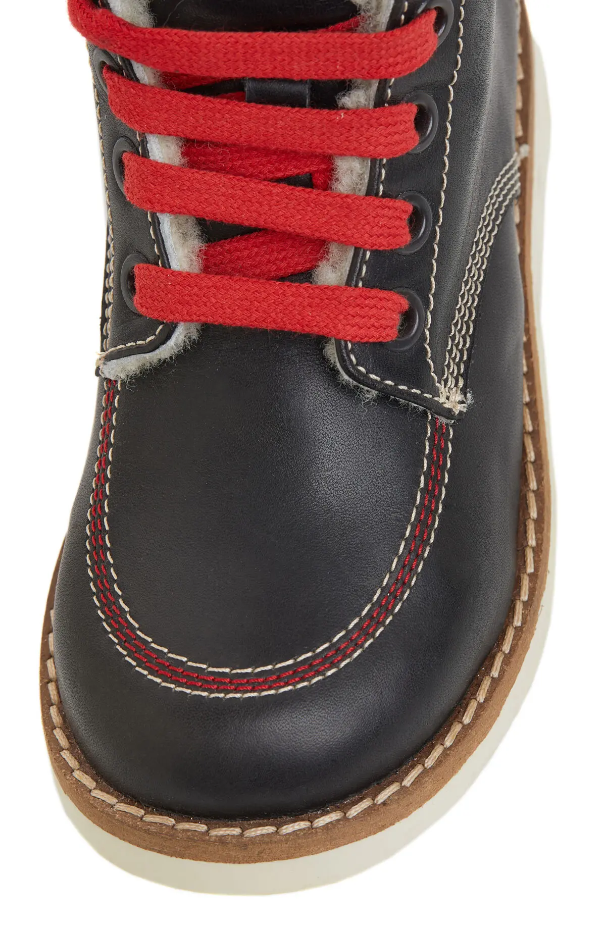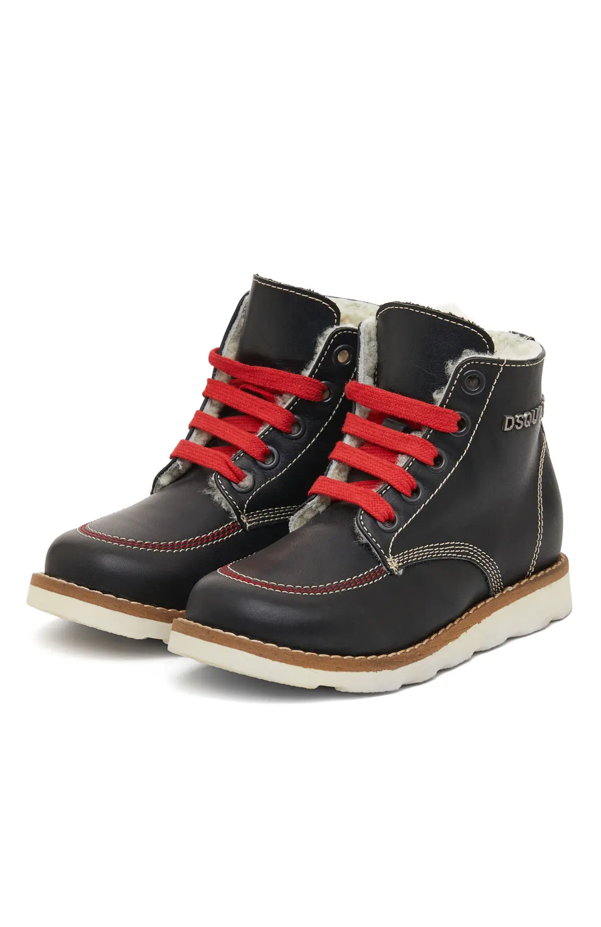 Выполнены из гладкой чёрной кожи с контрастной отстрочкой и акцентными красными шнурками. Тёплая меховая подкладка обеспечивает мягкость и комфортное прилегание. Лёгкая рельефная подошва и усиленный рант подчёркивают утилитарный характер модели и подходят для повседневного города.