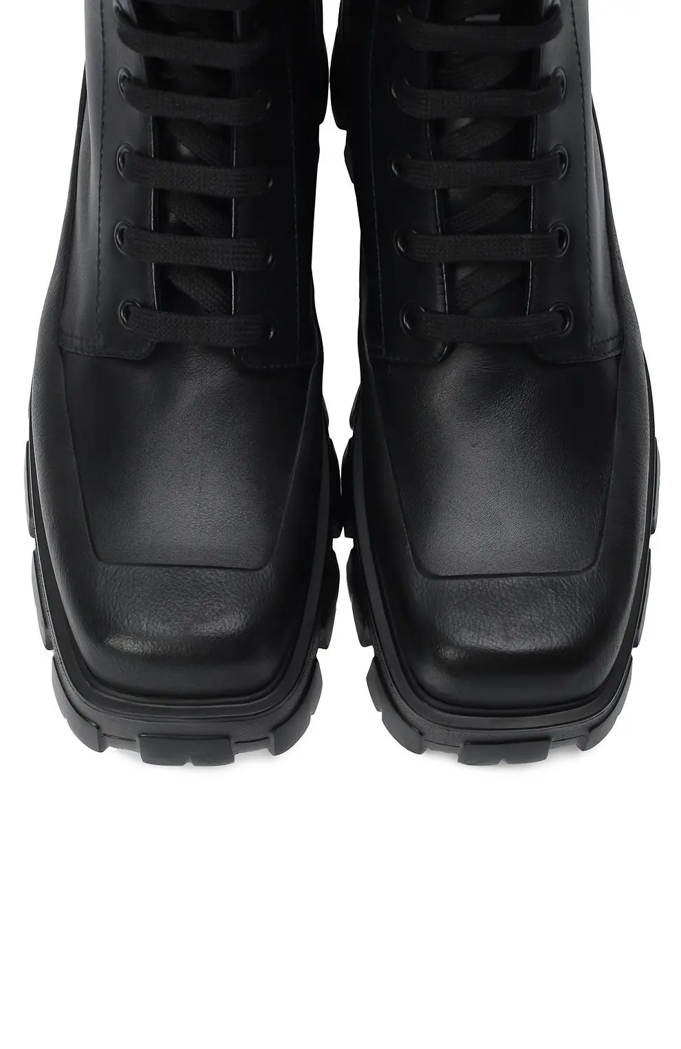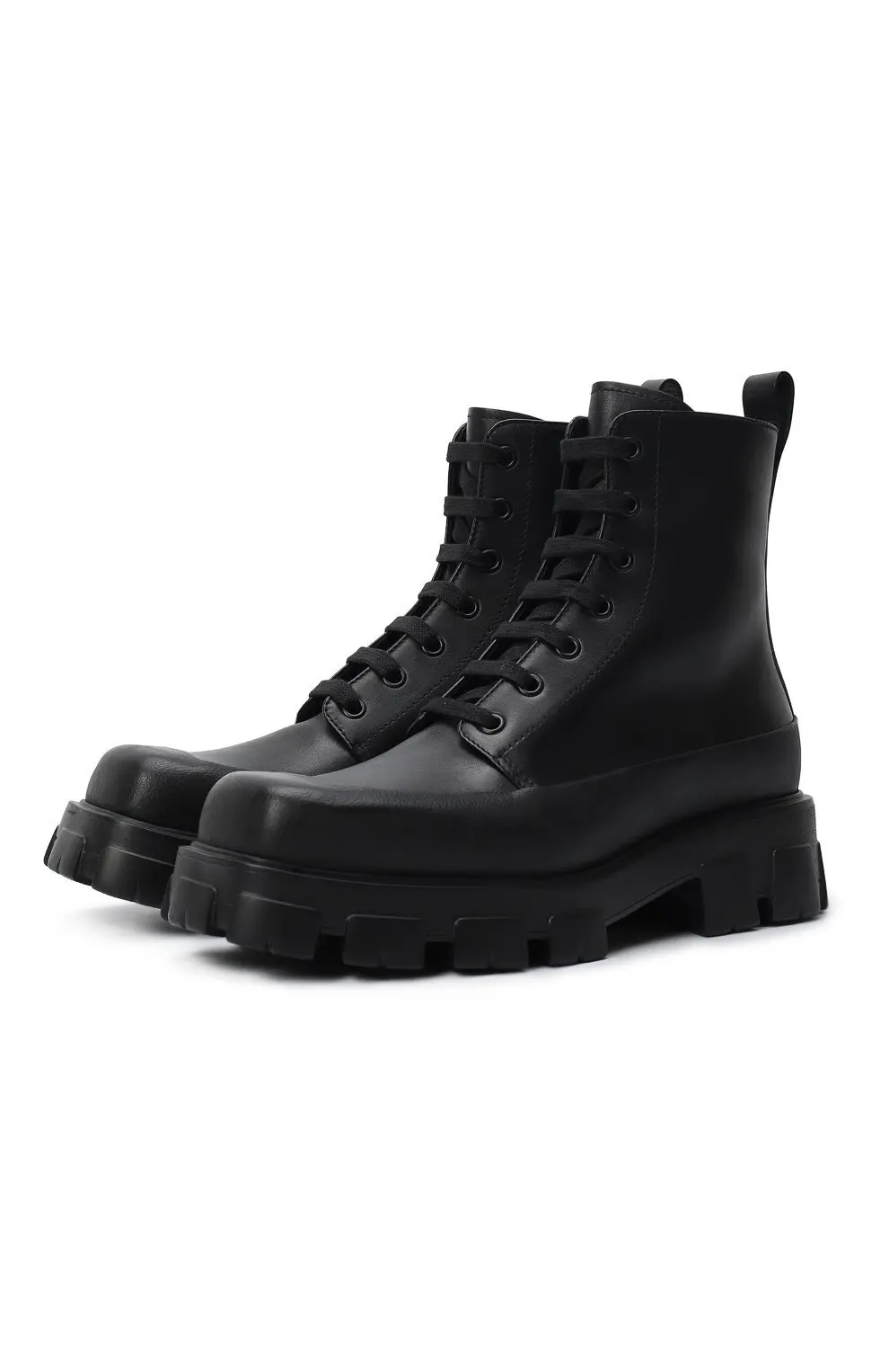Ботинки Prada из черной кожи с массивной тракторной подошвой. Модель с высоким берцем и классической шнуровкой сочетает в себе минималистичный дизайн и брутальный акцент, подчеркивая современный стиль бренда.