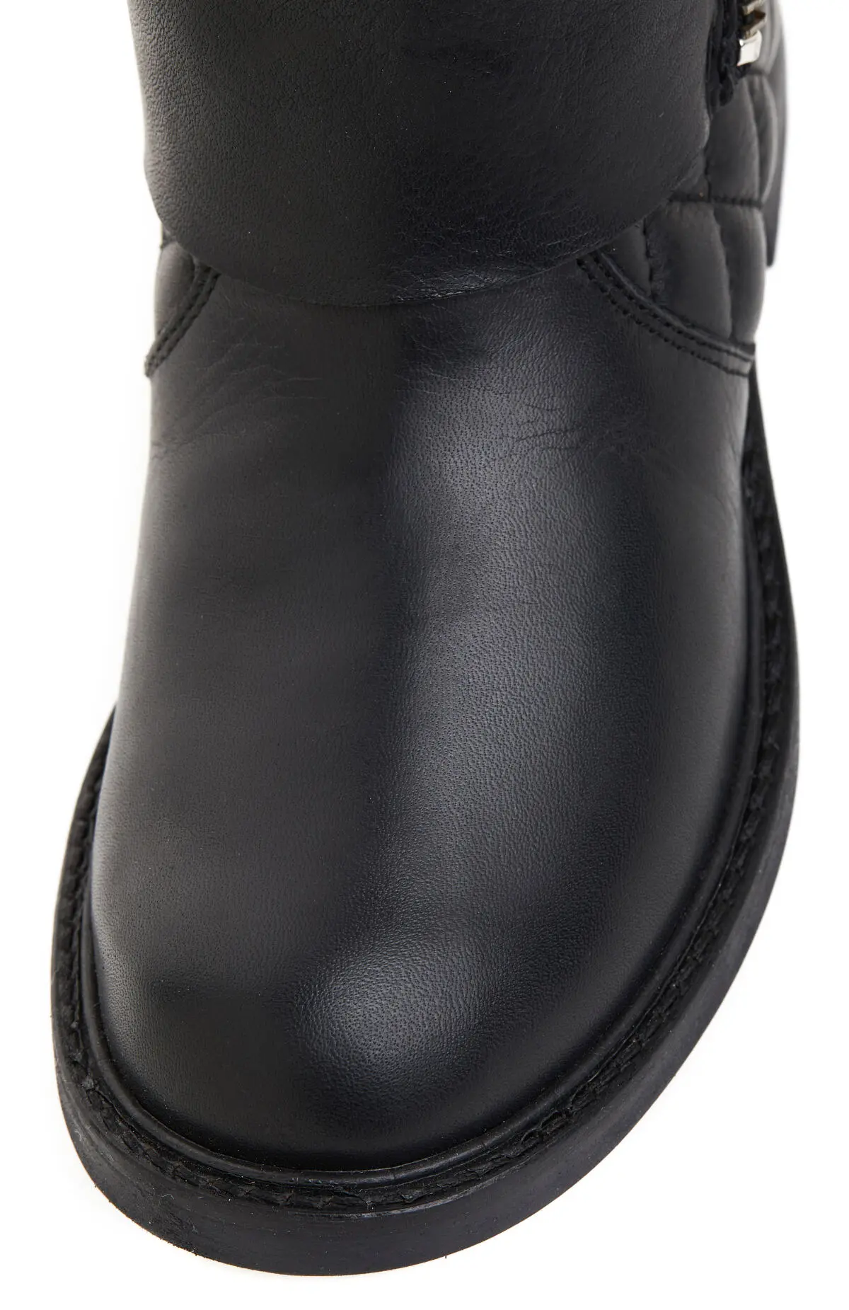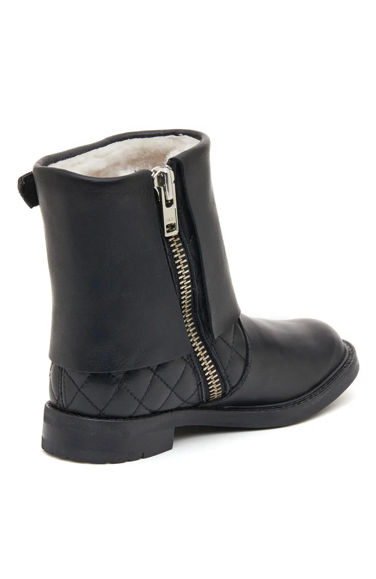 Выполнены из гладкой чёрной кожи с мягким матовым блеском. Верх дополнен ремешком с золотистыми подвесками, что подчёркивает лаконичный силуэт. Утеплённая внутренняя отделка обеспечивает комфортное прилегание, а рельефная подошва подходит для повседневного города.