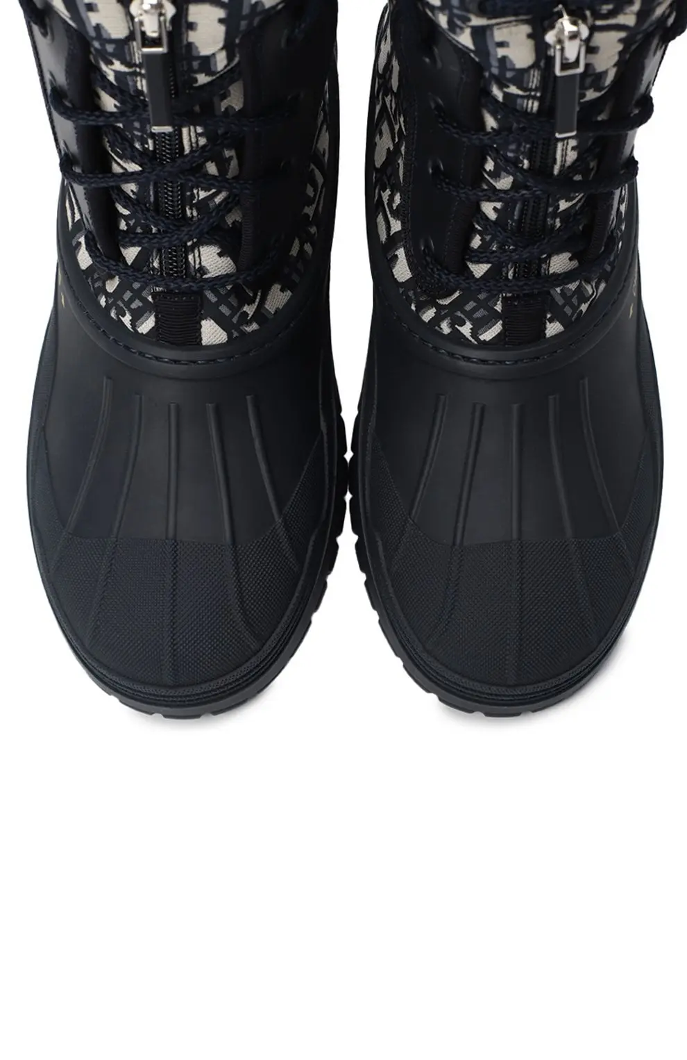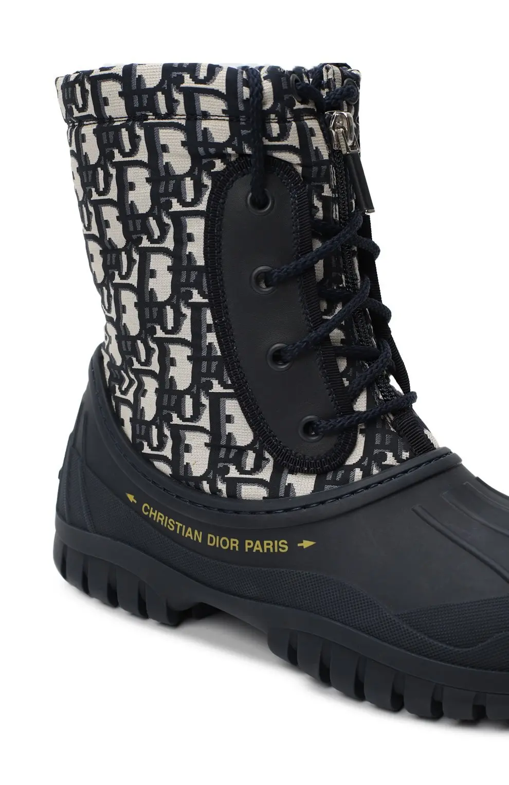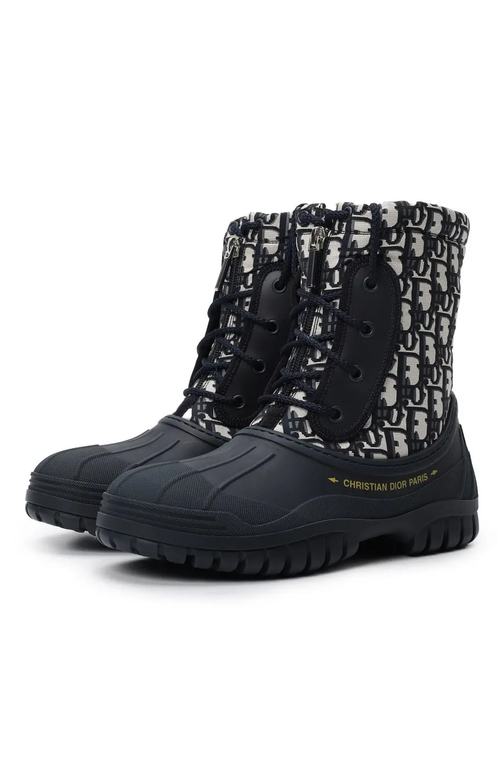 Ботинки Dior D-Venture — это стильное сочетание практичности и фирменного шика. Модель выполнена с прочным резиновым основанием, защищающим от влаги и холода, и верхом из ткани с культовым узором Dior Oblique в синем цвете. Шнуровка и боковая молния обеспечивают удобную посадку, а массивная подошва с глубоким протектором гарантирует надёжное сцепление. Идеальный выбор для активного образа жизни и смелых зимних луков.