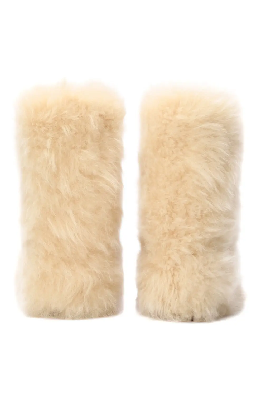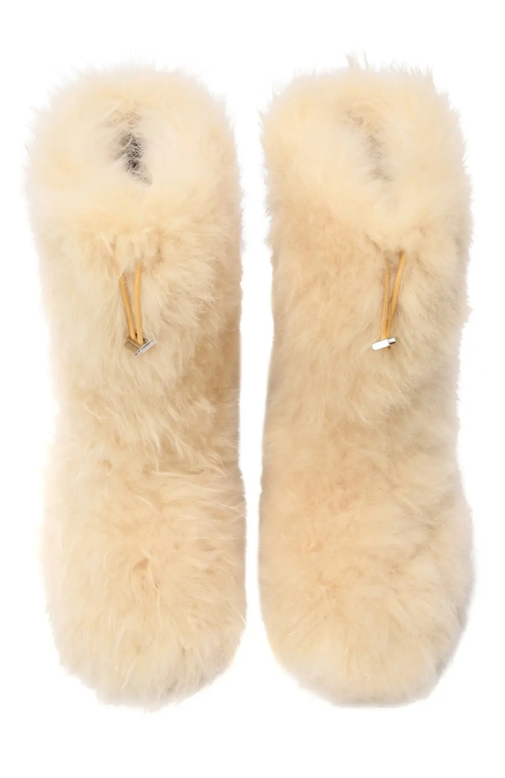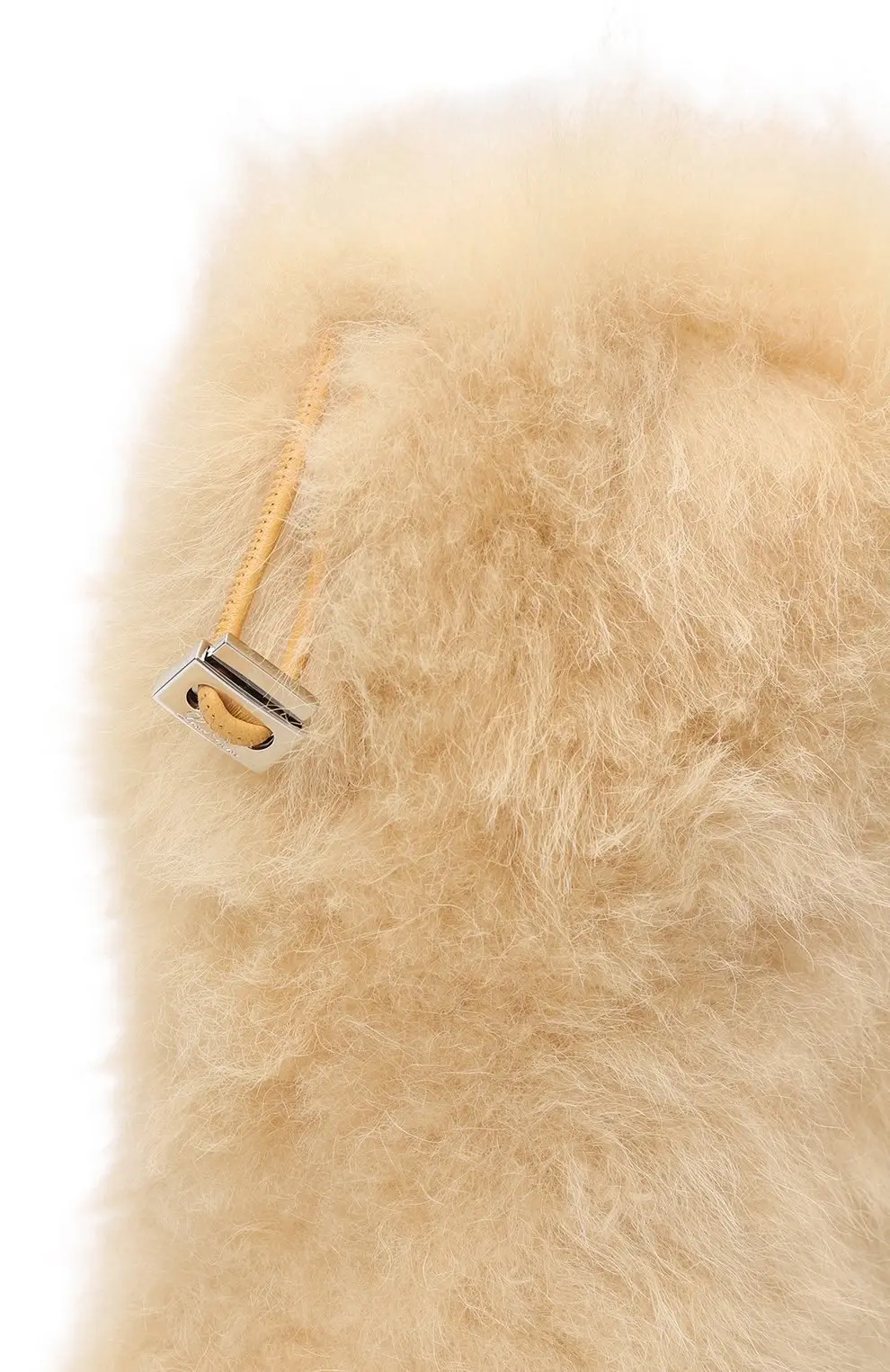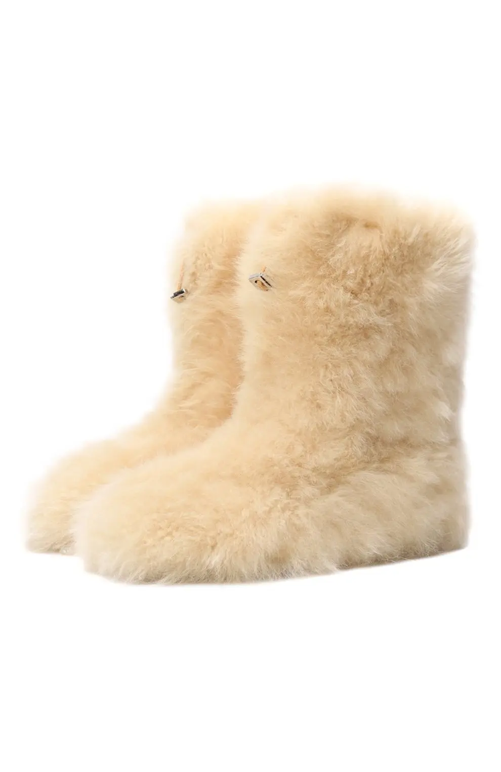 Женские ботинки от Loro Piana выполнены из мягкого овечьего меха в светлом бежевом оттенке. Модель с объемным силуэтом и высокой голенью обеспечивает тепло и комфорт в холодное время года. Акцентом служит изящная декоративная деталь с логотипом бренда. Обувь сочетает уют и утончённый стиль, отражая фирменную эстетику Loro Piana.
