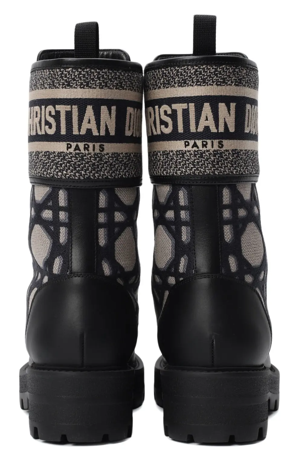 Женские ботинки D-Major от Christian Dior выполнены из сочетания прочной кожи и текстиля с культовым мотивом Dior Oblique. Высокая шнуровка и массивная рифлёная подошва придают модели характерный брутальный вид. На голенище размещена широкая вставка с фирменной надписью Christian Dior, подчёркивающей узнаваемый стиль бренда. Обувь удачно сочетает элегантность и функциональность, становясь ярким акцентом в современном гардеробе.