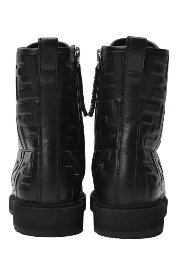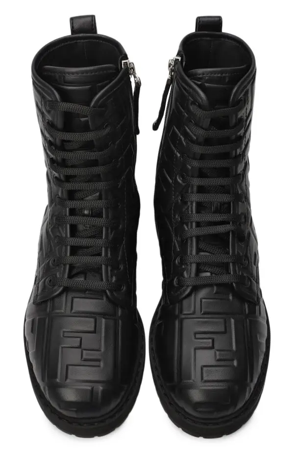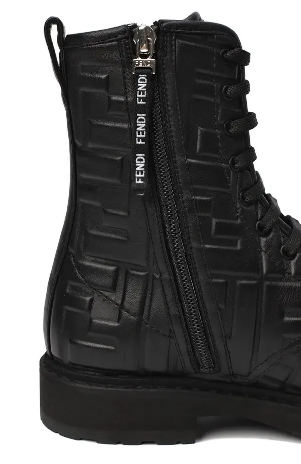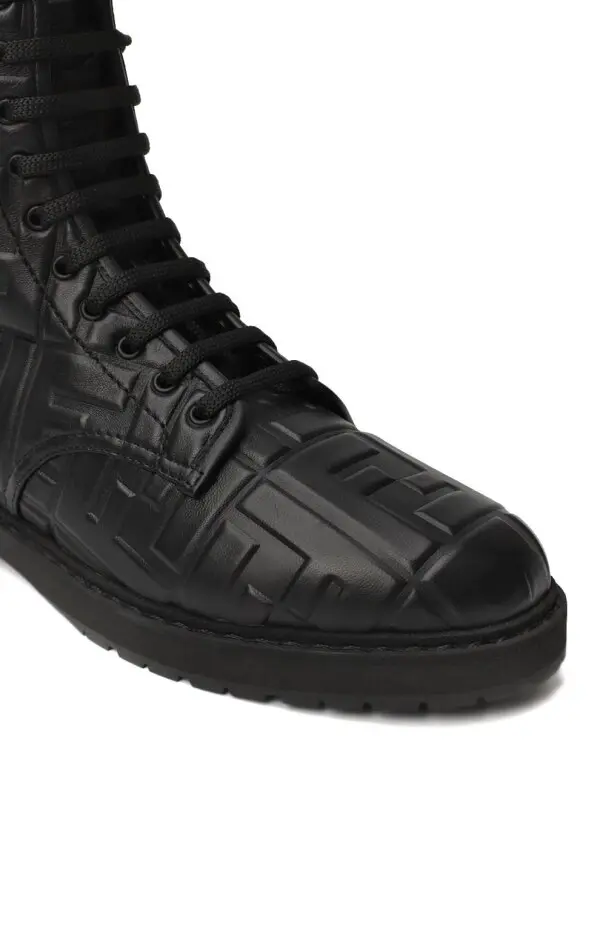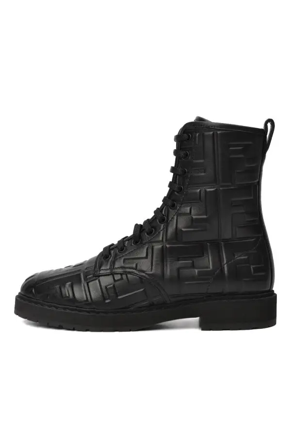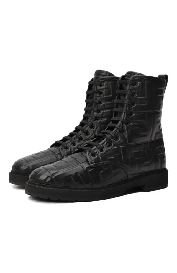 Ботинки от Fendi выполнены из гладкой чёрной кожи и украшены рельефным тиснением с фирменным мотивом FF по всей поверхности. Высокий силуэт с шнуровкой обеспечивает надёжную фиксацию и удобную посадку, а массивная подошва добавляет устойчивости и практичности. Сдержанный дизайн с акцентом на фактуру делает эту модель стильным выбором для современного гардероба.