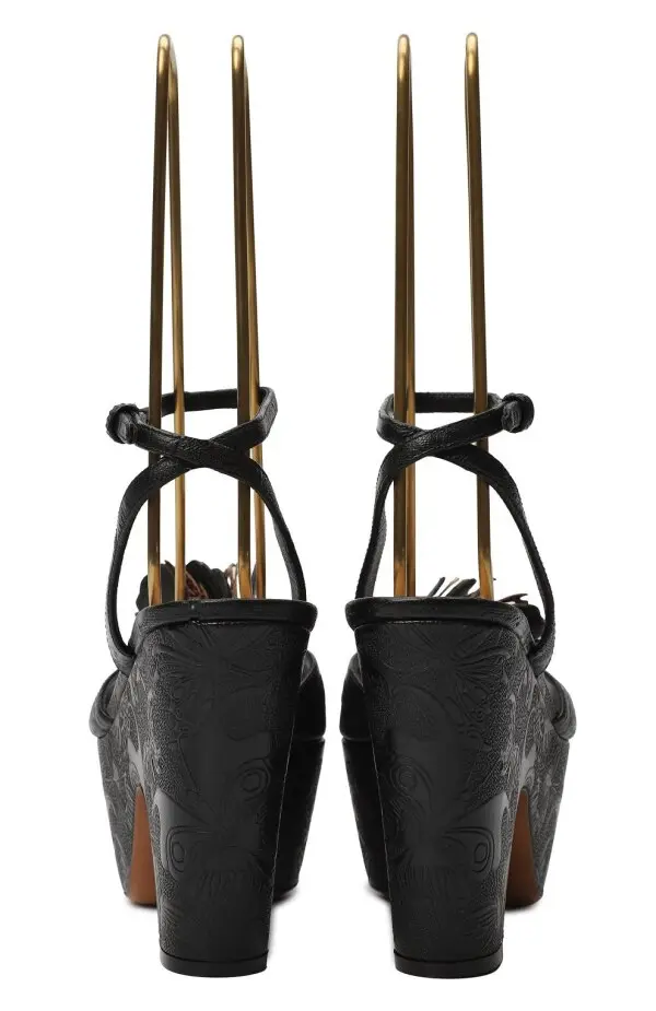 Босоножки Bottega Veneta на платформе и устойчивом каблуке, выполненные из тиснёной кожи с растительным узором. Модель украшена объемным цветком ручной работы и тонким ремешком на щиколотке. Элегантный силуэт в духе 1970-х годов сочетается с характерной для бренда скульптурностью форм и безупречным качеством исполнения.
