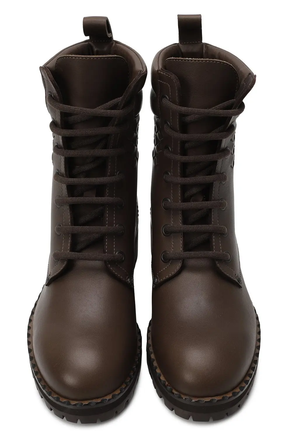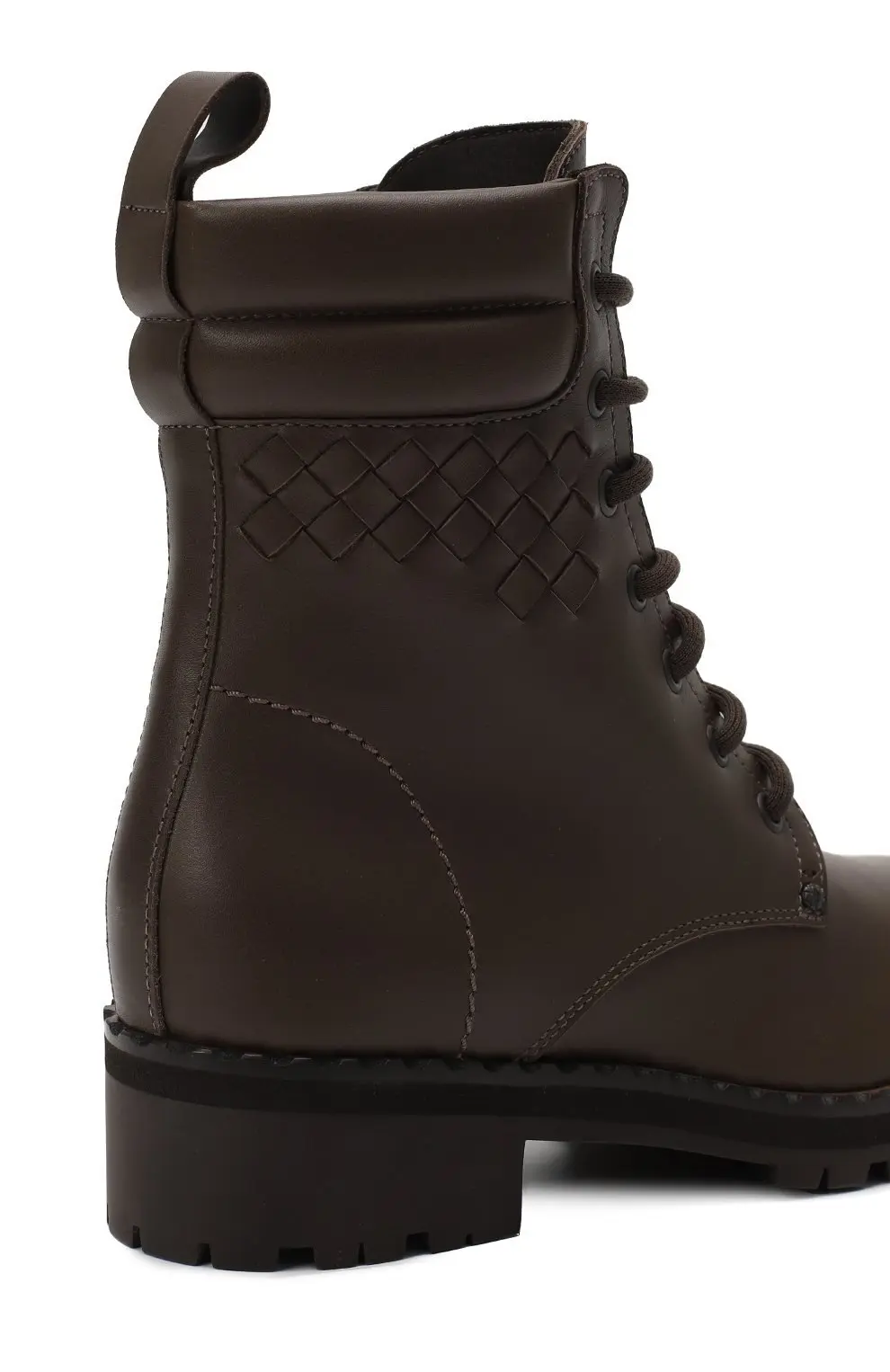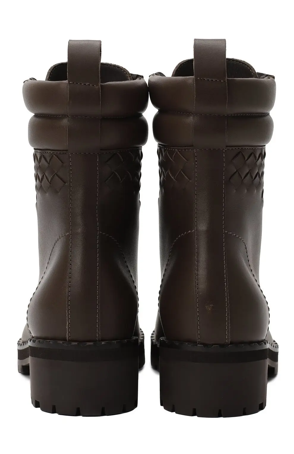 Ботинки Bottega Veneta сочетают в себе минималистичный дизайн и фирменные акценты бренда. Модель выполнена из гладкой кожи с акцентом на культовом плетении intrecciato в области голенища. Шнуровка обеспечивает надёжную фиксацию, а массивная рифлёная подошва добавляет устойчивости и комфорта при носке. Стильное решение для повседневного гардероба с акцентом на современную элегантность.