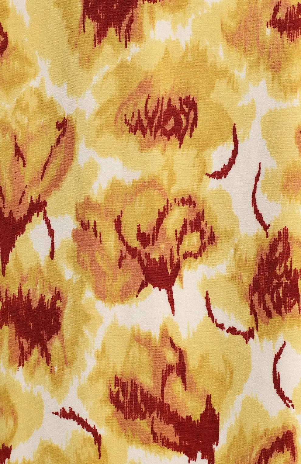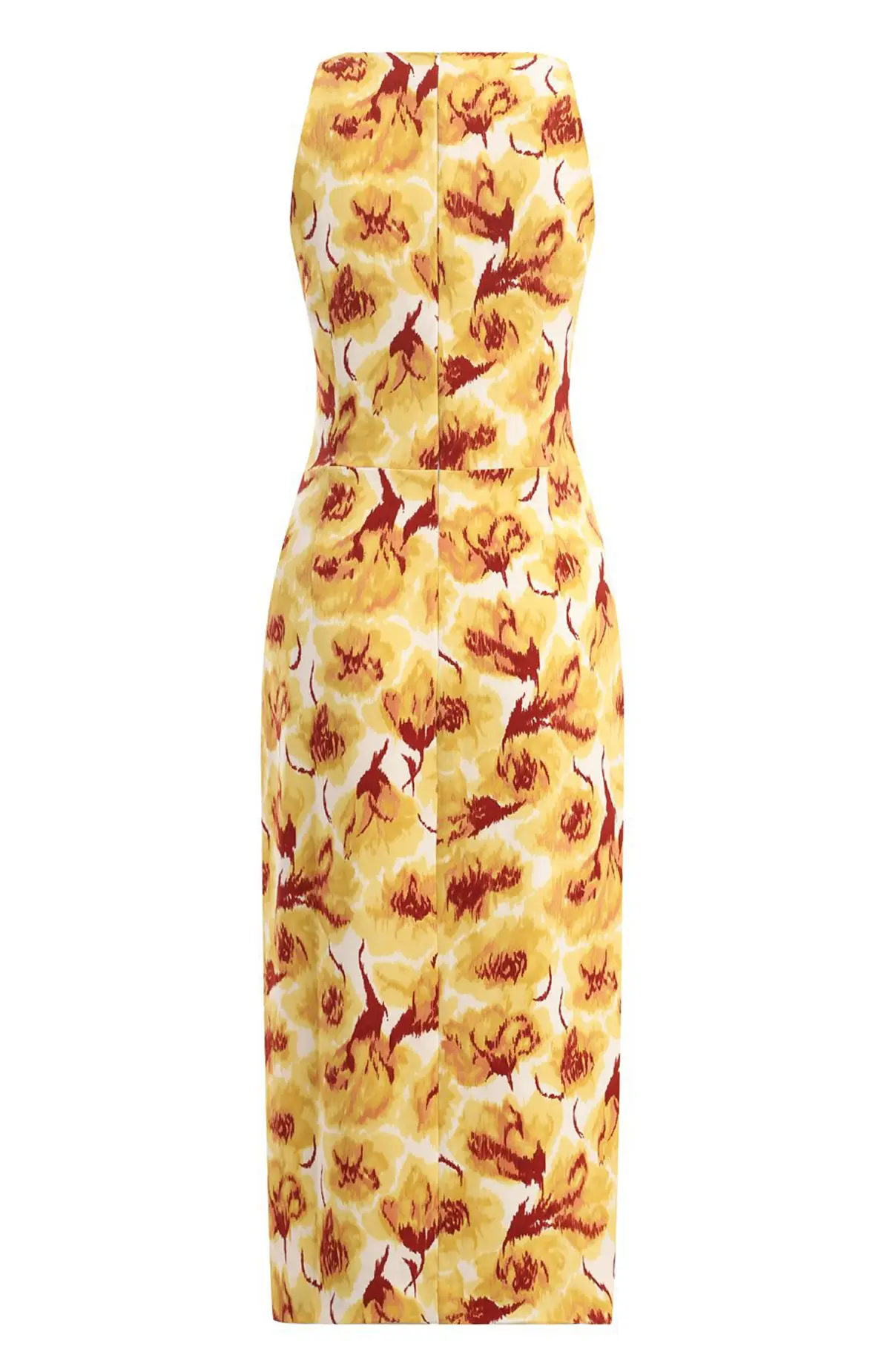 Платье Bottega Veneta выполнено из лёгкой ткани с ярким абстрактным цветочным принтом в жёлто-оранжевой гамме. Приталенный силуэт подчёркивает фигуру, а лаконичный крой без рукавов придаёт модели современную элегантность. Идеально подойдёт для летних мероприятий и дневных выходов в свет.