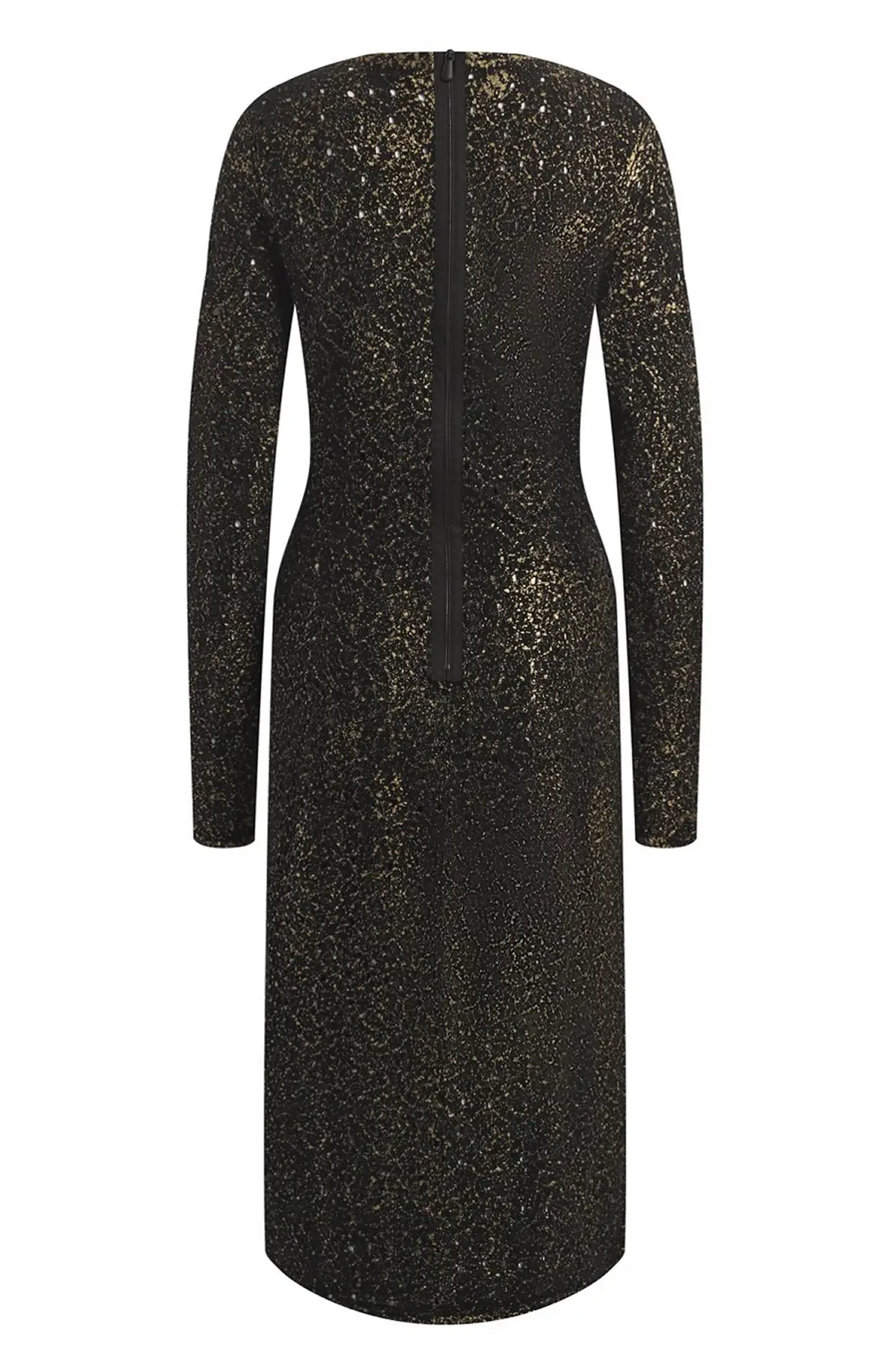 Шерстяное платье Bottega Veneta выполнено из мягкой ткани с золотистым напылением, создающим эффект благородного мерцания. Приталенный силуэт с длинными рукавами подчёркивает элегантность и сдержанную роскошь модели. Идеально подходит для вечерних выходов и особых случаев.
