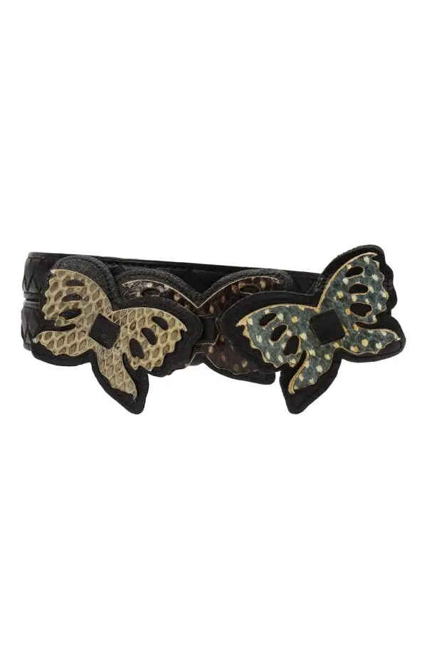 Ремень от Bottega Veneta выполнен из мягкой кожи, украшенной фирменным плетением intrecciato. Акцент сделан на декоративные бабочки из экзотической кожи с контрастными текстурами и оттенками — бежевым, коричневым и голубым. Оригинальный дизайн превращает аксессуар в арт-объект, подчёркивающий индивидуальность и творческий стиль обладателя.