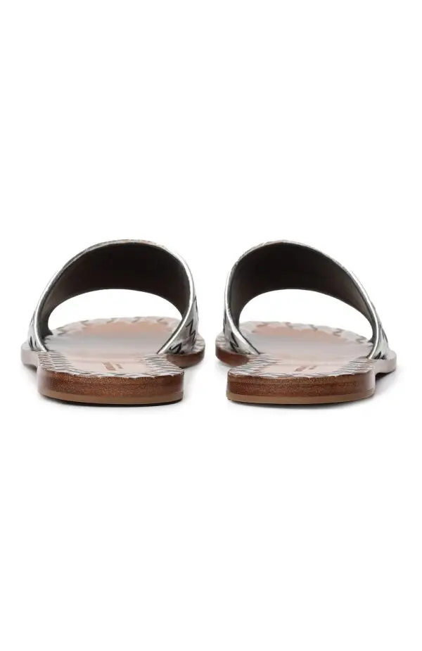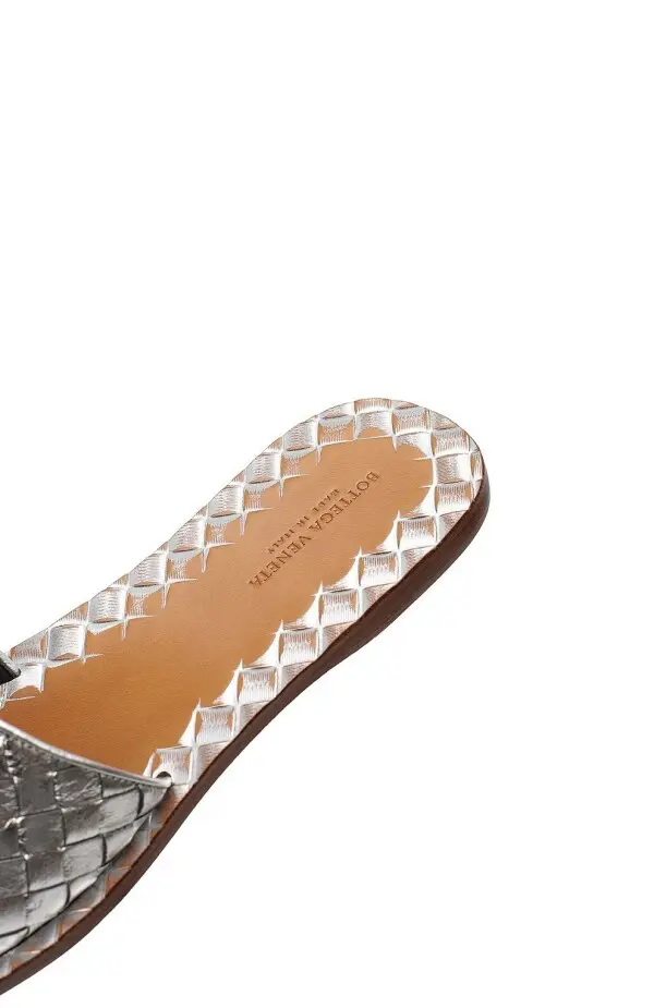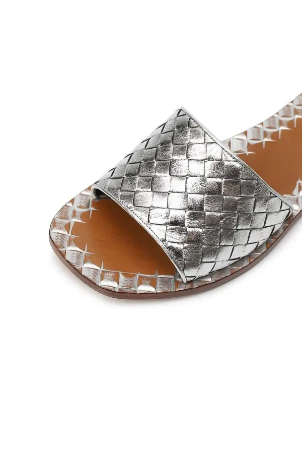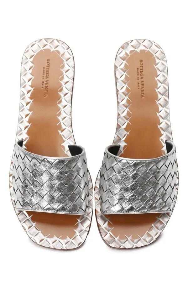 Женские сандалии от Bottega Veneta выполнены в фирменной технике intrecciato из серебристой металлизированной кожи, которая придаёт модели современный и роскошный вид. Лаконичный силуэт с открытым носком и плоской кожаной подошвой делает их универсальным выбором как для городских образов, так и для курортного стиля. Стильное сочетание блеска и классического плетения подчёркивает мастерство бренда и превращает эти сандалии в изысканный акцент летнего гардероба.