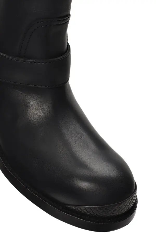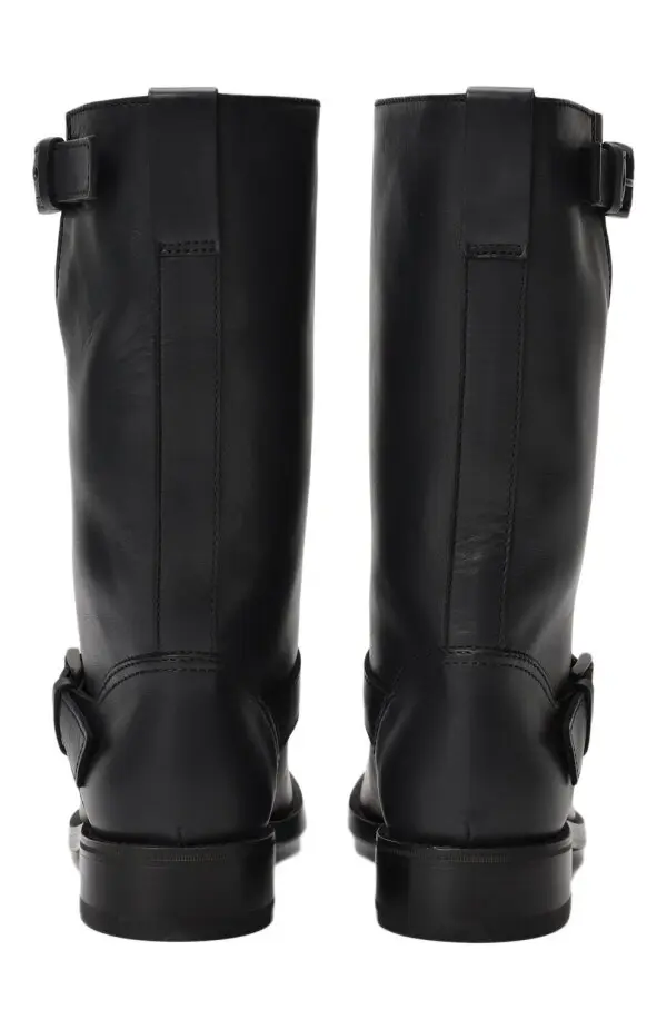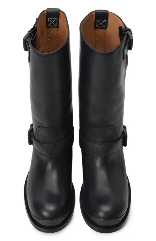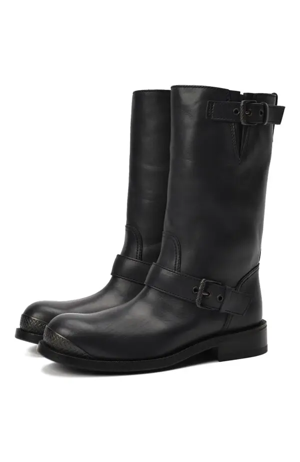 Эти сапоги Bottega Veneta выполнены из гладкой чёрной кожи и сочетают в себе лаконичный силуэт с элементами байкерского стиля. Декоративные ремешки с металлическими пряжками и фактурная отделка носка добавляют им характер и брутальность. Прямая форма голенища делает модель универсальной и удобной для повседневной носки, а высокое качество исполнения подчёркивает премиальный статус бренда.