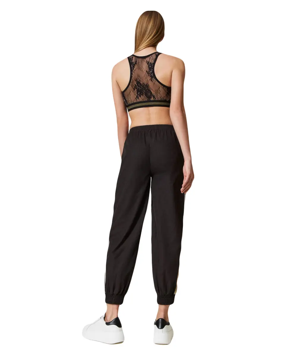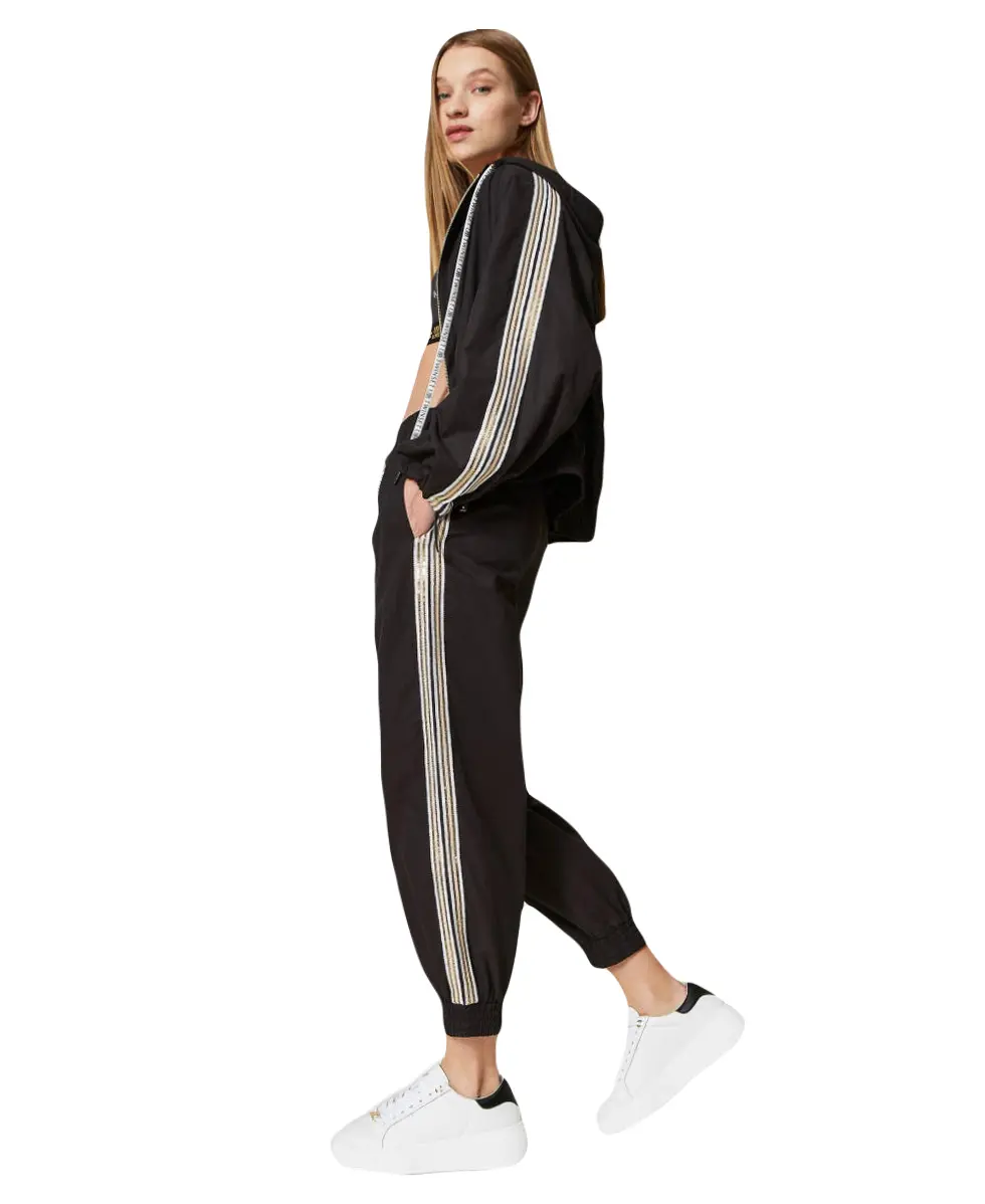 Черные джоггеры из смесового хлопка TWINSET из коллекции Sport. Модель имеет вышивку из пайеток на тюлевых полосках. Брюки отлично подойдут для бега или расслабленных походных образов. Сочетайте с курткой TWINSET в тон из той же коллекции.