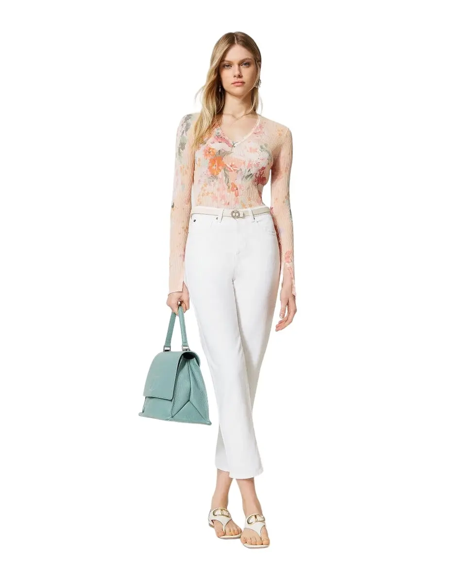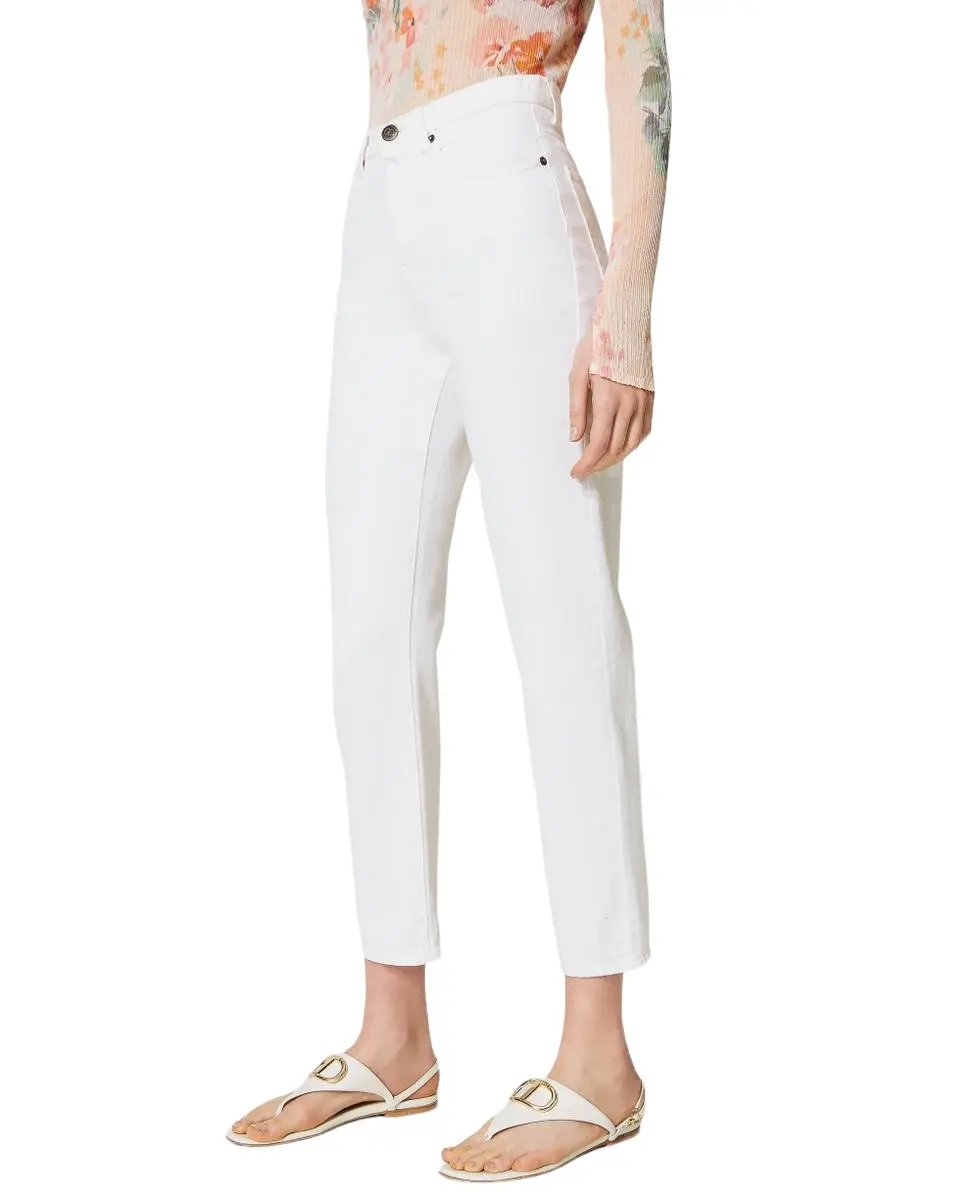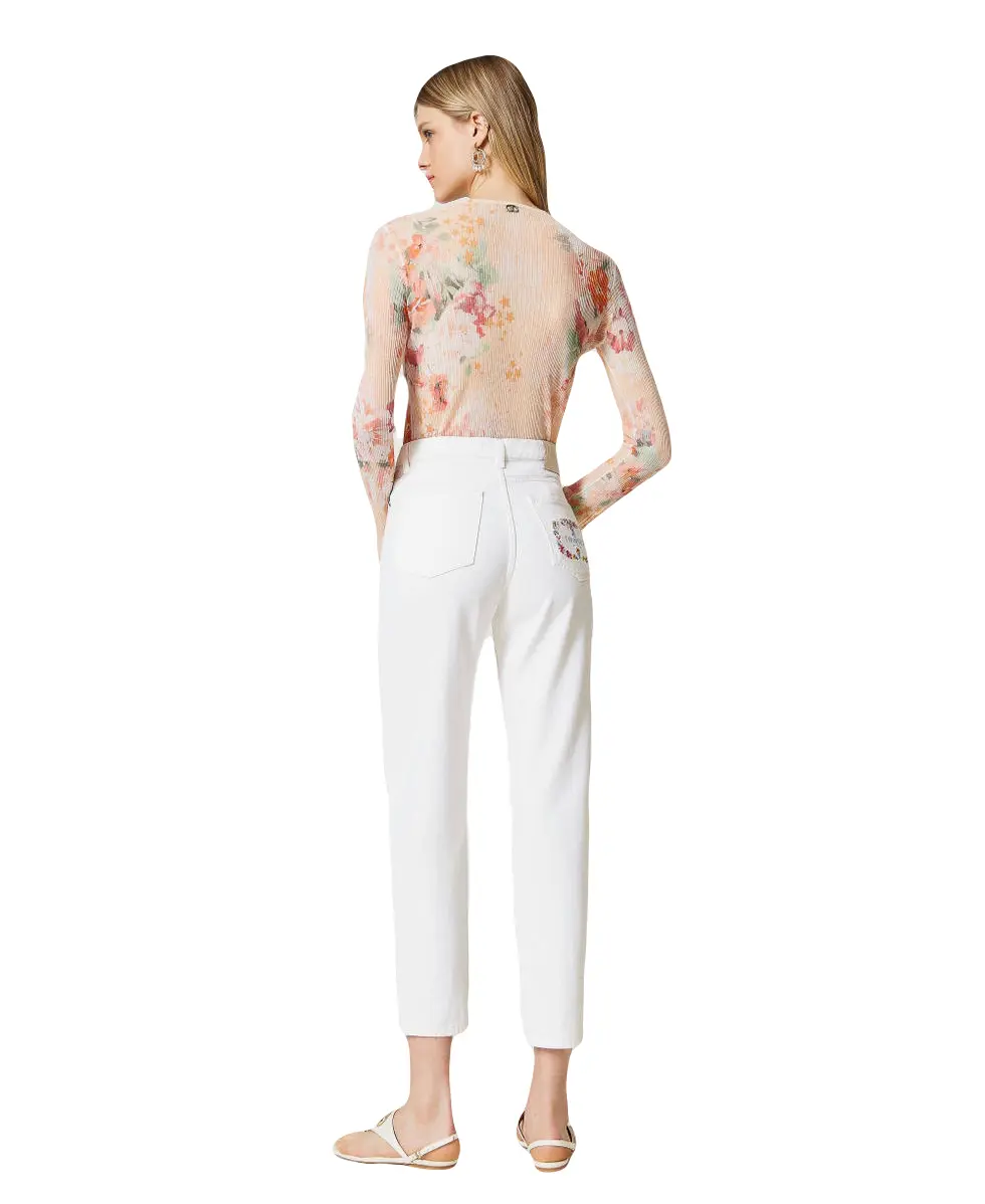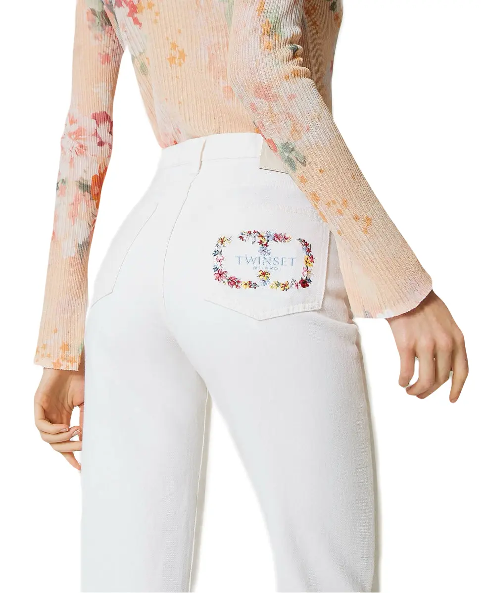 Джинсы TWINSET узкого кроя - идеальная основа для вашего городского образа. Выбирайте эти облегающие хлопковые брюки, украшенные цветочной вышивкой сзади. Изделие имеет петли для ремня, пять карманов, пуговицу и заклепки с логотипом. После стирки становятся мягкими. Сочетайте их с футболкой с цветочным принтом из коллекции TWINSET.