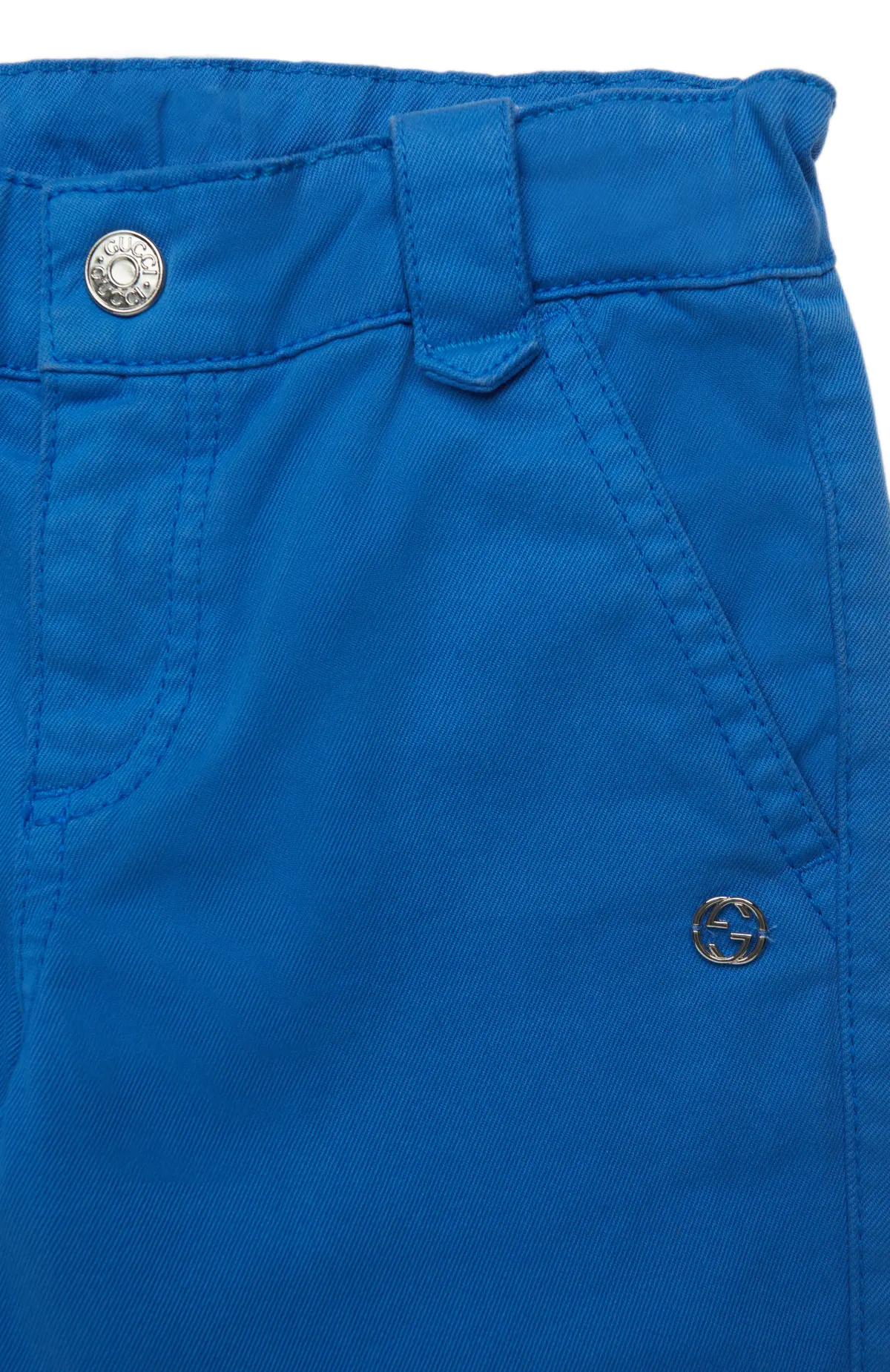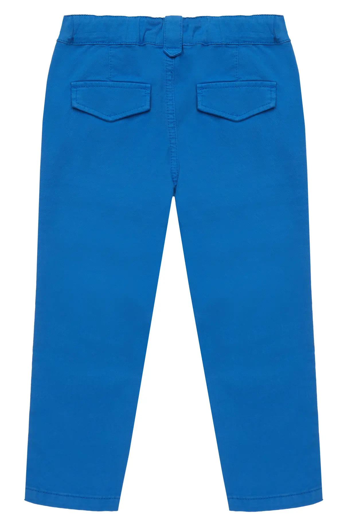 Брюки выполнены из плотного хлопкового твила с гладкой фактурой, который мягко держит форму и обеспечивает комфортное прилегание. Модель отличается прямым кроем и лаконичным силуэтом, дополненным аккуратными прорезными карманами. Насыщенный голубой оттенок делает образ выразительным и свежим.