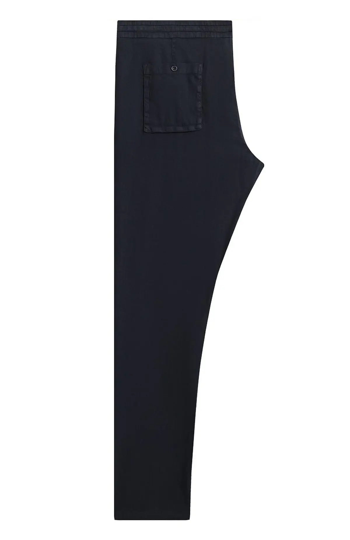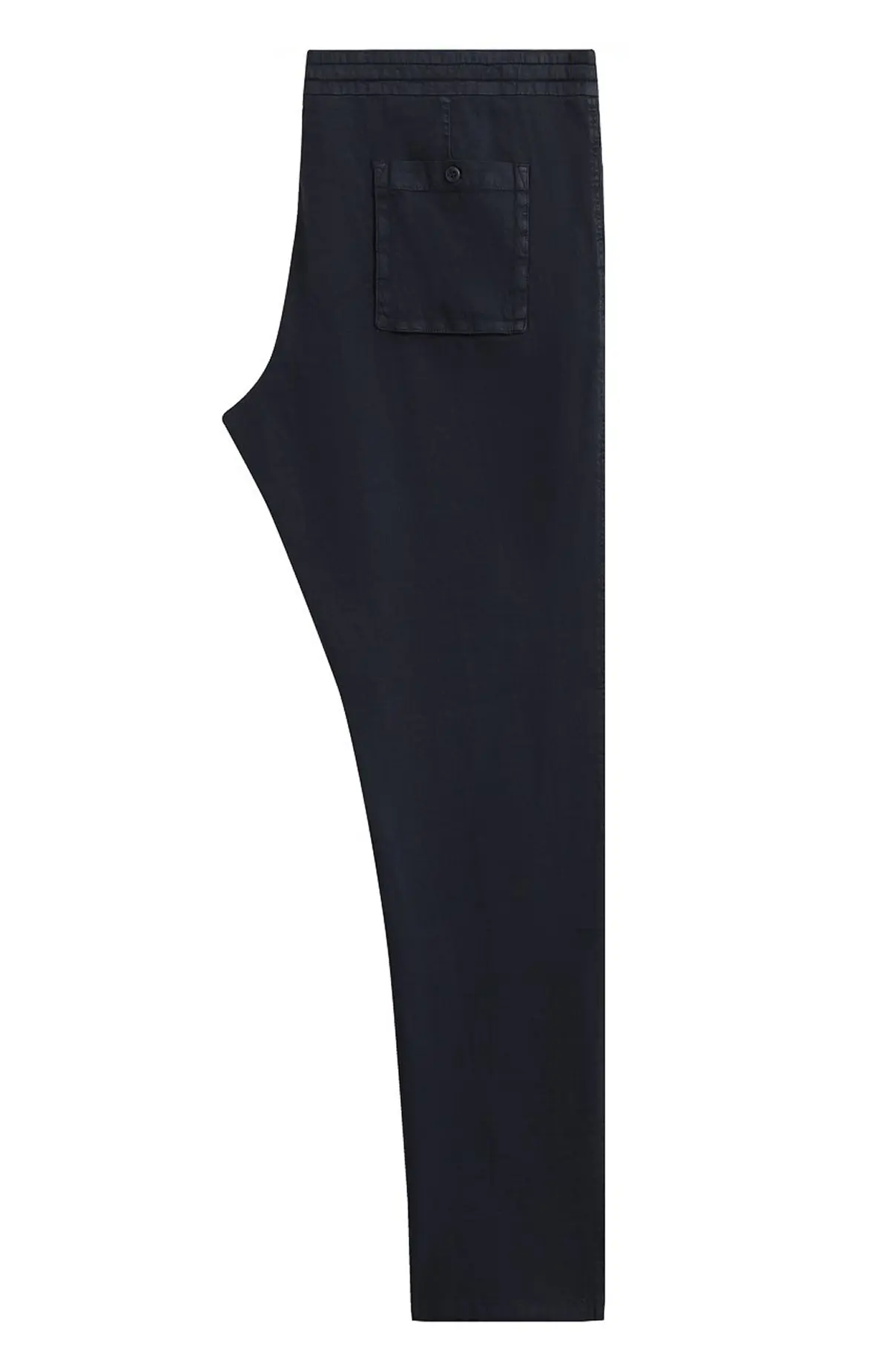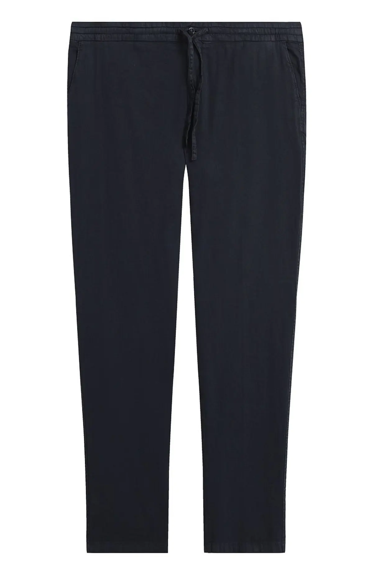 Брюки Loro Piana выполнены из лёгкой смеси льна и хлопка, что обеспечивает комфорт и воздухопроницаемость в тёплую погоду. Модель прямого кроя дополнена эластичным поясом на кулиске, создающим расслабленный силуэт. Лаконичный дизайн и глубокий тёмно-синий оттенок делают эти брюки универсальным элементом летнего гардероба.