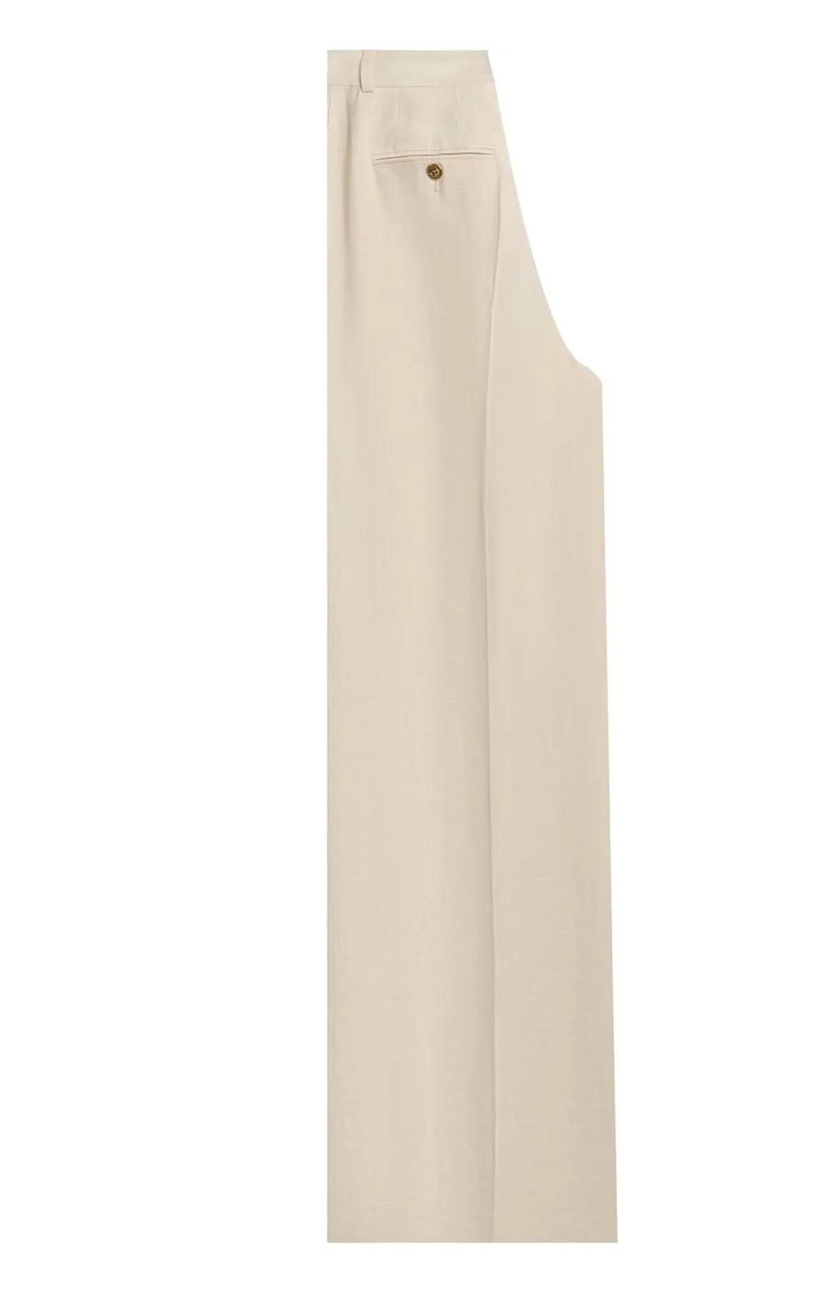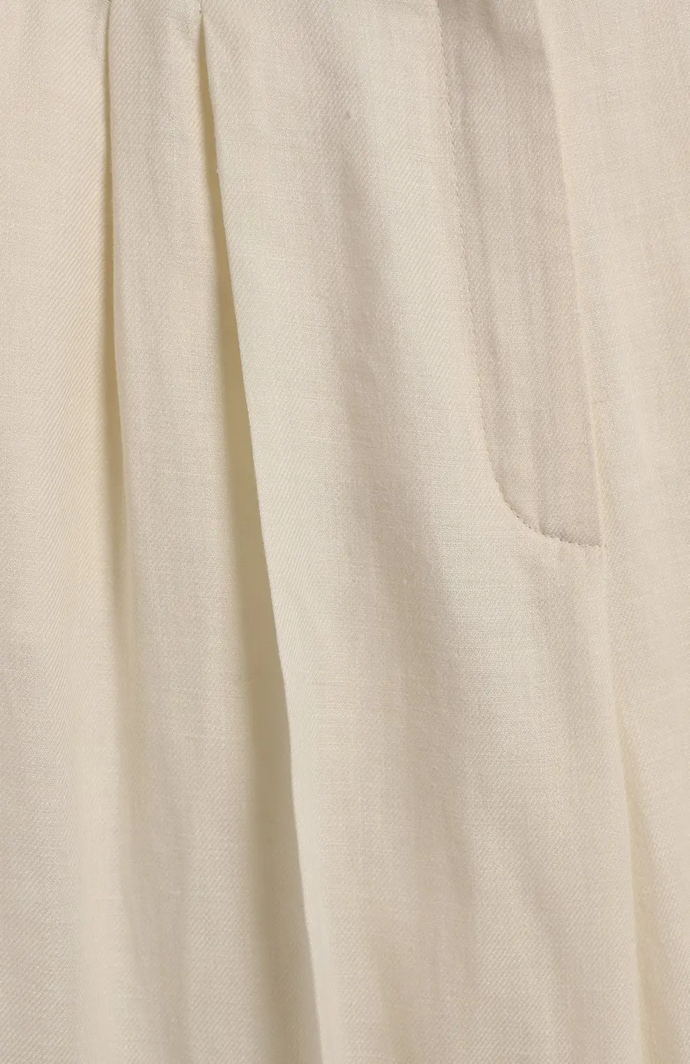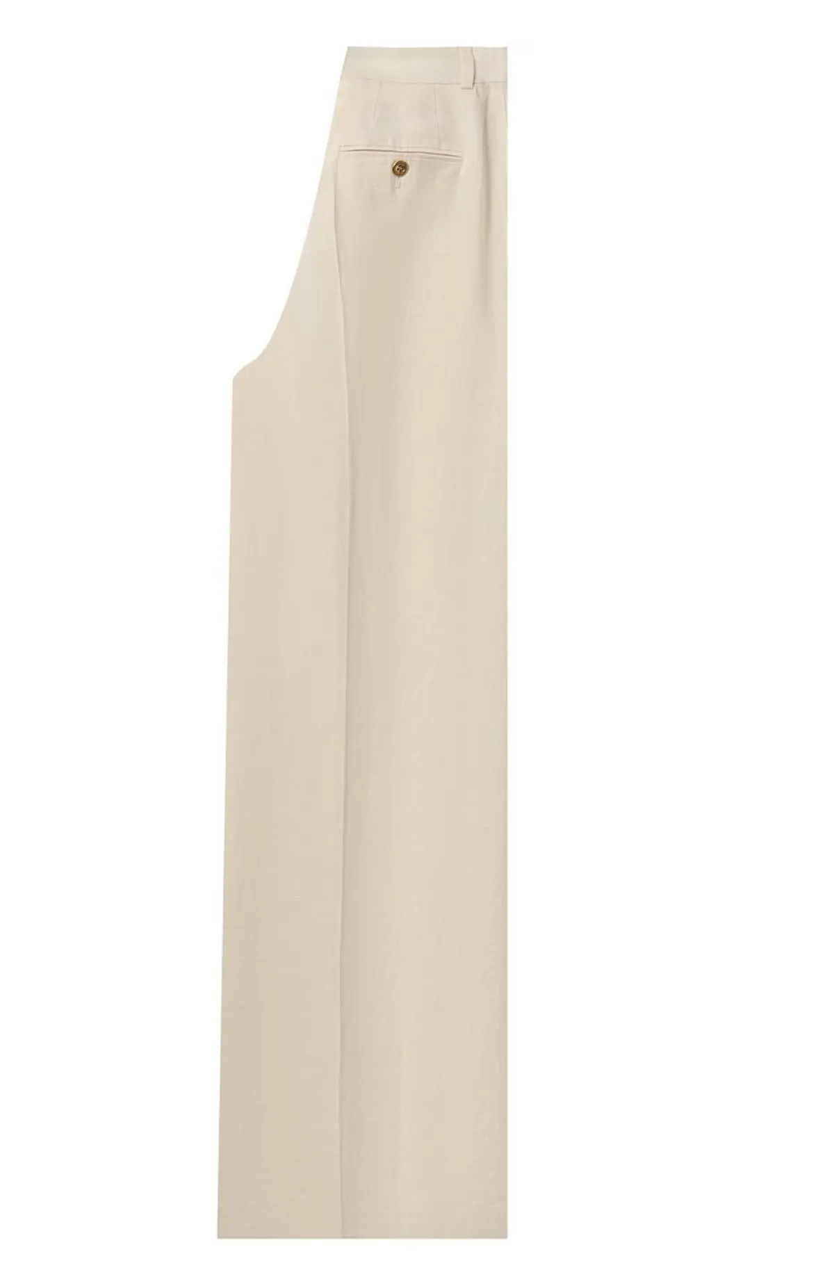 Брюки широкого кроя выполнены из смеси льна и шерсти. Лёгкий материал с матовой фактурой обеспечивает естественную посадку и комфорт в течение дня. Мягкие складки спереди формируют свободный силуэт, подчёркивая элегантную простоту модели.