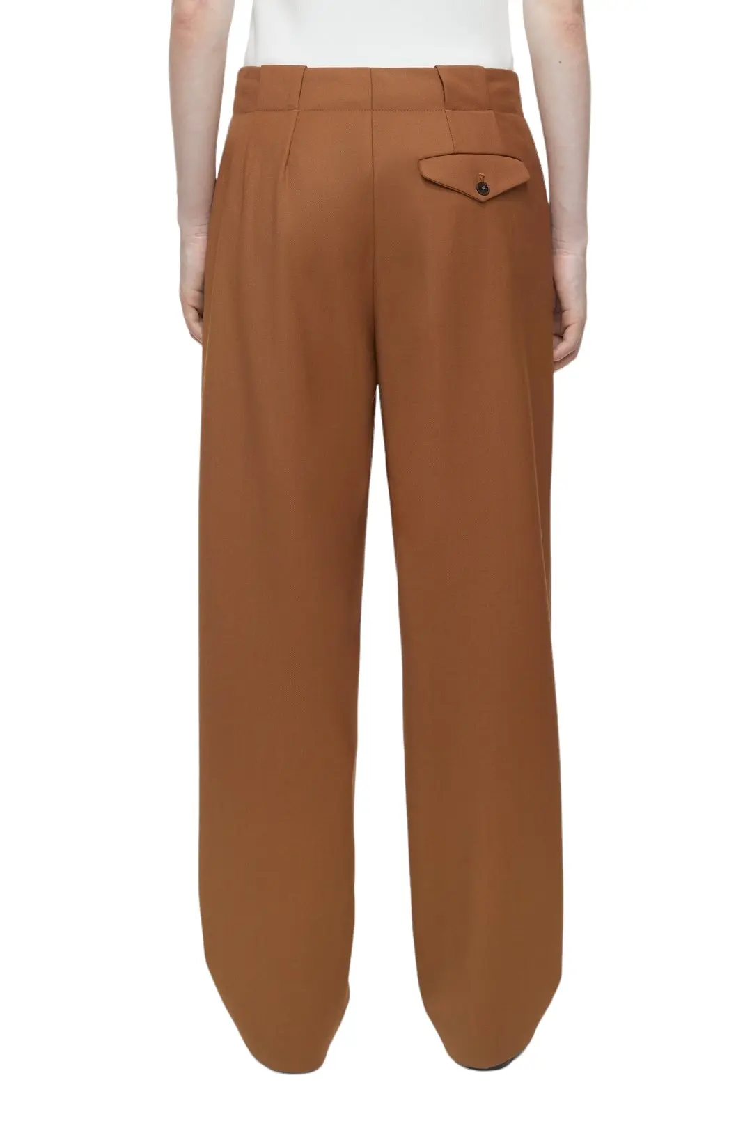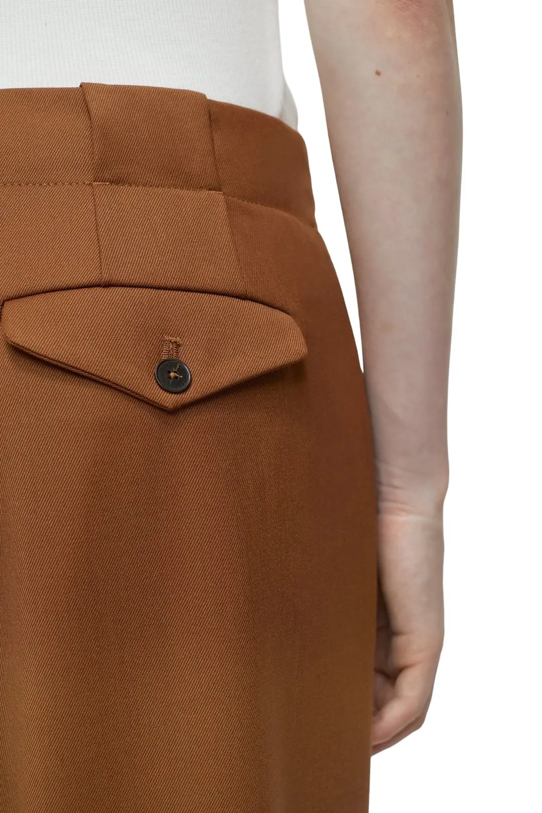 Брюки Closed изготовлены из плотного твила с аккуратным внешним видом и окрашенной пряжи с добавлением натуральной шерсти и эластана. У модели свободный крой со складками, застежка на пуговицы со смещением по бокам. Также для функциональности есть карманы с клапанами на пуговицах сбоку и сзади. Можно носить изделие как костюм с жакетом в тон.