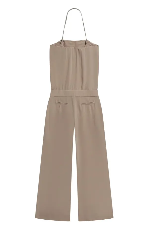 Комбинезон выполнен из гладкого шёлка нюдового оттенка, мягко драпирующегося и создающего текучий силуэт. Тонкие бретели и прямой верх подчёркивают открытые плечи, а кулиска на талии с завязками обеспечивает комфортное прилегание. Штанины свободного кроя слегка расширяются к низу, придавая образу лёгкость и ненавязчивую элегантность.