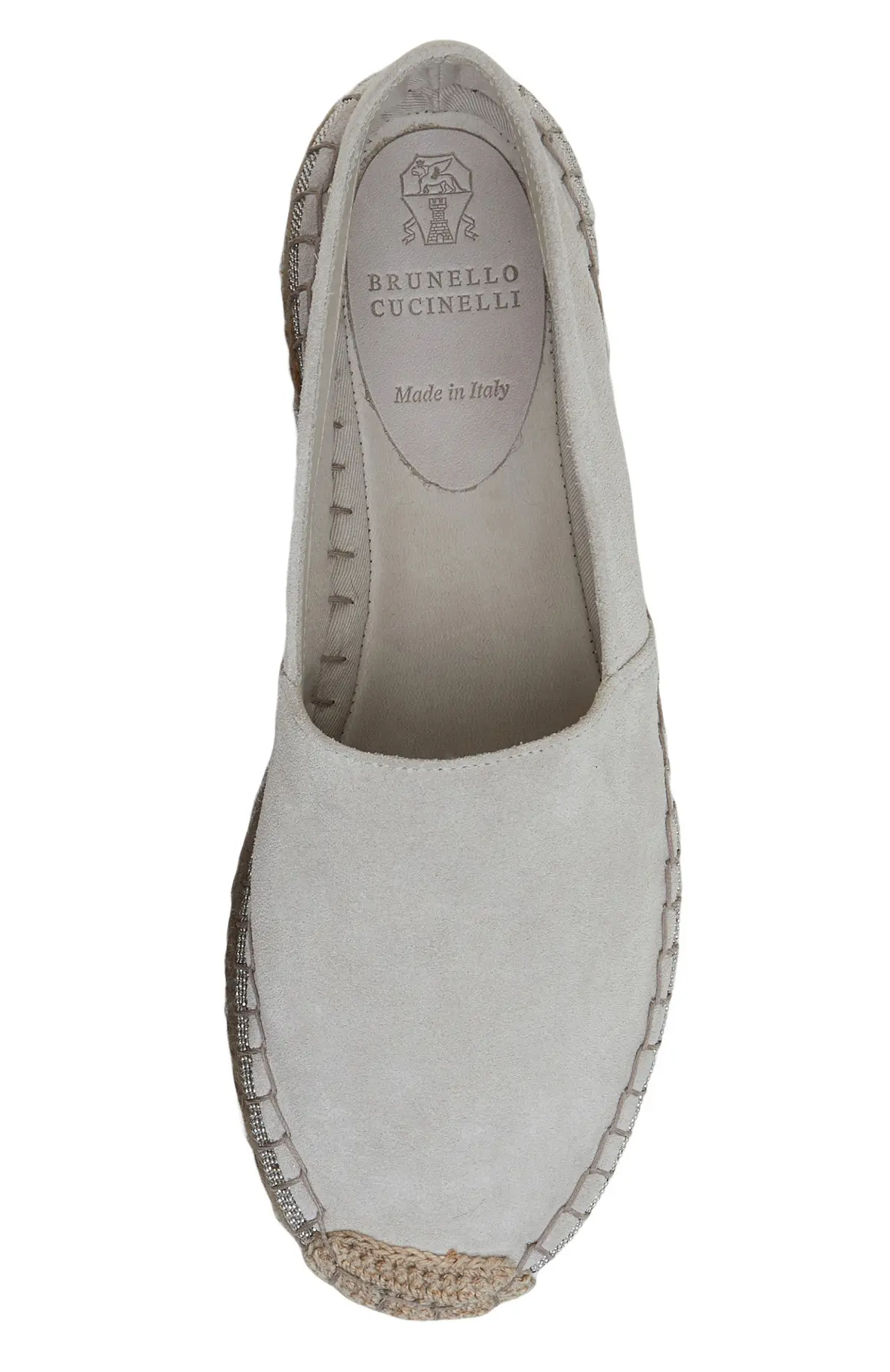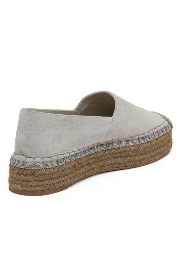 Слипоны выполнены из мягкой светло-серой замши и посажены на плетёную платформу из джута. Деликатная окантовка мелким металлическим декором подчёркивает чистые линии модели. Резиновый протектор добавляет практичности, кожаная подкладка обеспечивает комфортное прилегание.